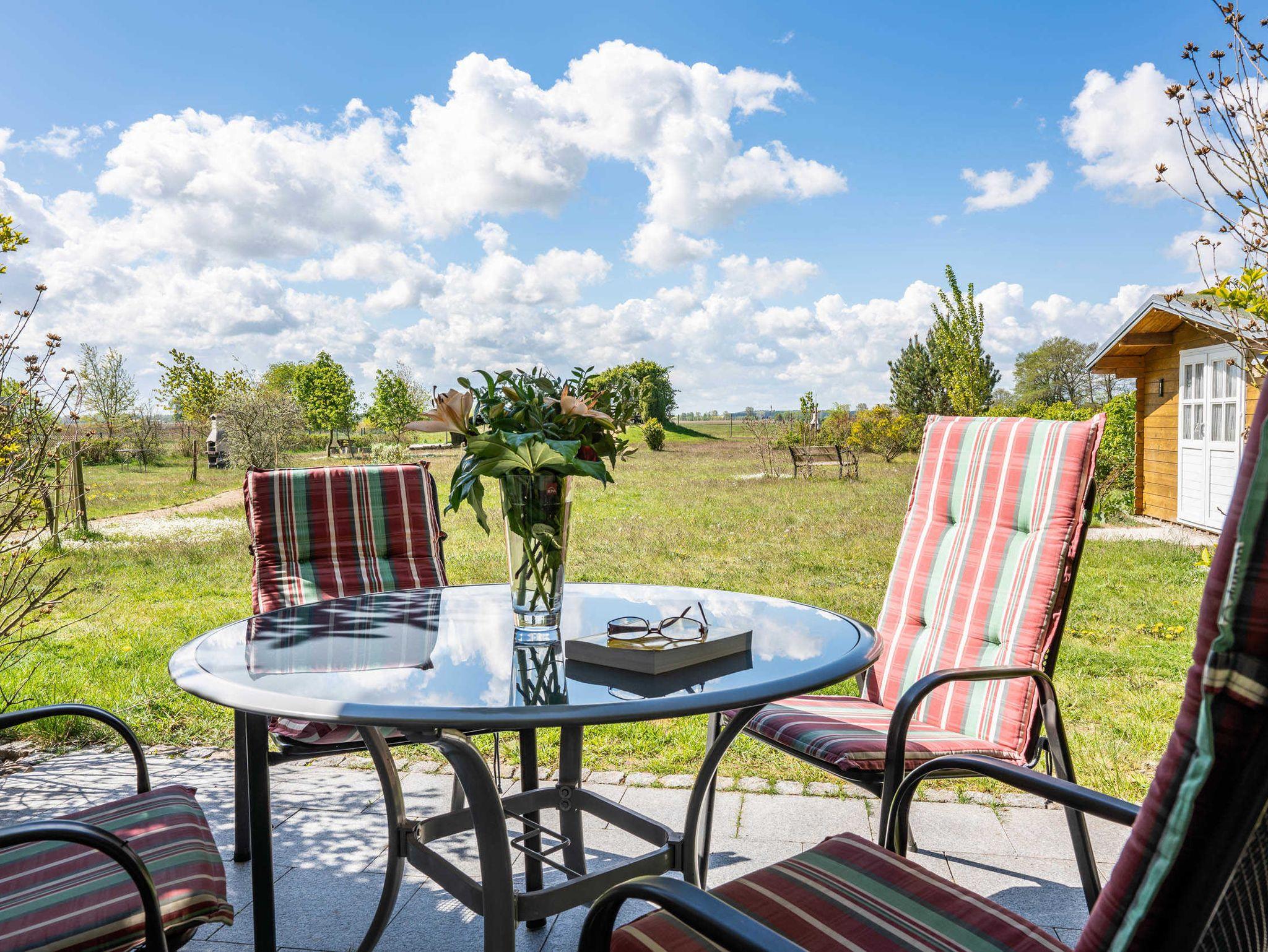 Von der großzügigen Terrasse aus hat man einen herrlichen Weitblick über den Garten und die Deichwiesen. Der Garten mit den Sitzplätzen, Wiese, Feuerstelle und Grillöfen kann genutzt werden.
