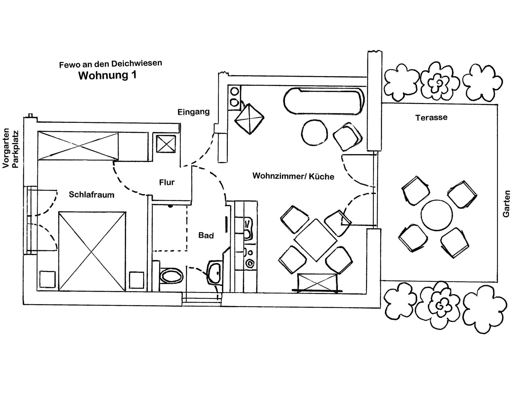 Die 2-Raum-Ferienwohnungen 01,02,05 und 06 befinden sich im Erdgeschoss und verfügen alle über eine Terrasse zum Garten.