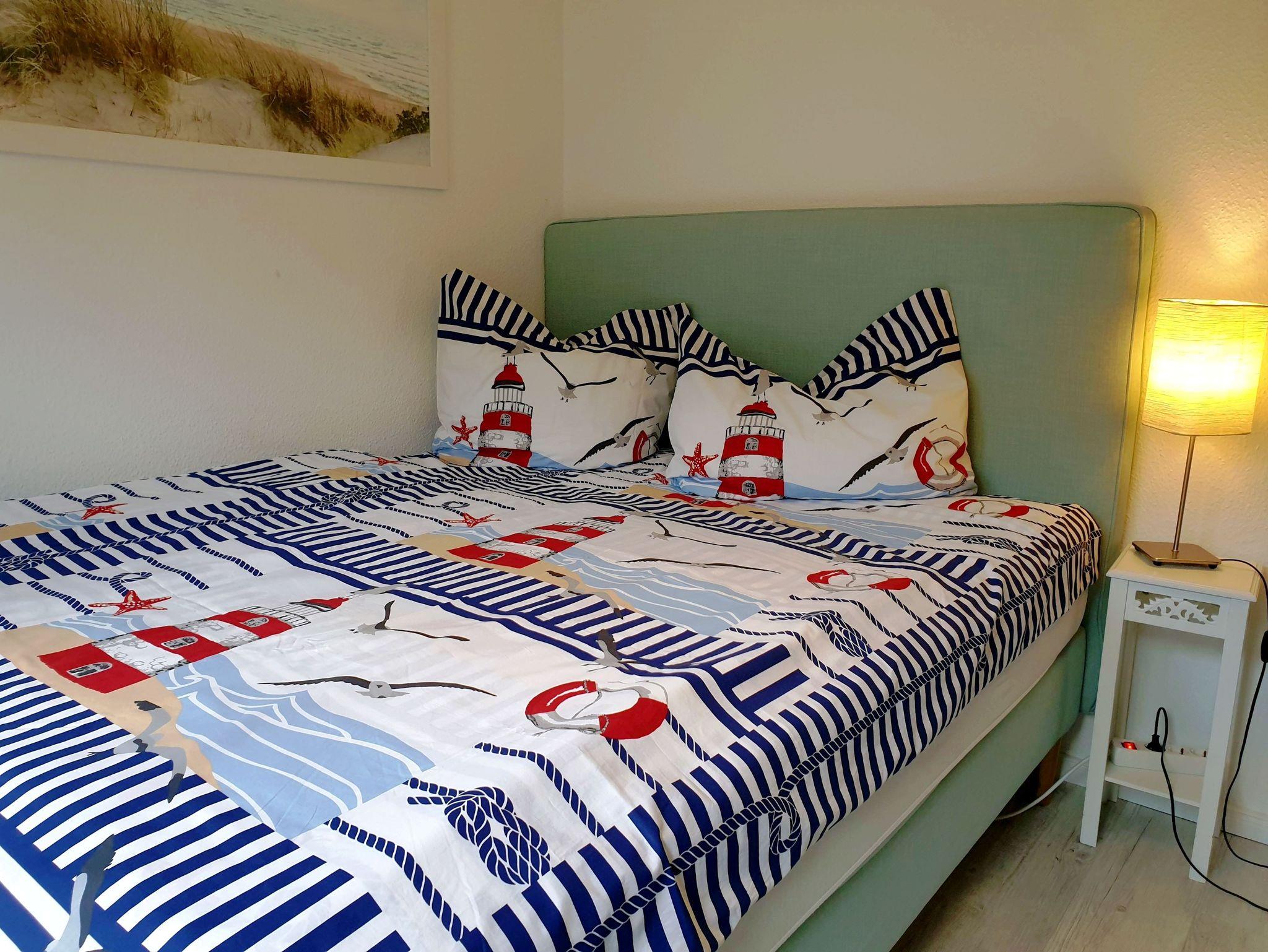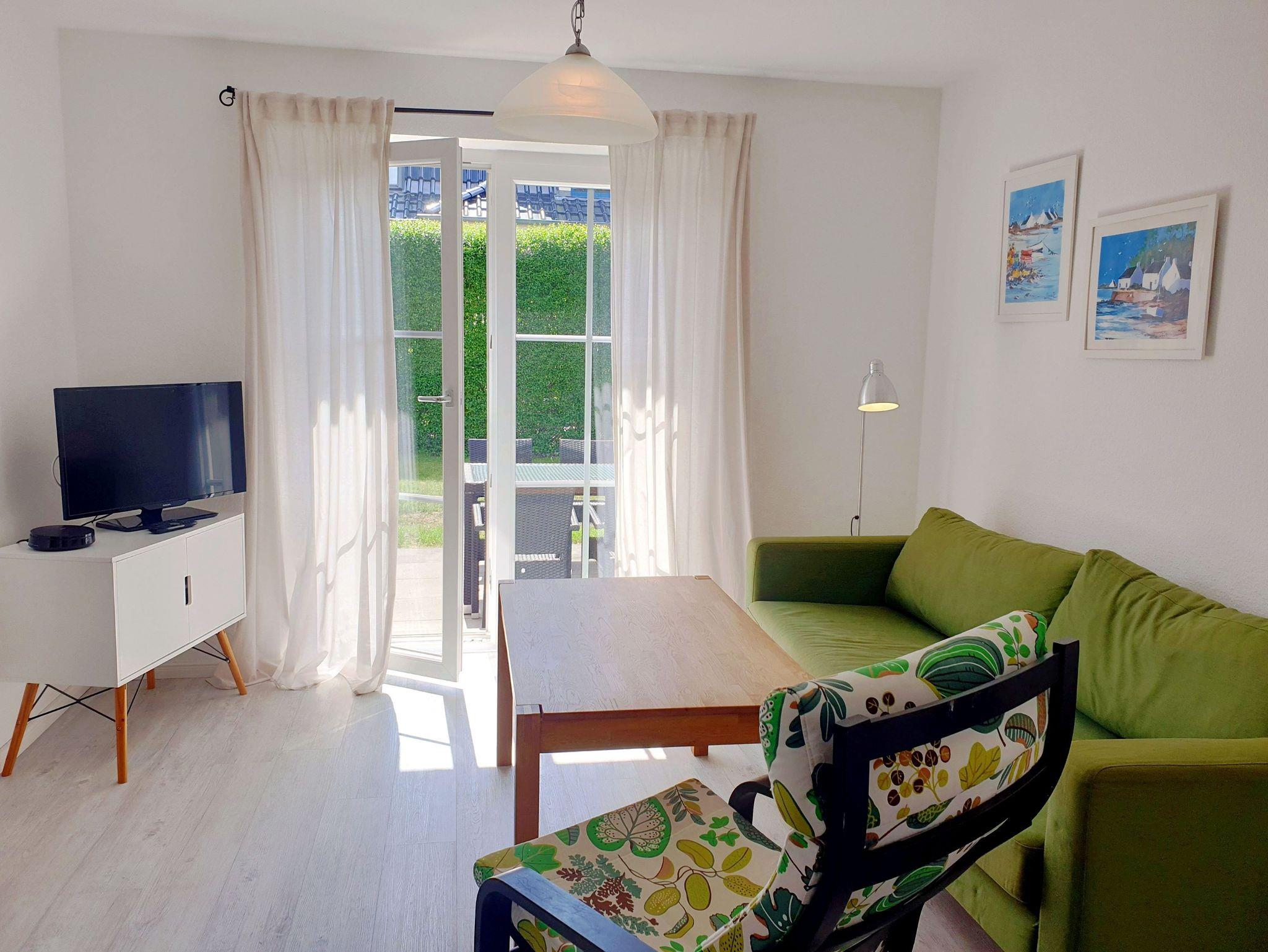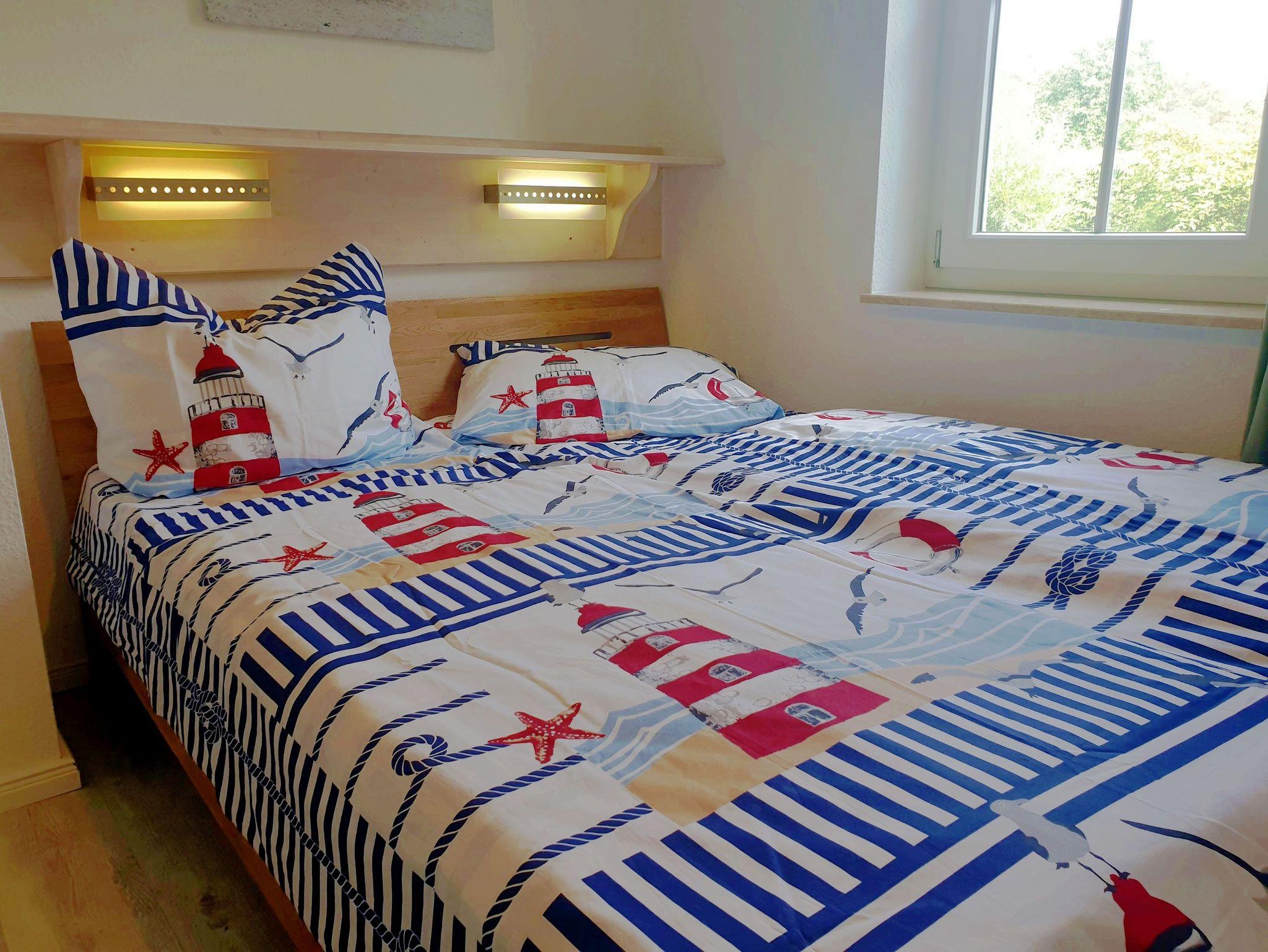 Die kleine Einbauküche im EG ist ausgestattet mit einem Kühlschrank mit integriertem Gefrierfach, einem 2-Platten Cerankochfeld natürlich auch mit Spüle, Toaster, Wasserkocher und Kaffeemaschine. Angrenzend befindet sich das maritime Badezimmer mit Dusche und WC. Das Schlafzimmer 1 verfügt über ein bequemes Boxspring-Doppelbett, natürlich auch mit einem Kleiderschrank. Das Schlafzimmer 2 verfügt über ein Doppelbett. Das Wohnzimmer ist mit einer gemütlichen Couchgarnitur ausgestattet. Hier finden Sie auch einen Flachbild-TV, einen DVD-Player mit einigen Filmen, ferner ein Radio. Über die breite Terrassentür gelangen Sie auf die Wiese bzw. erst auf die vorgelagerte nach Süd-West ausgerichtete Terrasse. Ein Platz für laue Sommerabende. auf der, mit bequemen Gartenmöbeln bestückten. Hier finden auch Ihre Kleinen ausreichenden Platz zum Spielen und Toben. Das Grundstück ist eingezäunt.