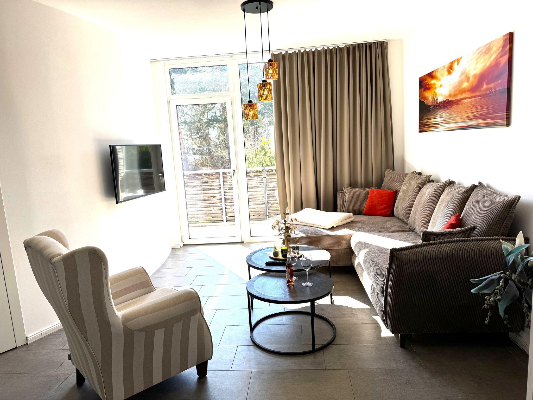 • Wohn-/ Essbereich mit Esstisch für 4 Personen, Schlafcouch, Couchtisch, Flachbildfernseher mit ca. 100cm Bilddiagonale und Blue-ray Player