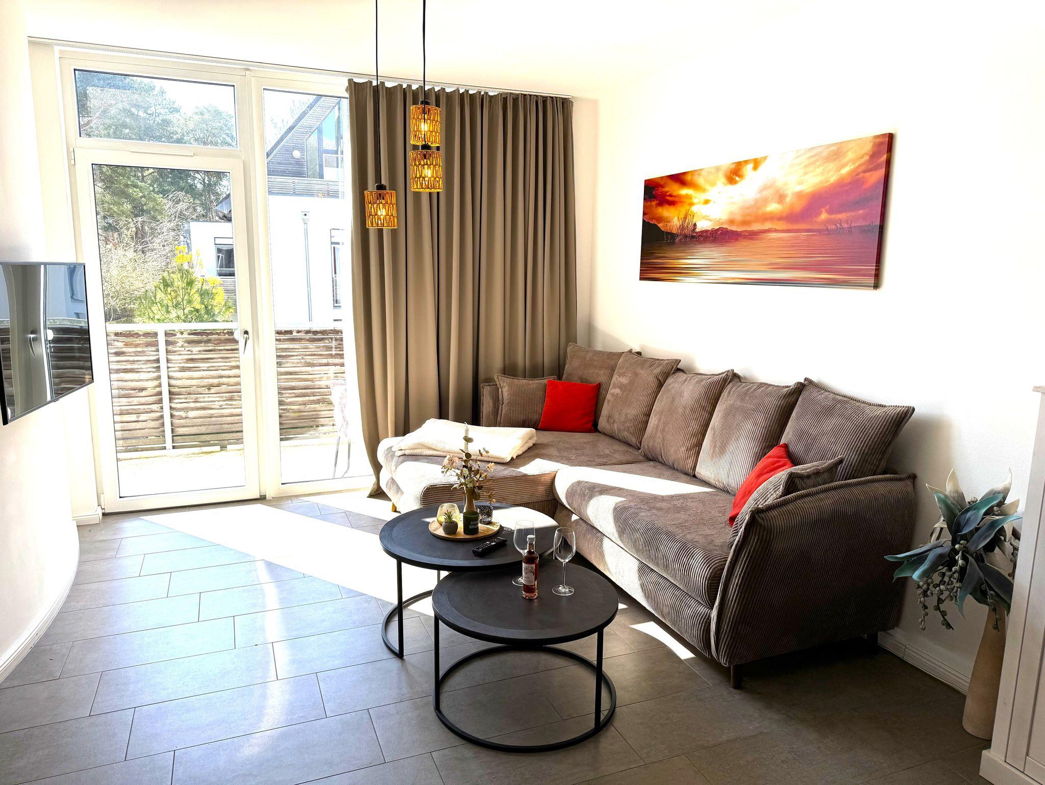 Exklusive Ferienwohnung mit einer Wohnfläche von ca. 62 m², hochwertig ausgestattet u. a. mit Verdunkelungsgardinen, Fußböden aus Feinsteinzeug auf der gesamten Wohnfläche, Fußbodenheizung, Nichtraucherwohnung, sep. Eingangsbereich, Waschmaschine und Internet-WLAN.