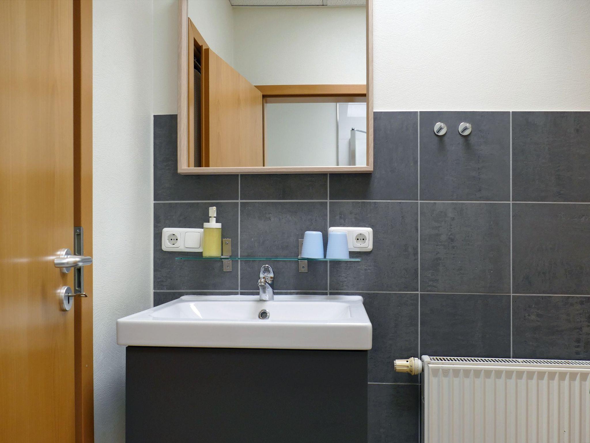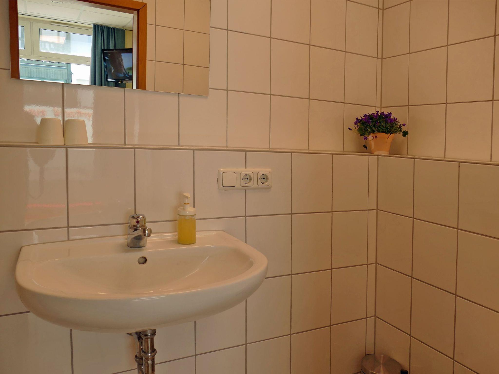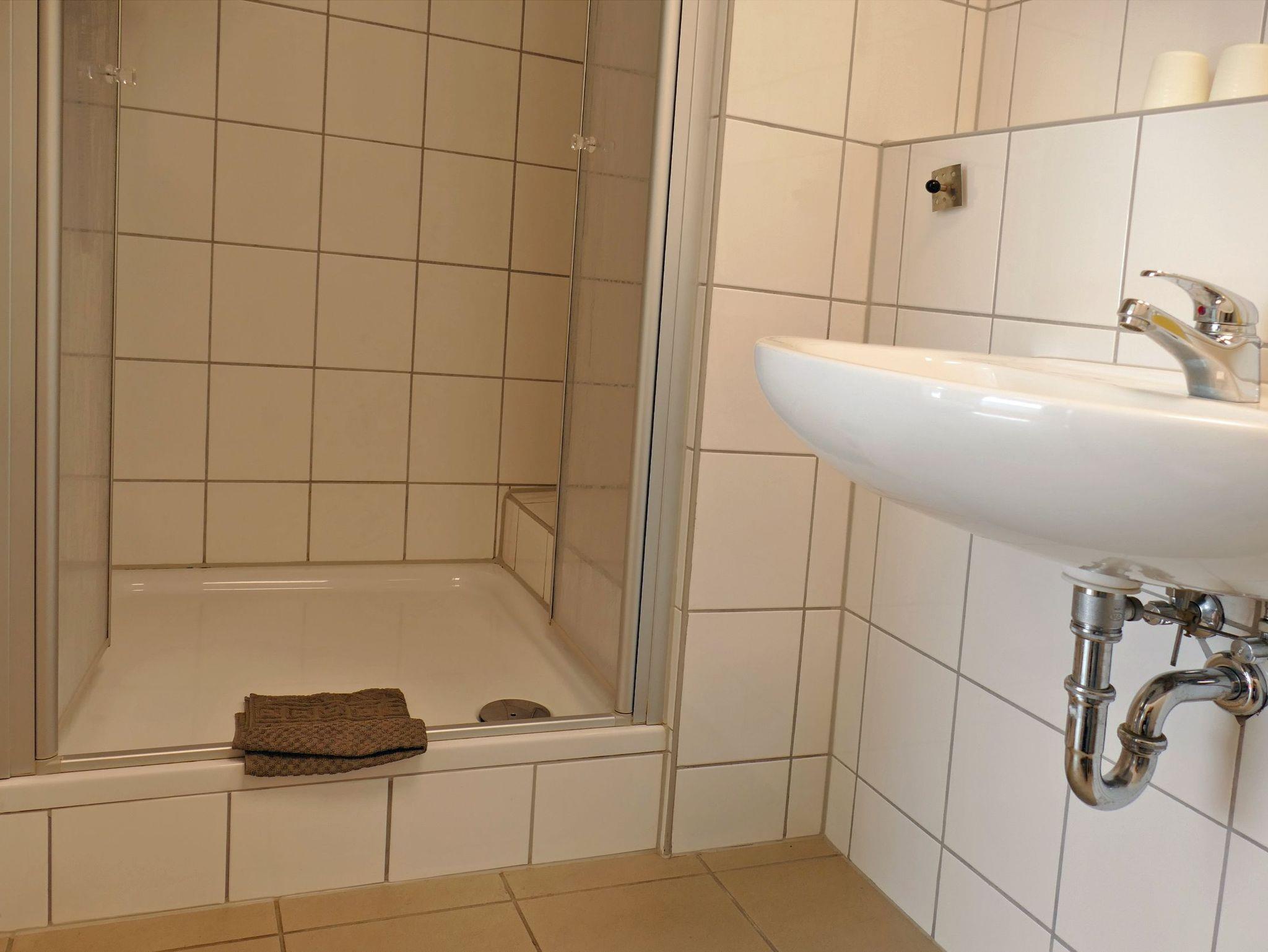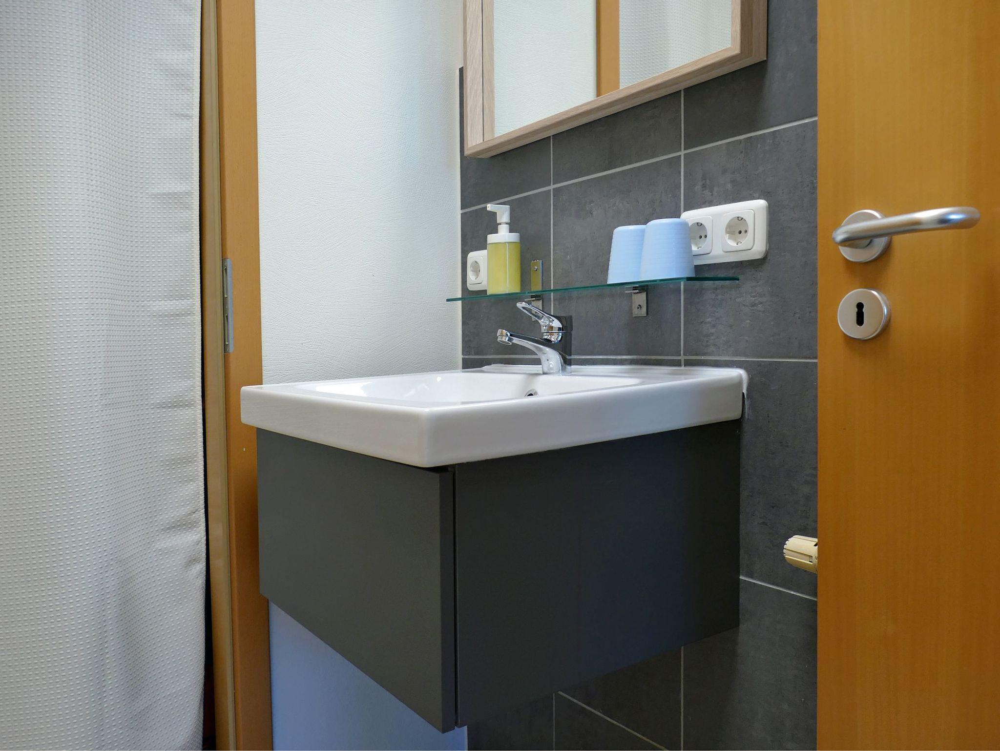 Im Bad befindet sich ein Waschtisch und abgeschlossen davon eine Dusche und WC.