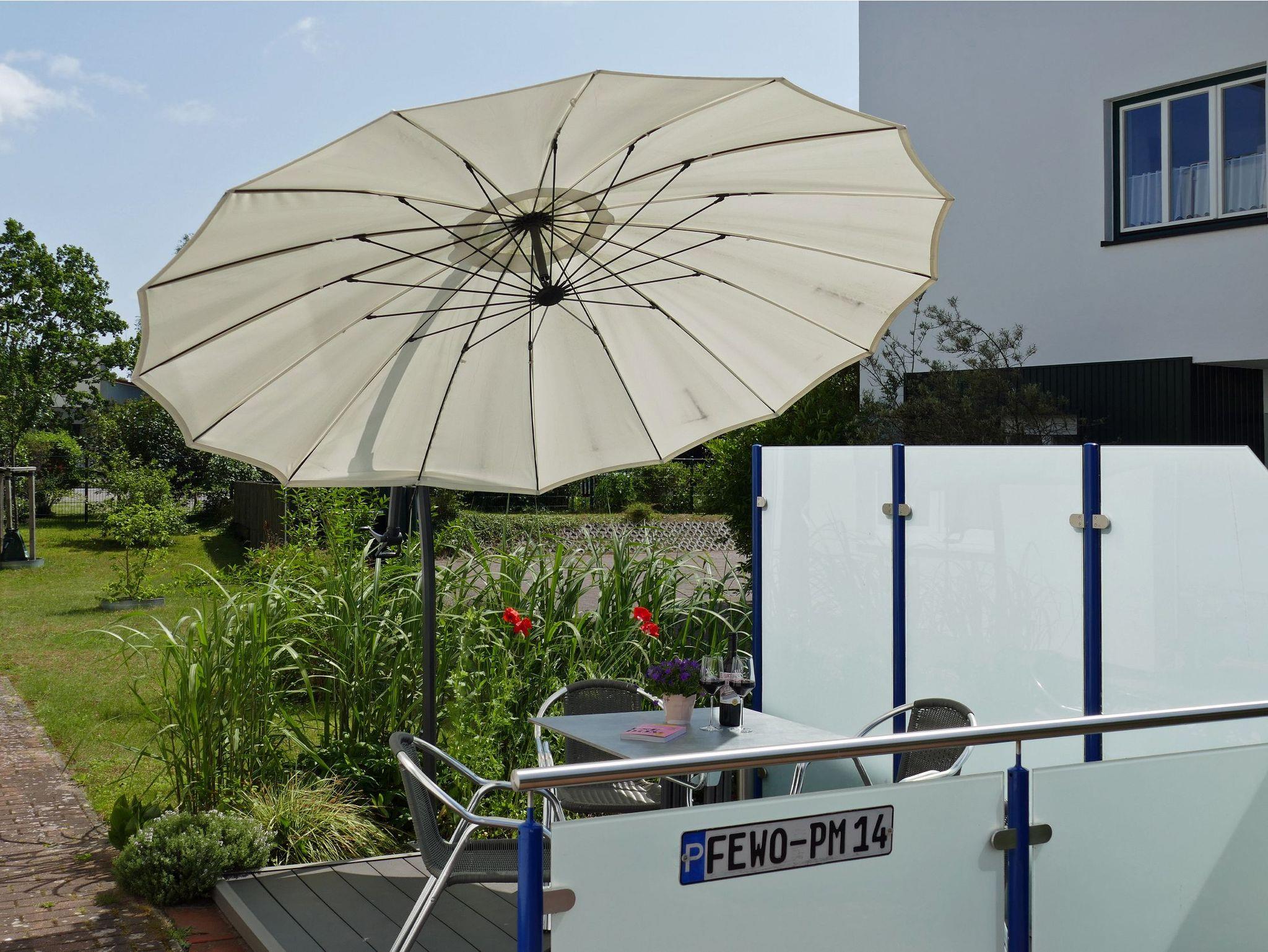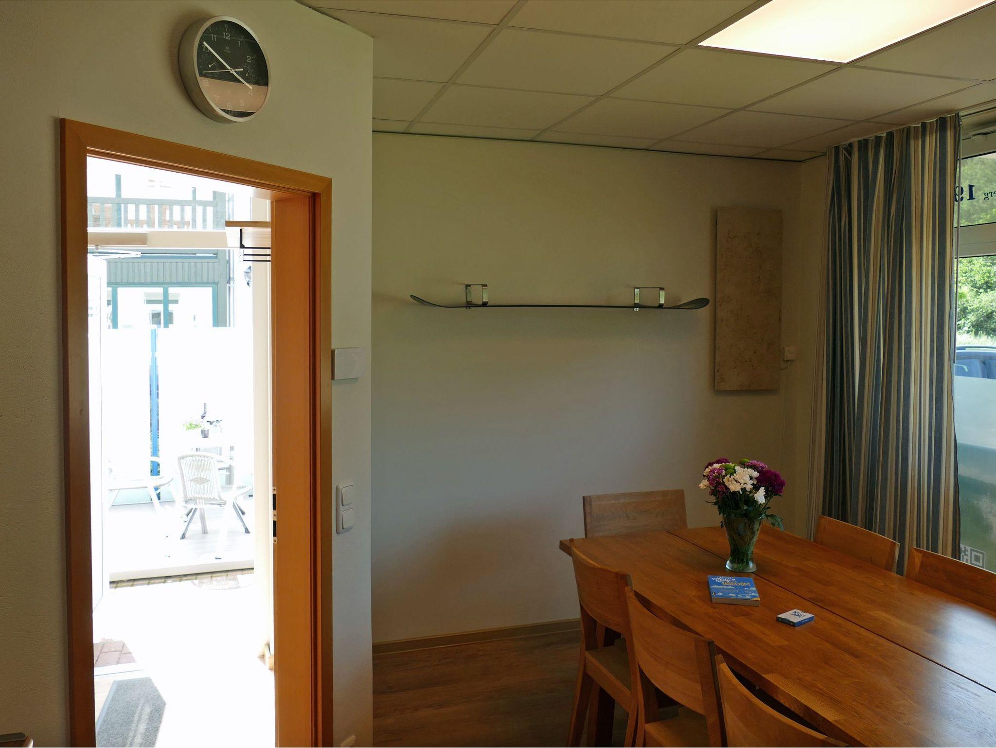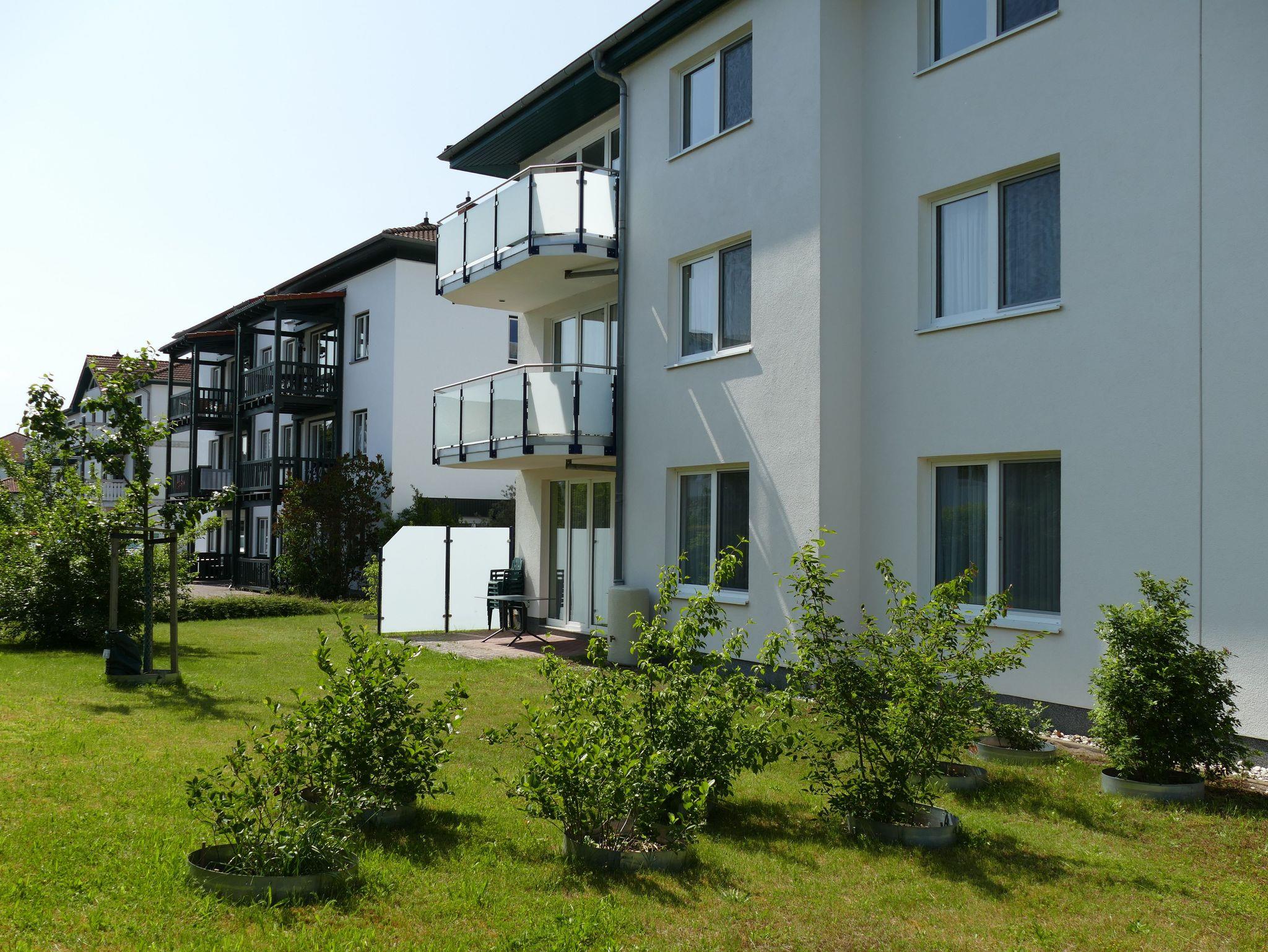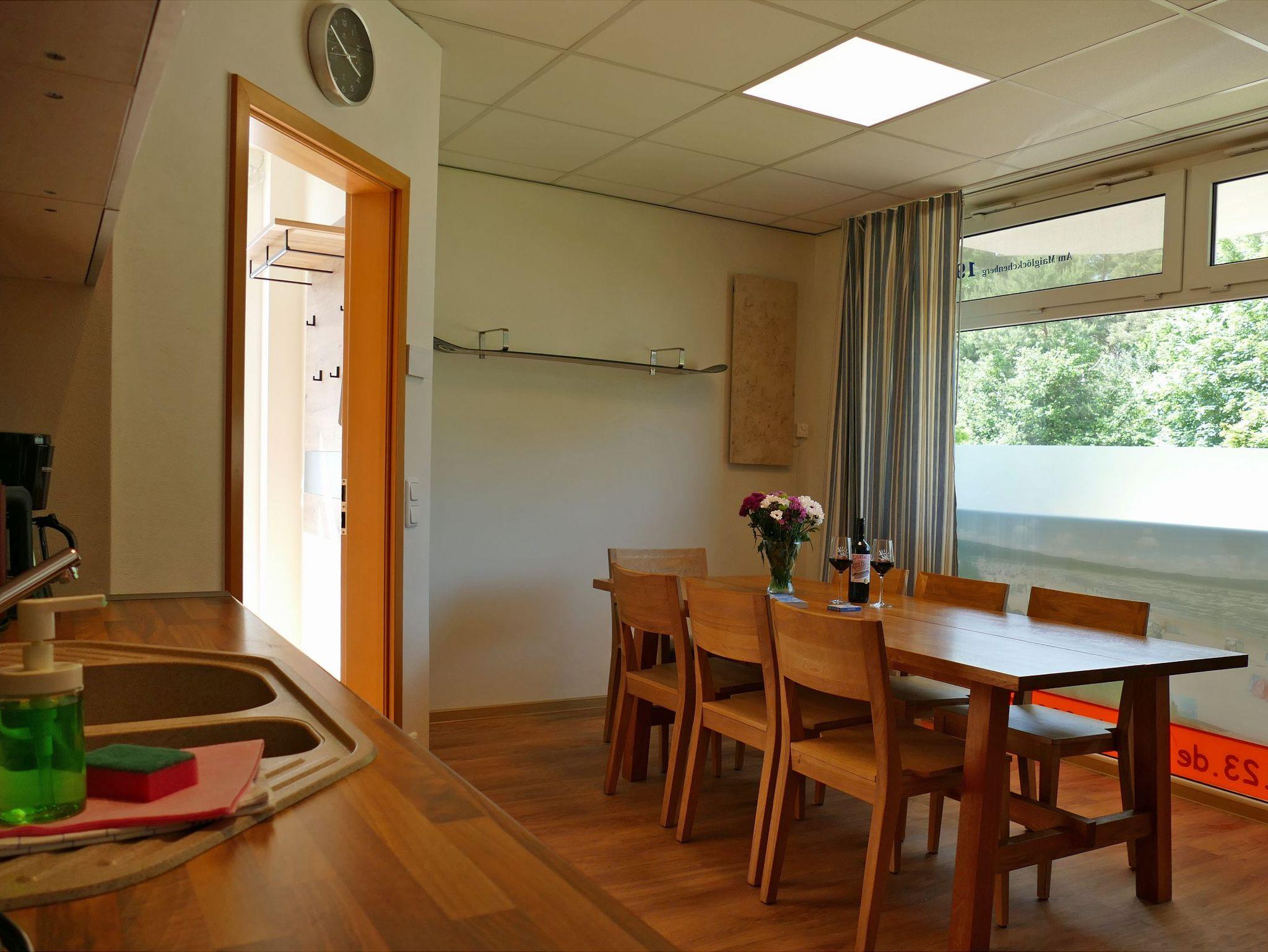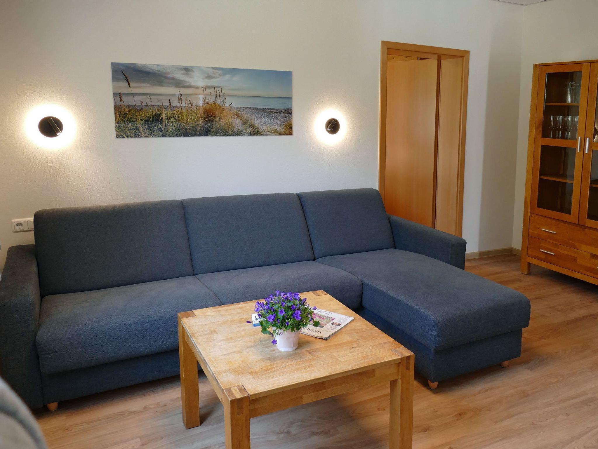 Die Zwei-Raum-Wohnung (ca. 55 m²) mit separatem Schlafzimmern (ca. 15 m²) im EG, offenem Wohn- und Küchenbereich, Esstisch mit 6 Stühlen, Duschbad mit WC, großer Terrasse mit Gartenmöbeln. Die Erweiterung zur 3-Raum-Wohnung (2RaumFeWo + SZ) ist bei einer Belegung mit mehr als 2 Personen vorgesehen.