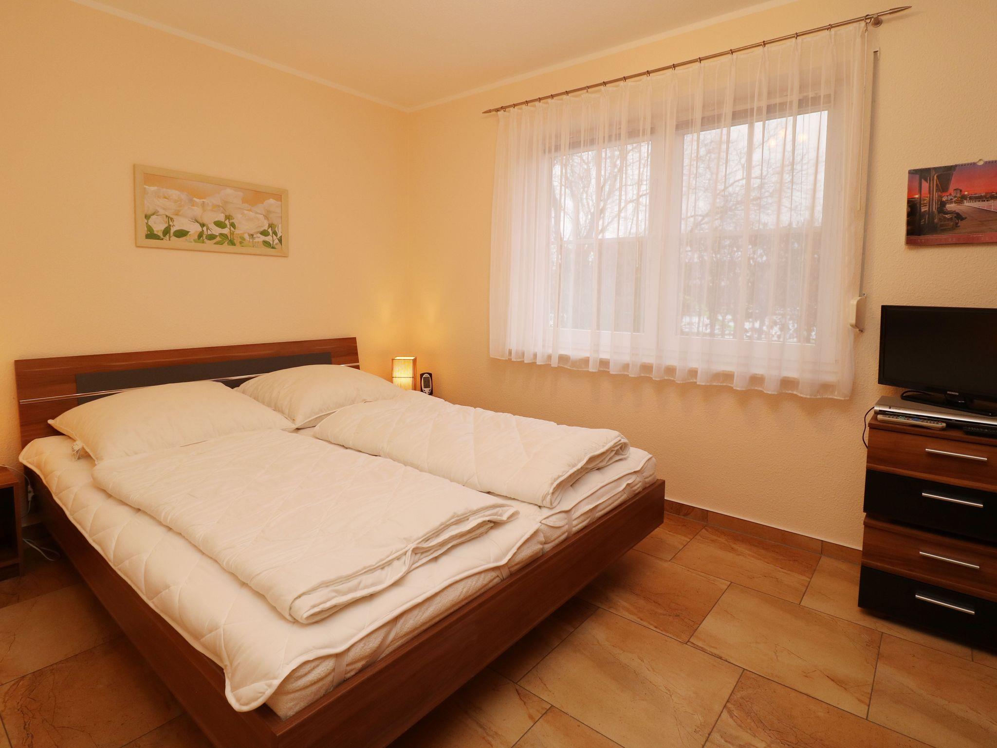 Die Ferienwohnung Sommergarten 29a06 ist eine 2-Raum-Wohnung mit einem Schlafzimmer mit Doppelbett und Platz für mindestens 1 Baby, das noch im Babybett schläft.