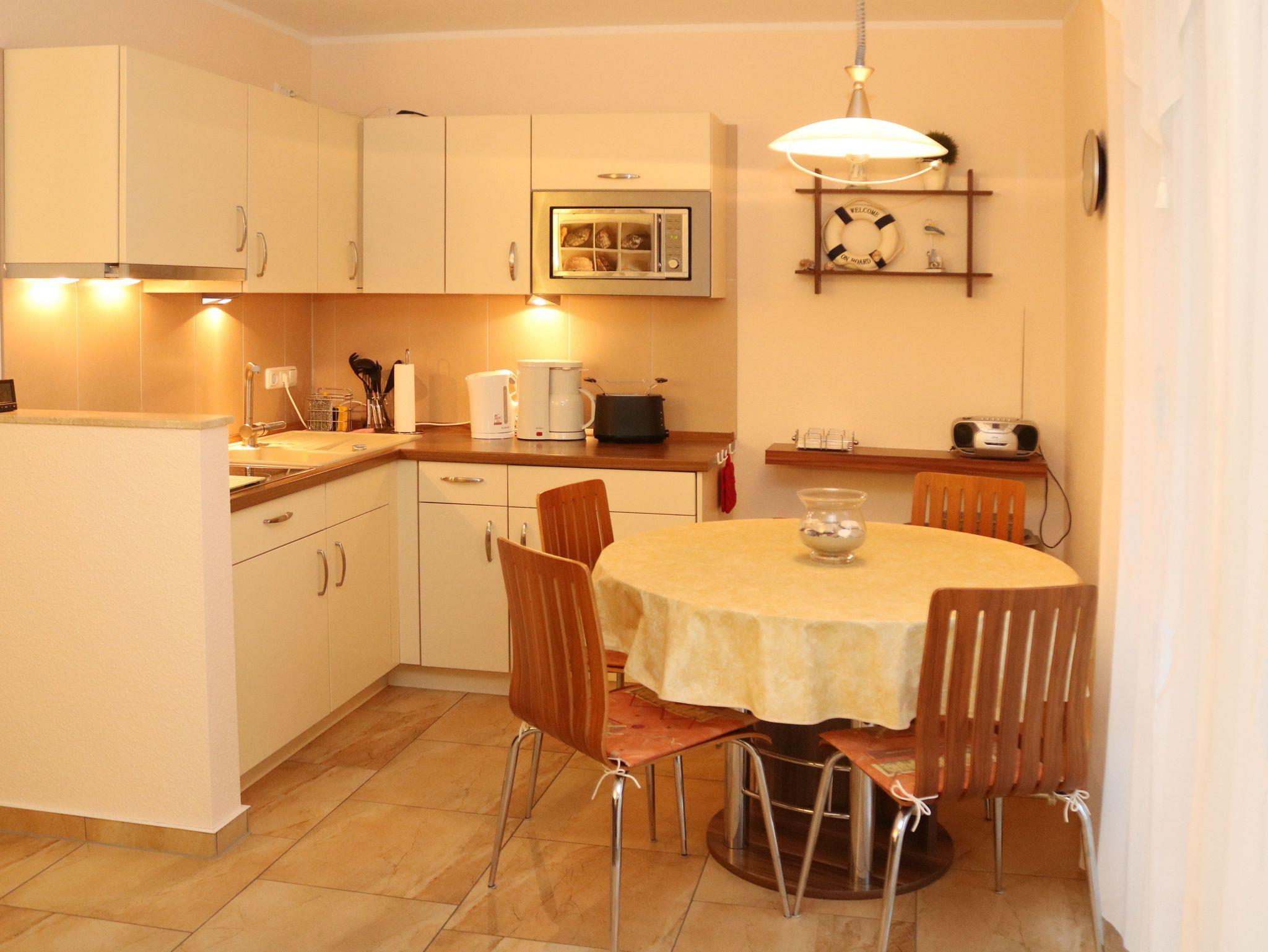 Zur Wohnung gehören eine Terrasse mit Sitzmöbeln, WLAN sowie ein Minibackofen in der Küche.