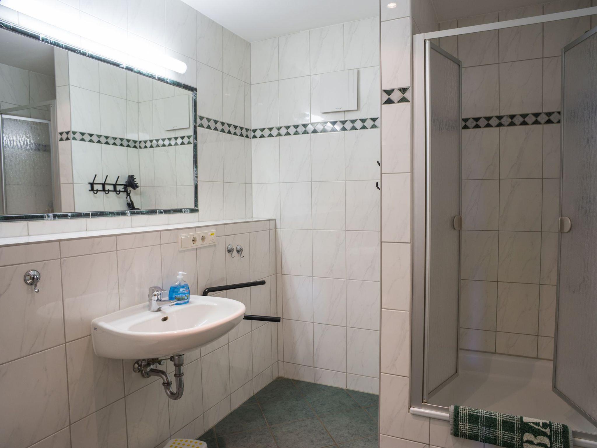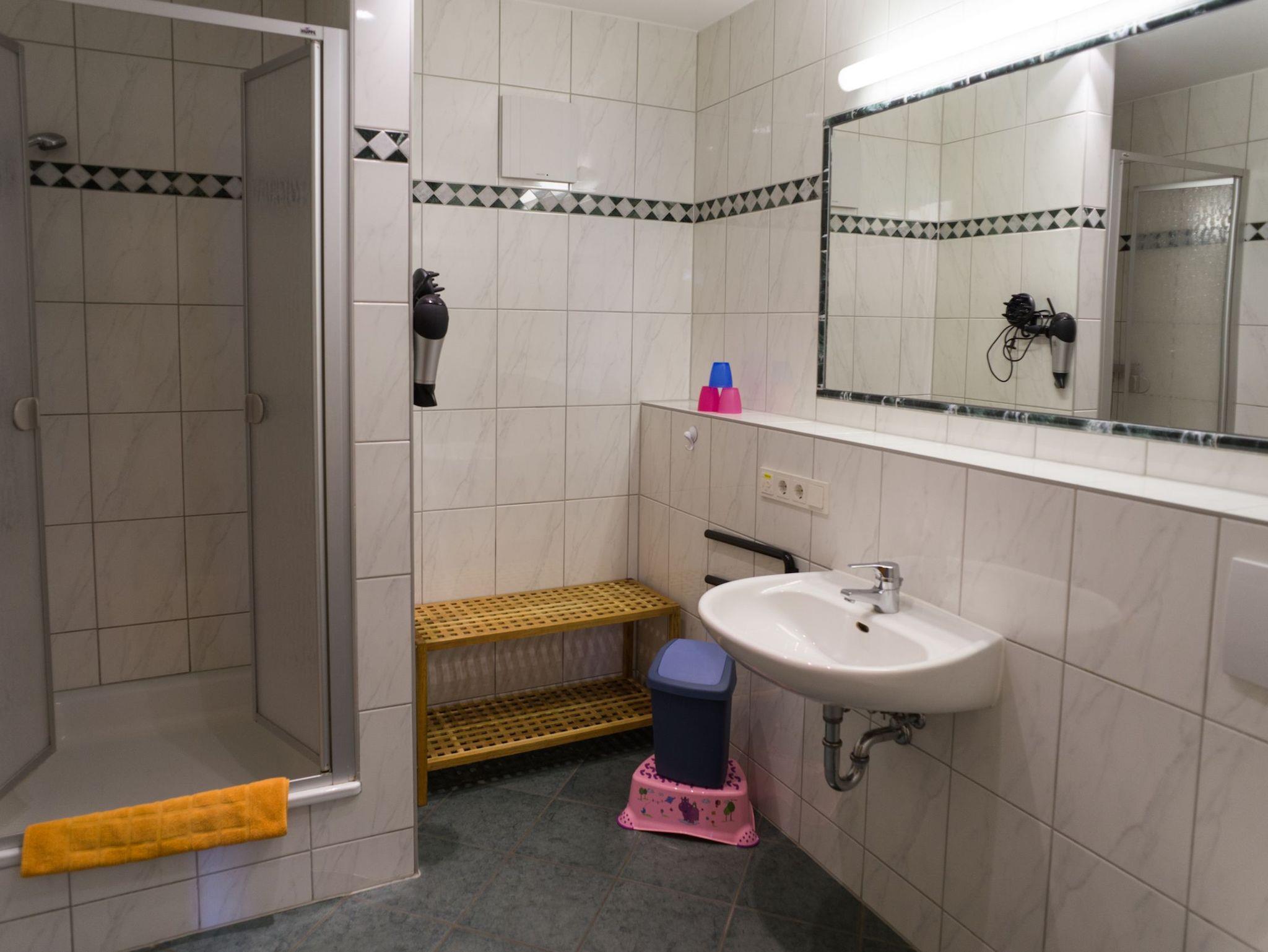 • Bad mit Dusche, Waschtisch und WC