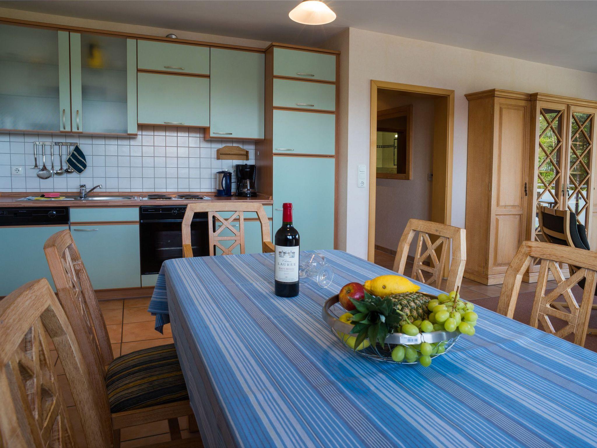 Die offene Küche bietet alles, was Sie für die Zubereitung Ihrer Lieblingsgerichte benötigen: ausreichend Geschirr, eine Spülmaschine, einen Kühlschrank mit Gefrierfach, einen Backofen mit Herd sowie eine Kaffeemaschine und viele weitere praktische Küchenutensilien. Am Esstisch finden bis zu sechs Personen bequem Platz, ideal für gesellige Mahlzeiten.