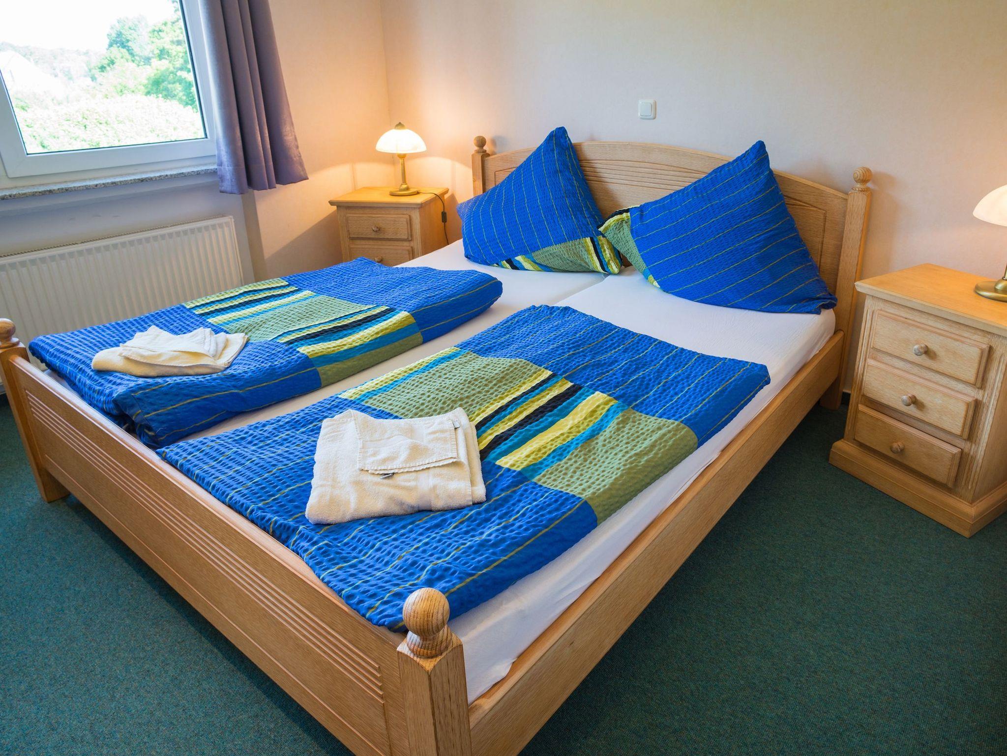 Die beiden Schlafzimmer sind mit einem Doppelbett (zwei Matratzen, jeweils 90 x 200 cm) und einem Kleiderschrank ausgestattet und bieten somit einen erholsamen Rückzugsort. Das Badezimmer verfügt über eine Dusche, einen Waschtisch und ein WC modern und funktional zugleich.