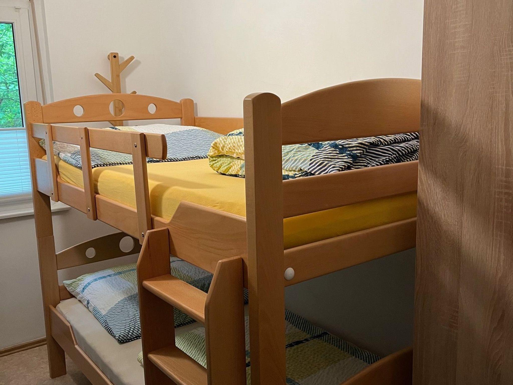 Ein Schlafraum mit einem Doppelbett, ein Schlafraum mit Etagenbett für zwei Personen