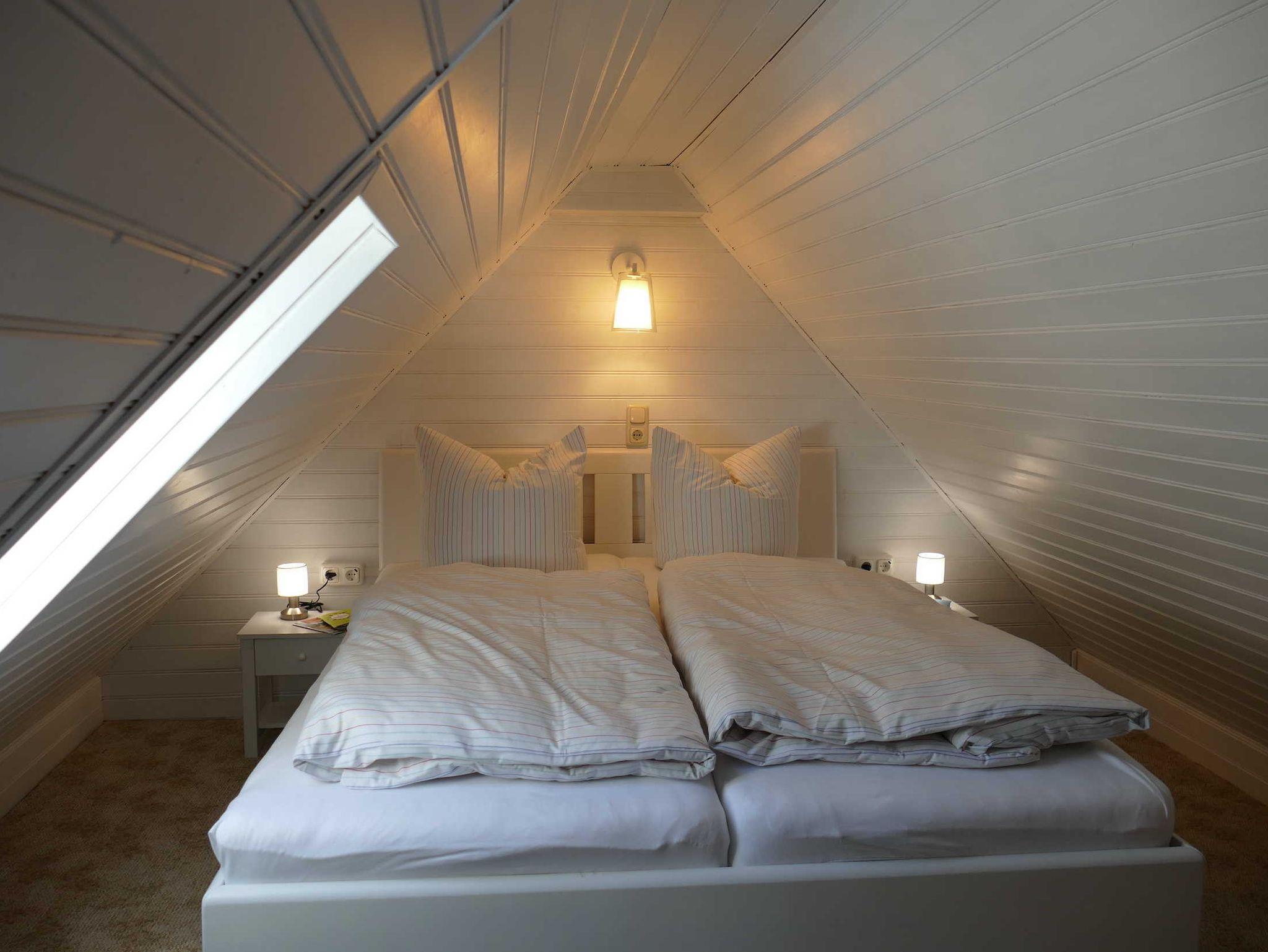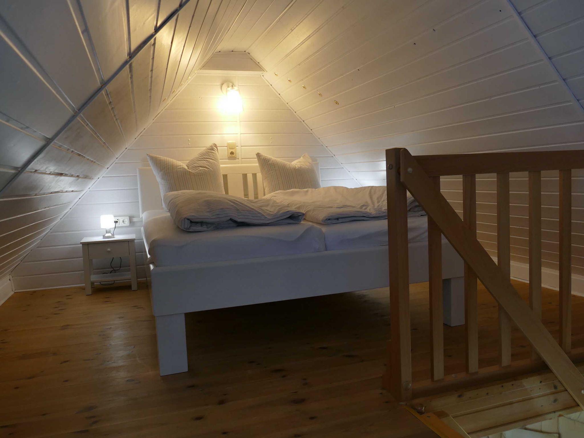 Zwei-Raum-Ferienwohnung vom TypZ2 mit Schlafbereich im Dachgeschoss und Balkon, im Reetdachhaus direkt hinter der Düne, im Ferienhaus Zeltpaltzstraße 29.