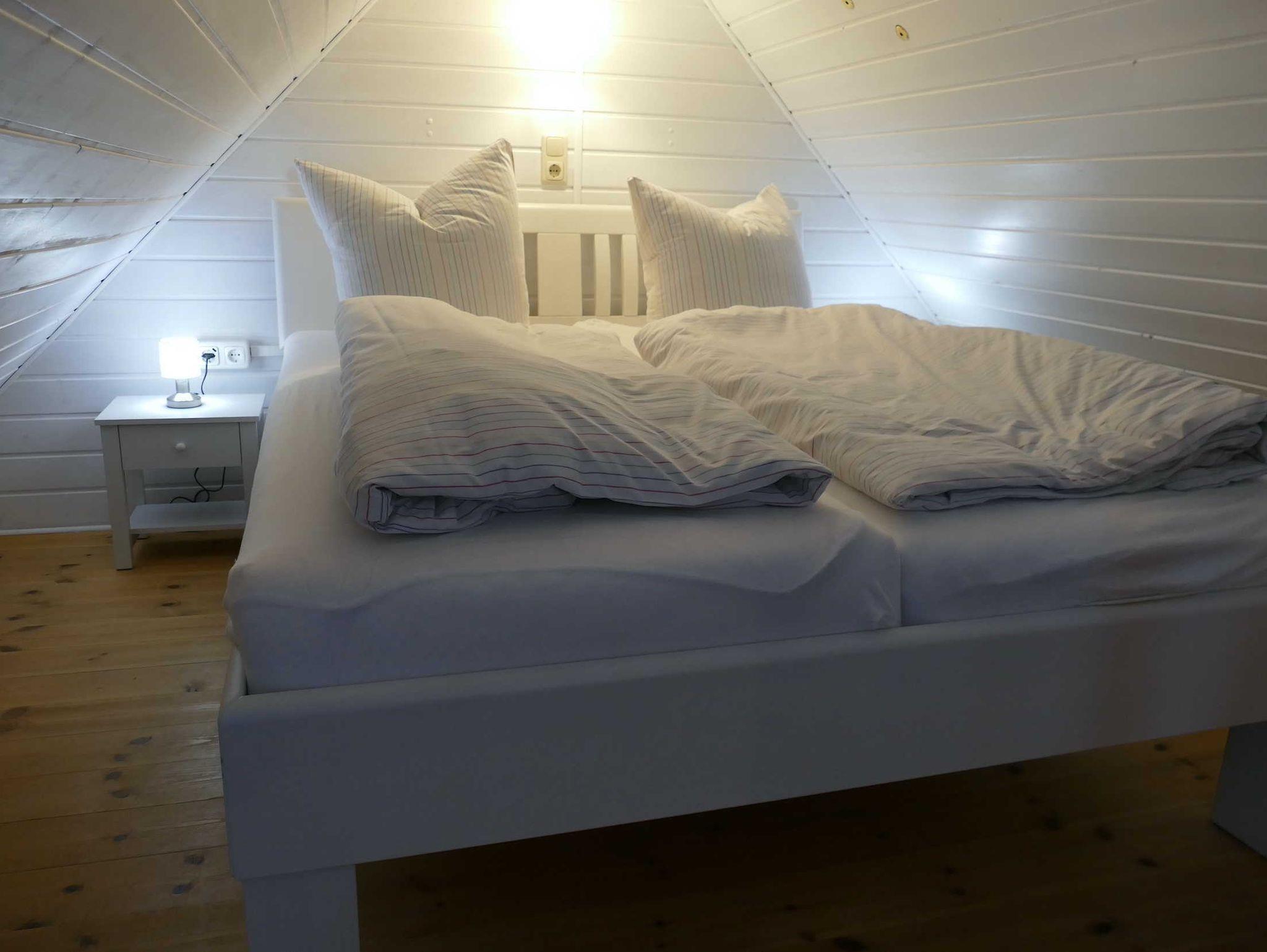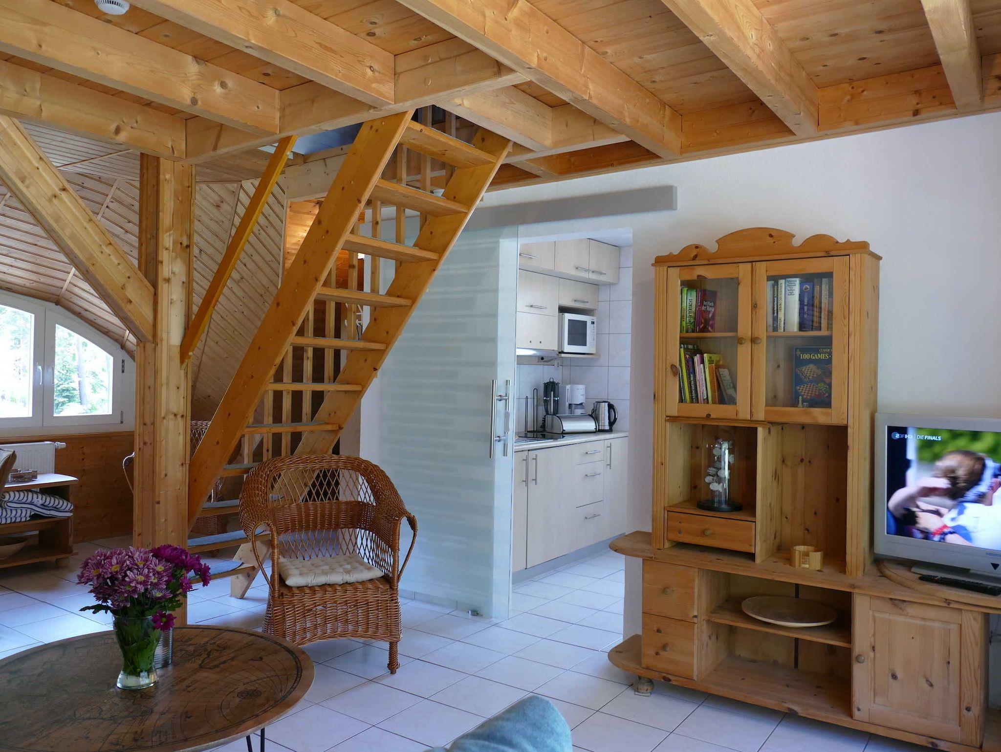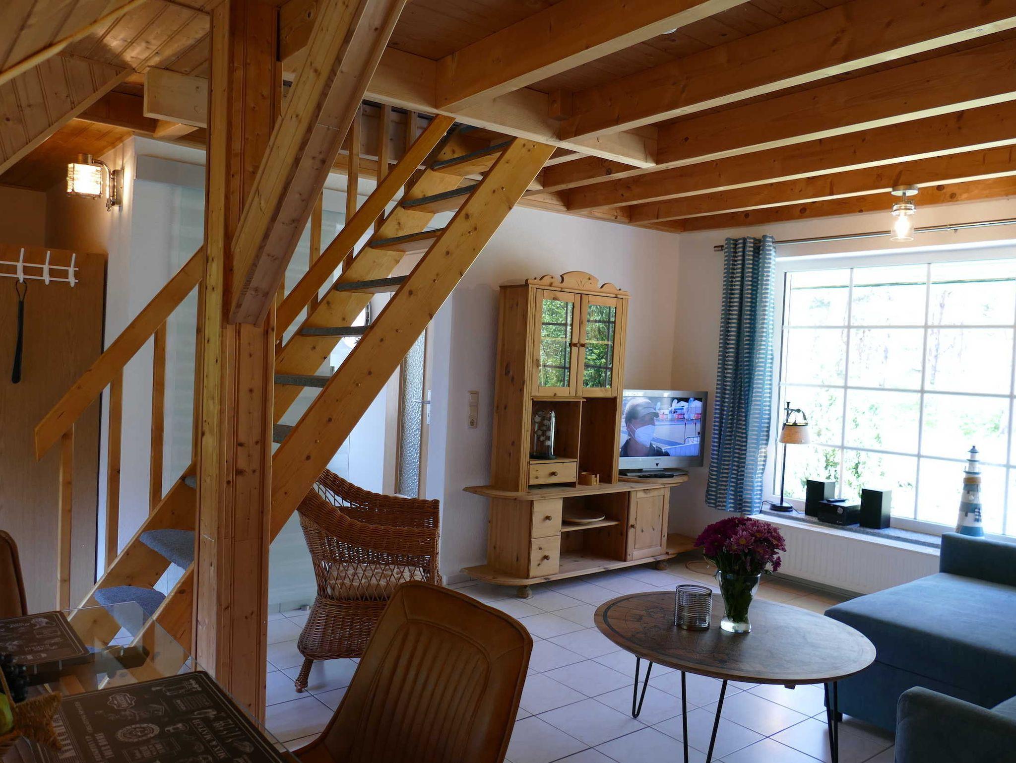 Der Wohnbereich mit seiner bequemen Polsterecke und dem Fernseh- und Musikbereich bietet ausreichend Platz für die Abendgestaltung. Von hier aus geht es hinauf in den Schlafbereich. Der Essbereich bietet Platz für vier Personen. Die Küchenzeile im Eingangsbereich ist mit Herd und Microwelle und vielem mehr versehen. Der abgetrennte Schlafbereich ist über eine Holztreppe zu erreichen und mit einem Doppelbett (2mal 90/200) und einer zusätzlichen Schlafmöglichkeit ausgestattet. Im Bad befinden sich Dusche, ein Waschtisch und ein WC.