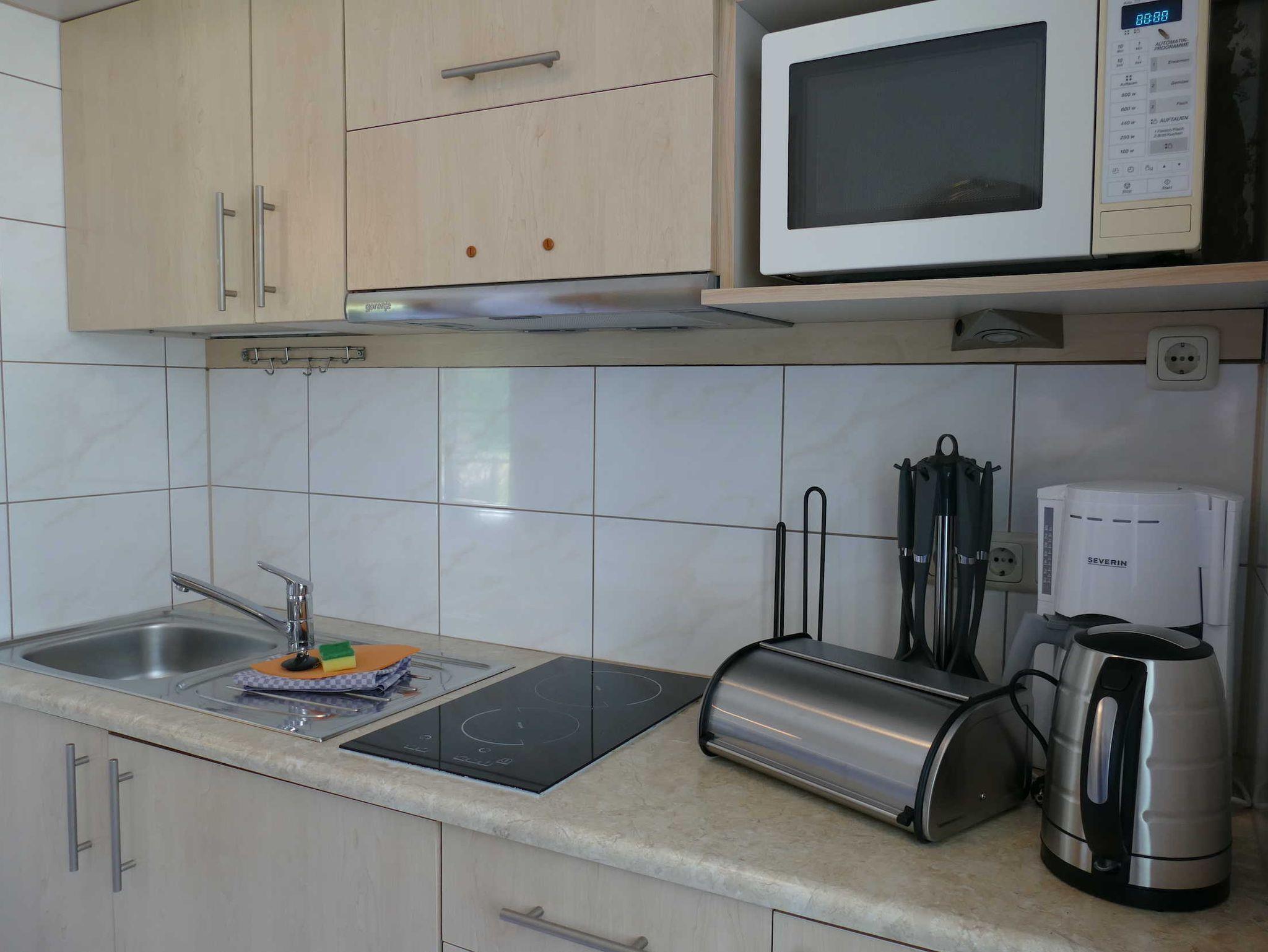 ? Küche mit Herd & Mikrowelle, Kühlschrank, Kaffeemaschine, Wasserkocher, Geschirr & Besteck u.v.m.