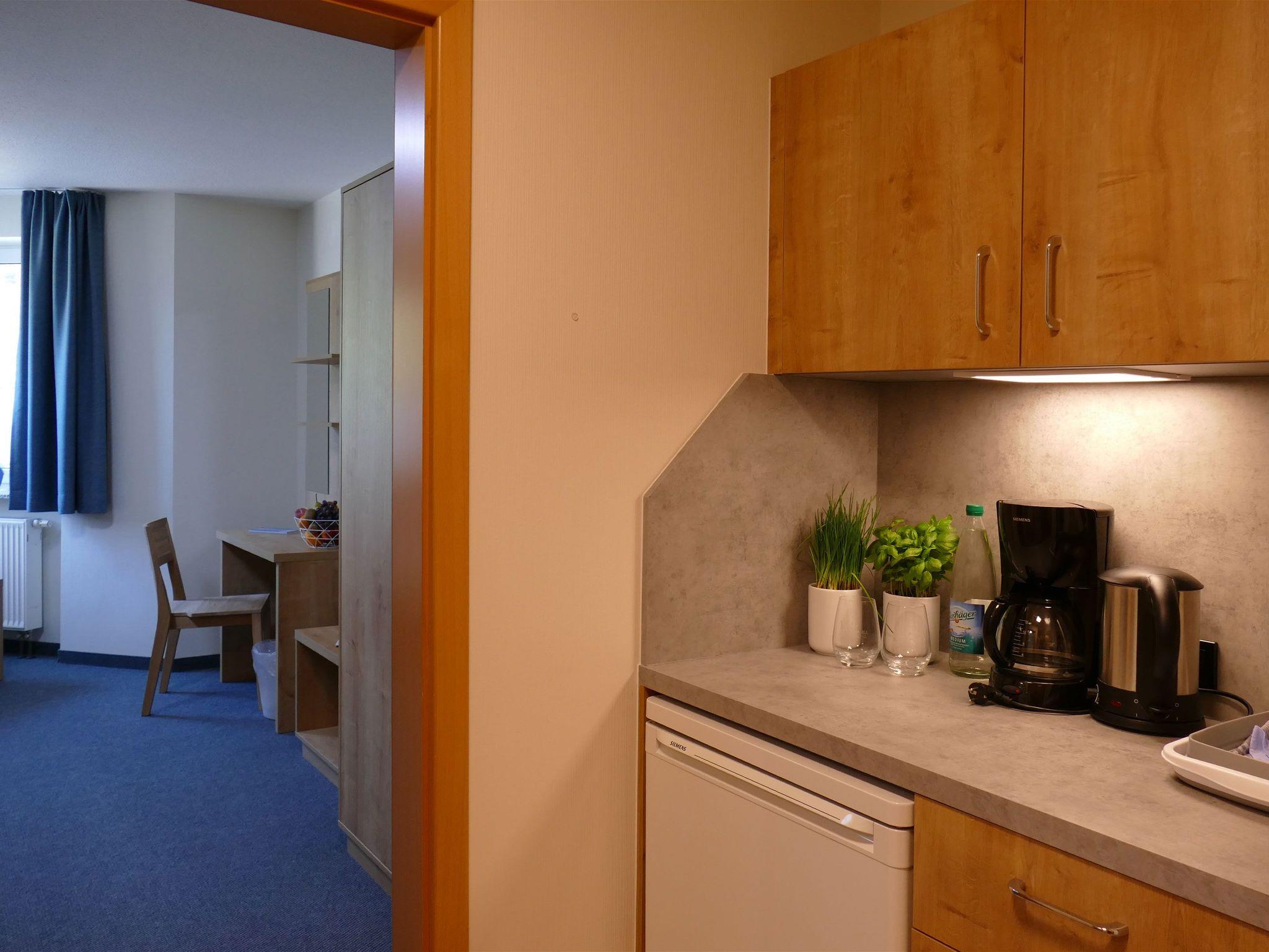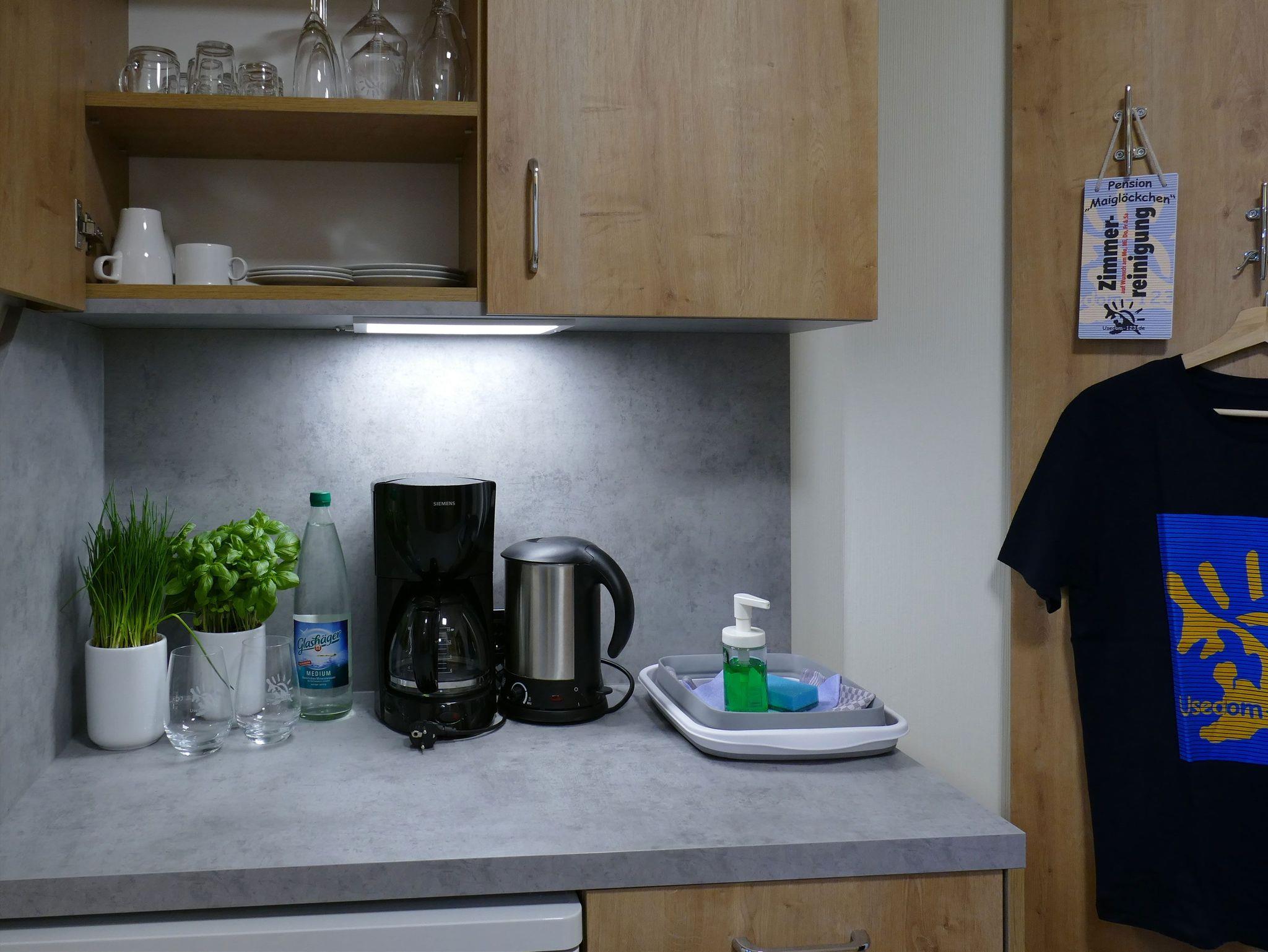 • Küchenblock mit Kühlschrank, Kaffeemaschine, Wasserkocher, Geschirr und Besteck u.v.m.; keine Kochmöglichkeit