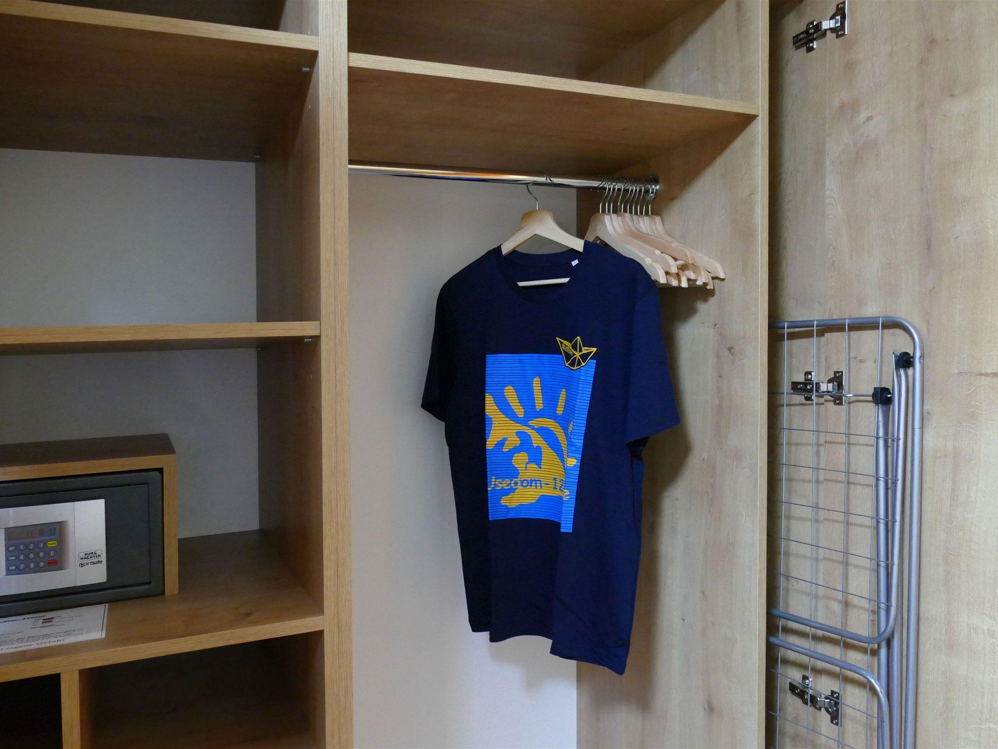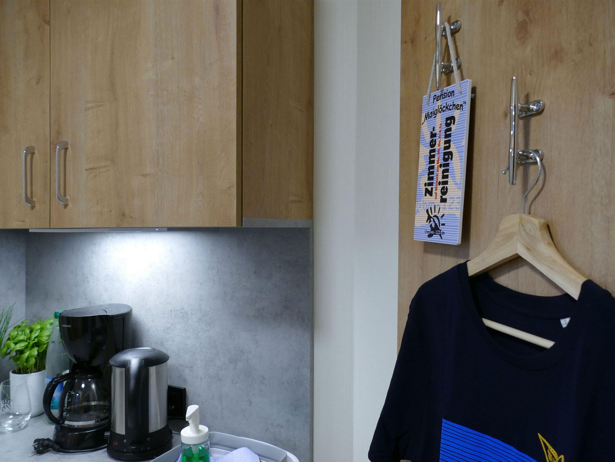 Im Flurbereich befindet sich ein kleiner Küchenblock mit Kühlschrank, Kaffeemaschine, Wasserkocher und Geschirr ideal, um sich zwischendurch selbst zu versorgen. Eine Garderobe und eine Abstellmöglichkeit für Gepäck runden das durchdachte Raumangebot ab.