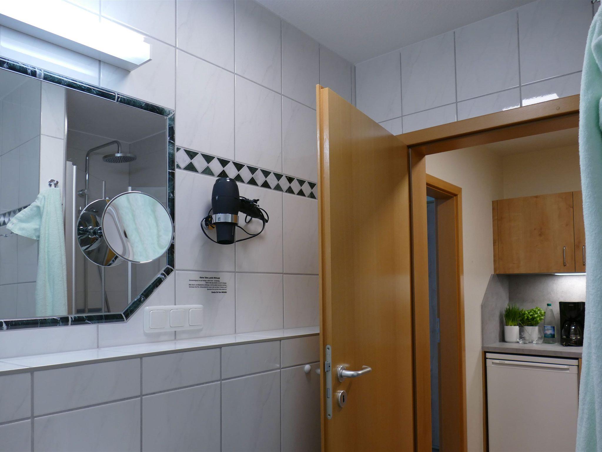 Das moderne Badezimmer überzeugt mit einer großzügigen Regen-Shower-Dusche, einem eleganten Waschtisch und WC. Ein Haartrockner, ein Badezimmerhocker sowie hochwertiges Duschgel stehen Ihnen selbstverständlich zur Verfügung.