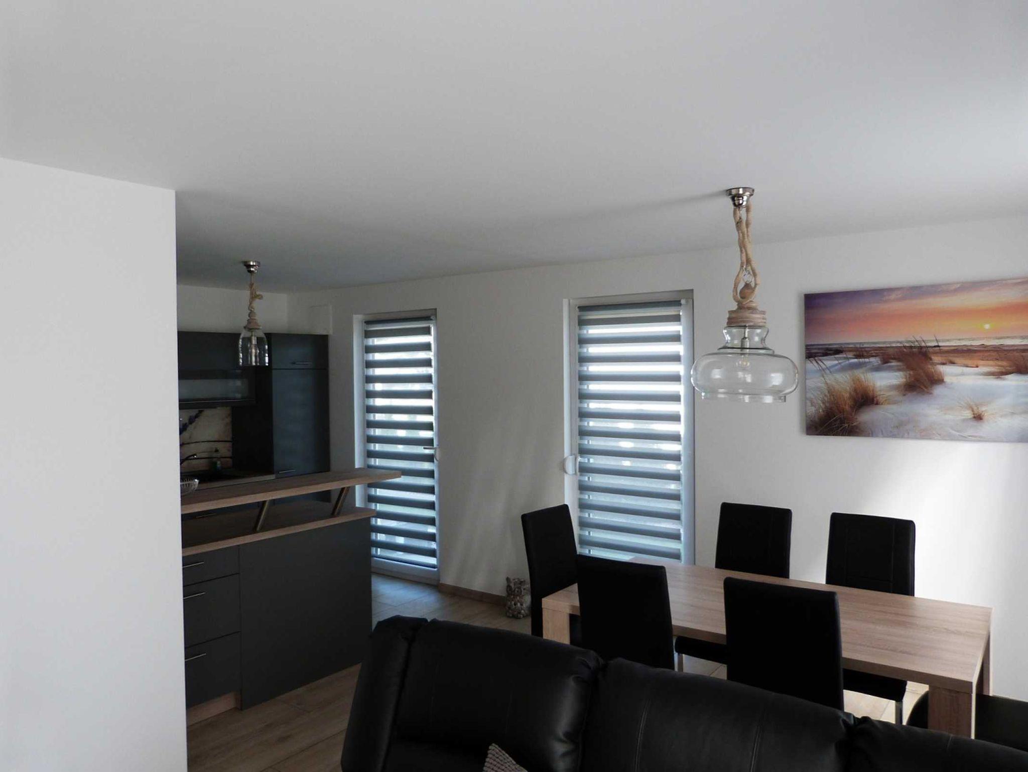 Im Wohnzimmer gehen der Essbereich mit komplett ausgestatteter Küche fließend ineinander über.