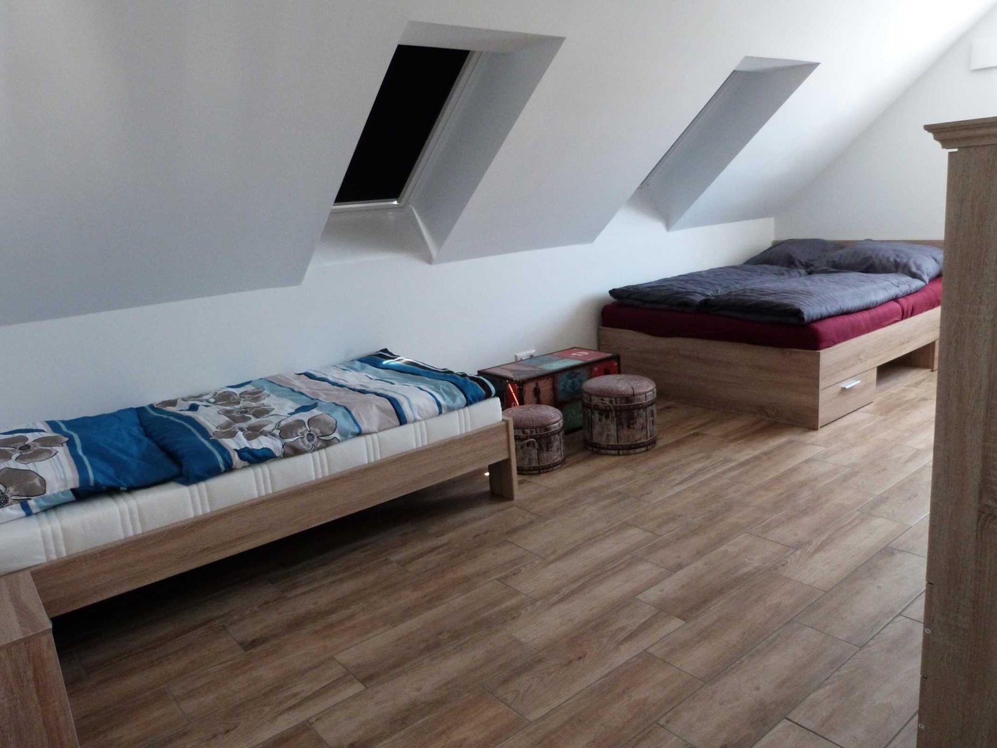 - 1 Schlafzimmer mit 1 Doppelbett 140 x 200 cm und Einzelbett 90 x 200 cm im Obergeschoss,
