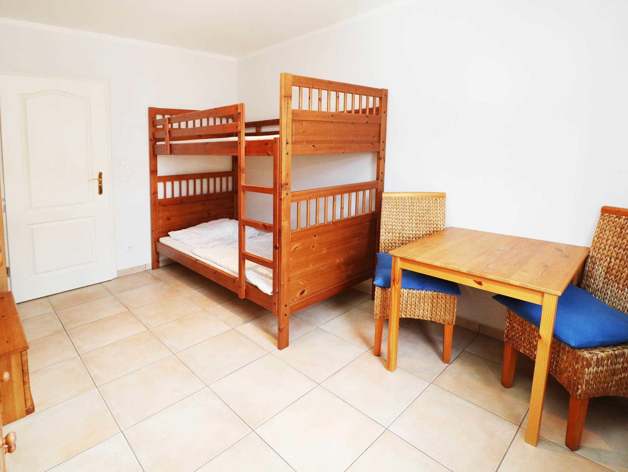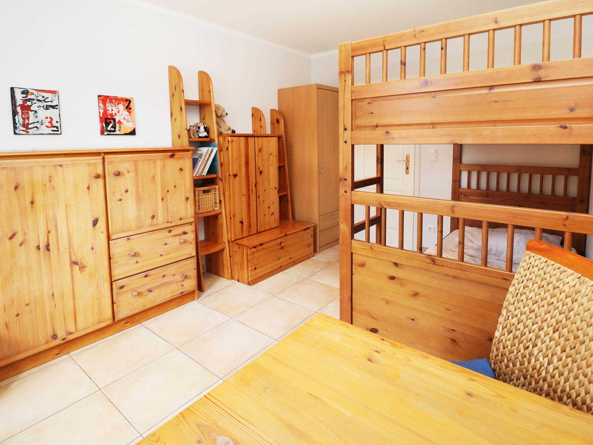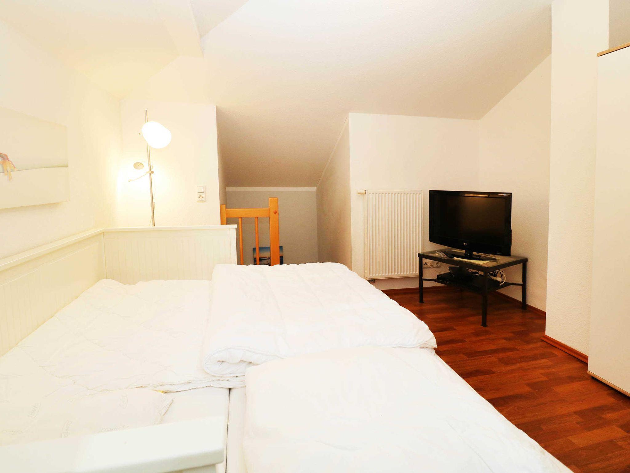 Die Schlafräume sind mit einem Doppelbett sowie einem Etagenbett im Kinderzimmer ausgestattet. Im Obergeschoss der Wohnung befindet sich eine gemütliche Leseecke, die auch als zusätzliche Schlafgelegenheit für 1-2 Personen genutzt werden kann. Hier befindet sich auch ein zweiter Fernseher. Das Badezimmer verfügt über eine Dusche.