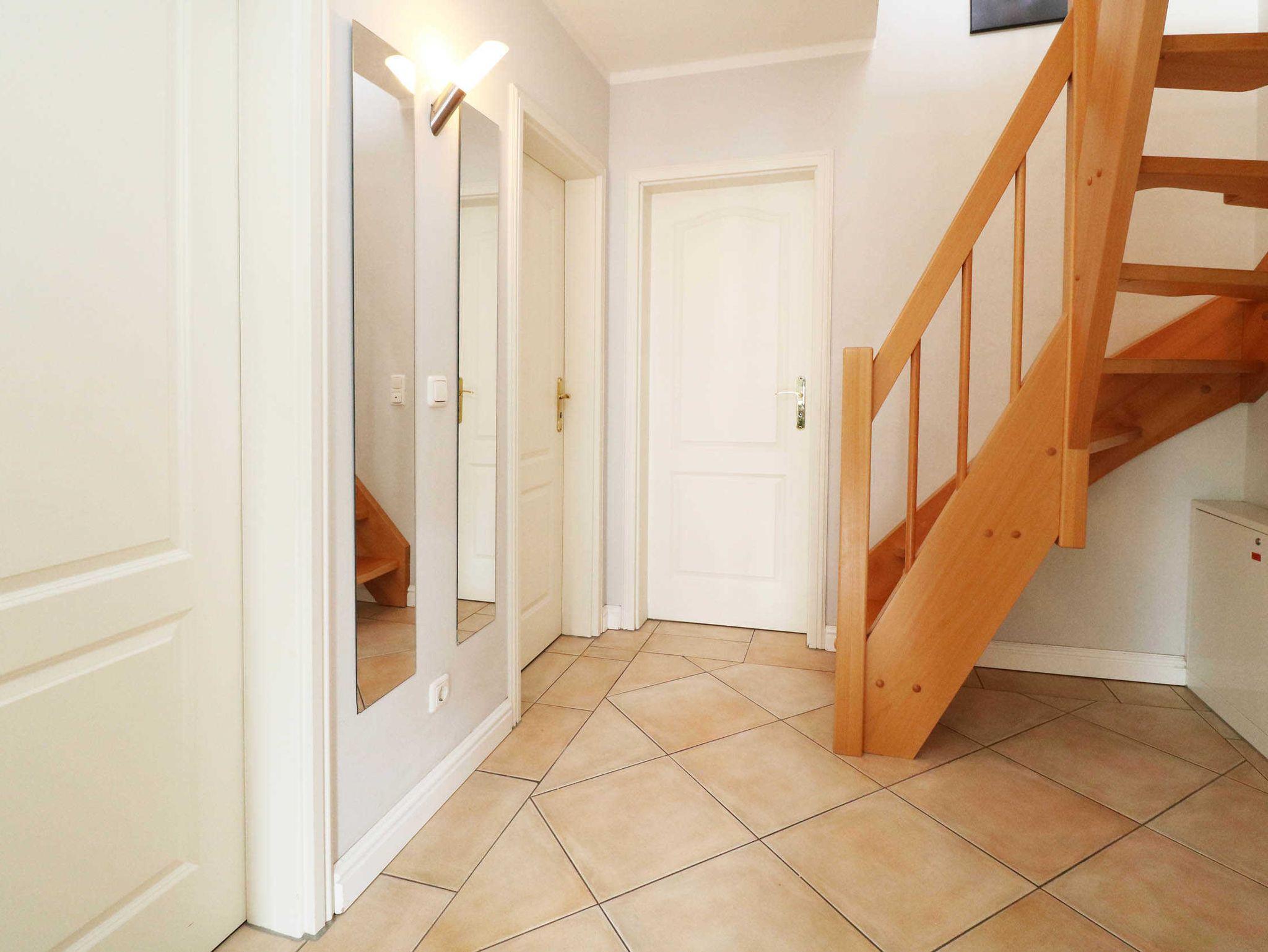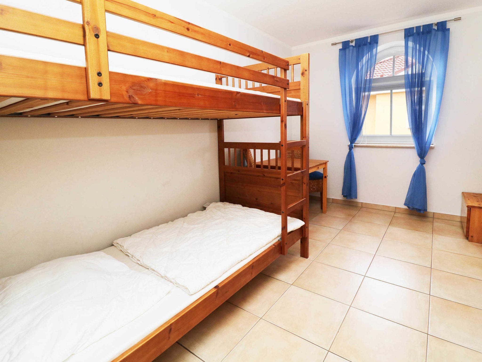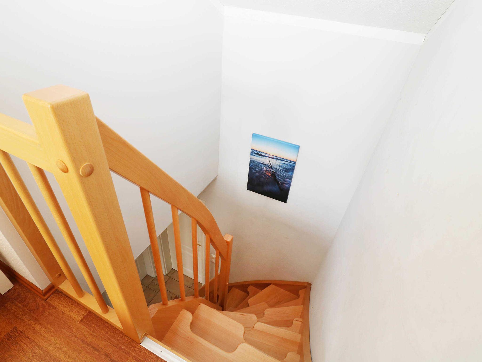 Die Schlafräume sind mit einem Doppelbett sowie einem Etagenbett im Kinderzimmer ausgestattet. Im Obergeschoss der Wohnung befindet sich eine gemütliche Leseecke, die auch als zusätzliche Schlafgelegenheit für 1-2 Personen genutzt werden kann. Hier befindet sich auch ein zweiter Fernseher. Das Badezimmer verfügt über eine Dusche.