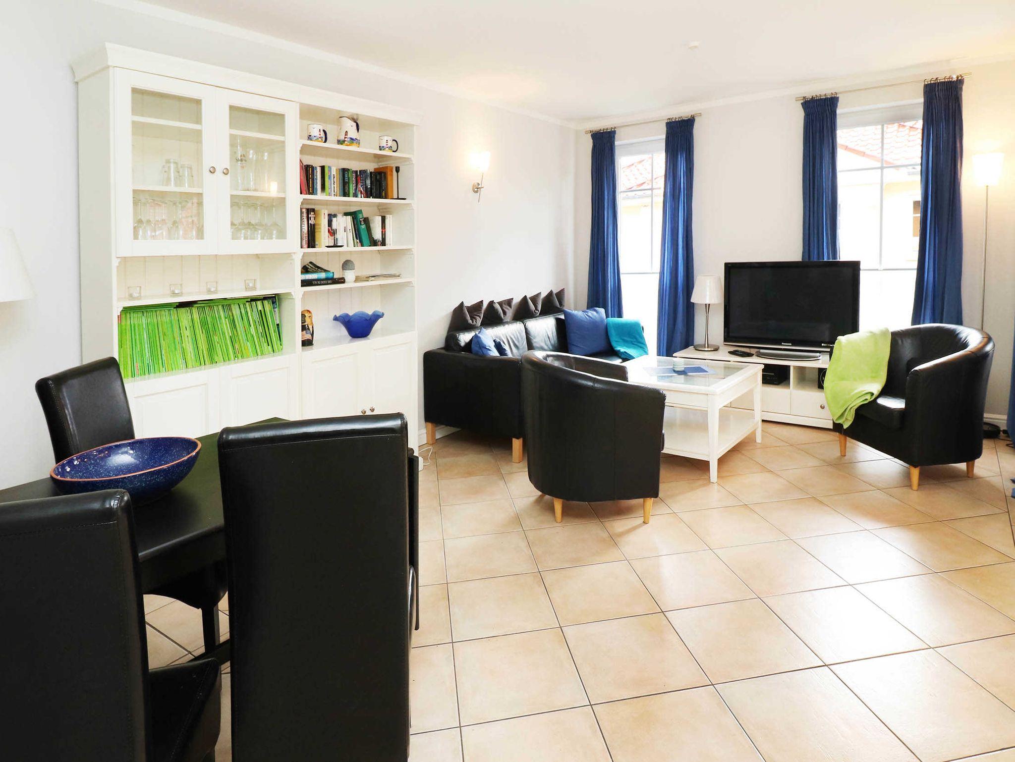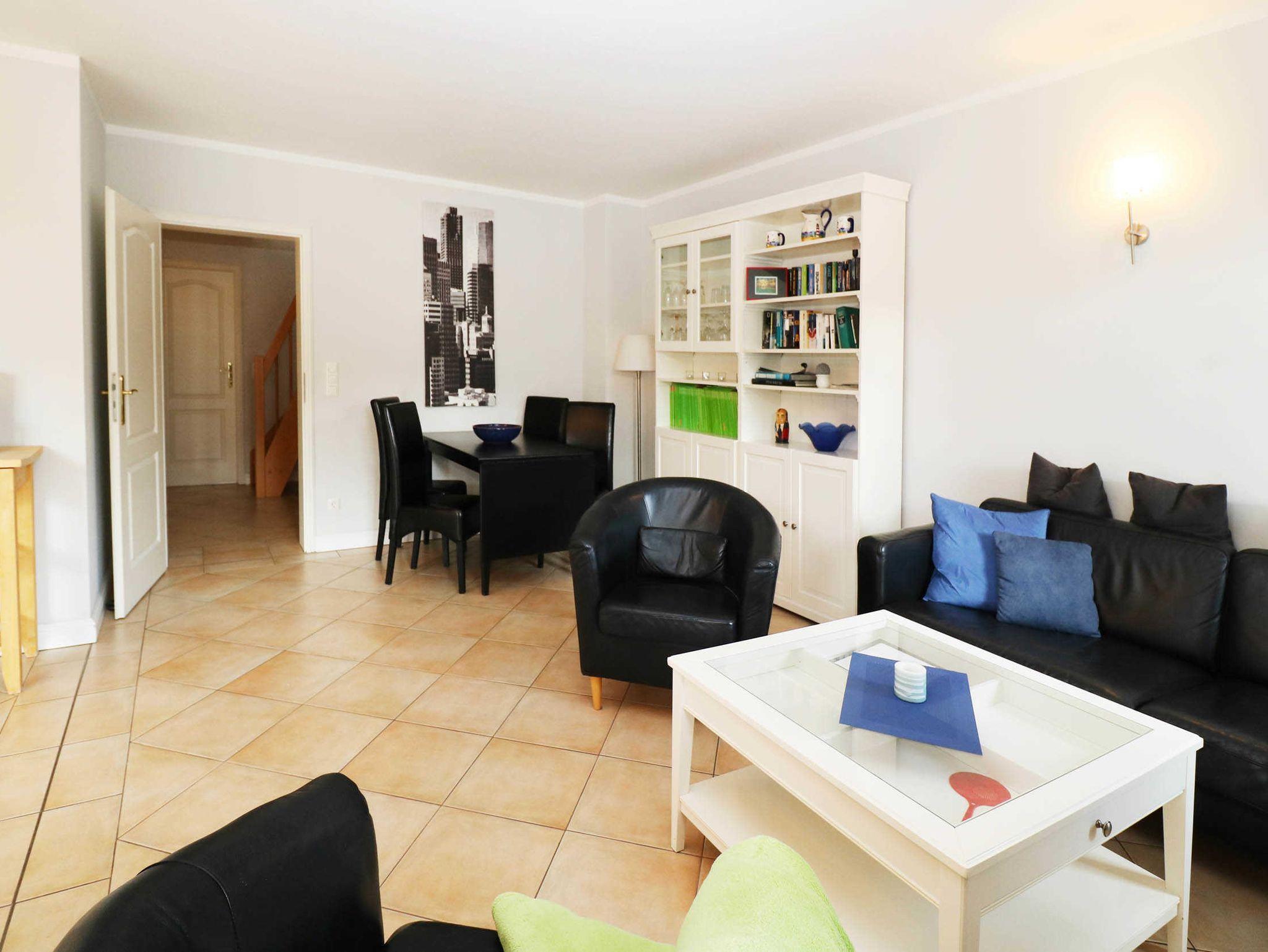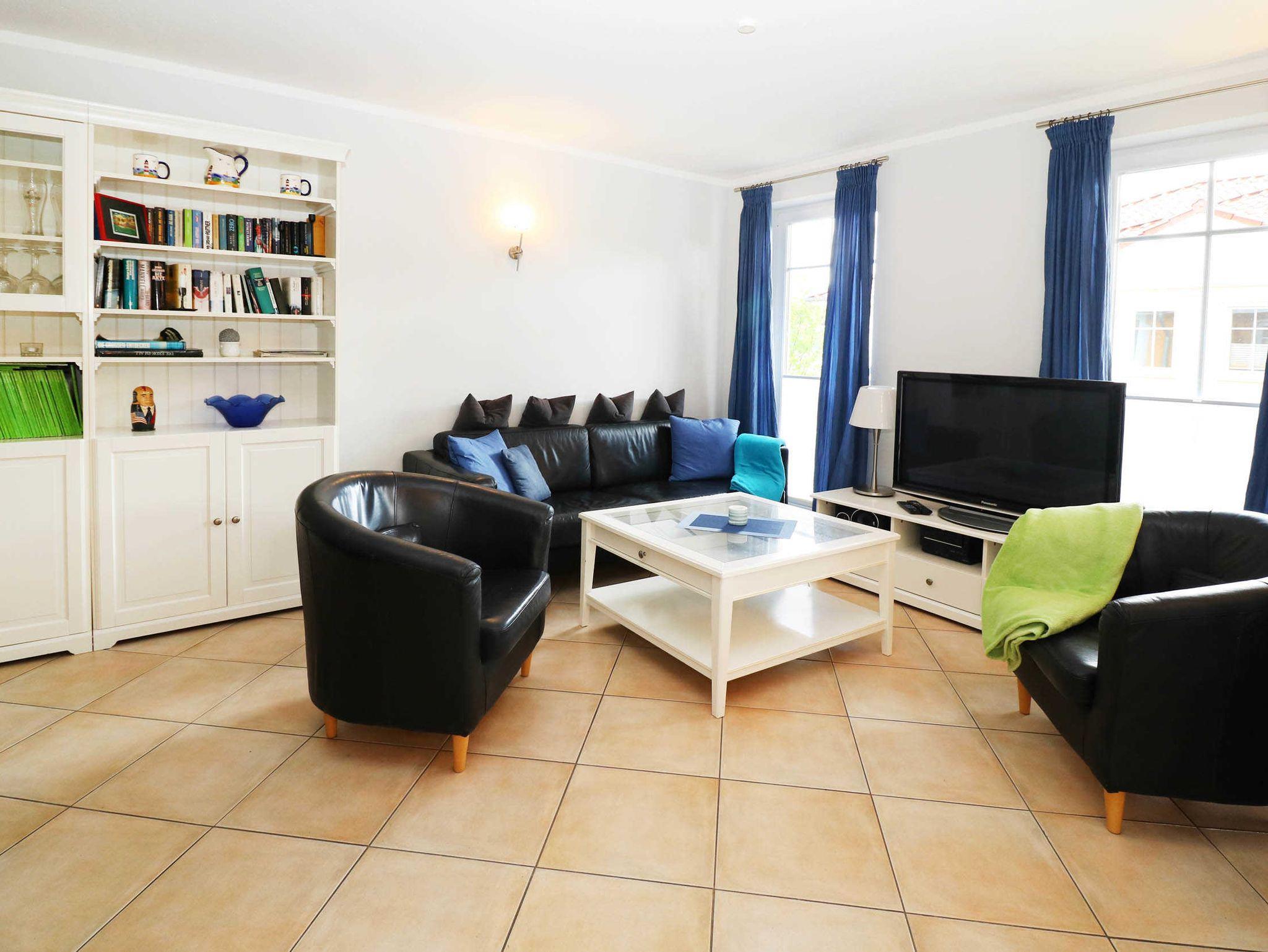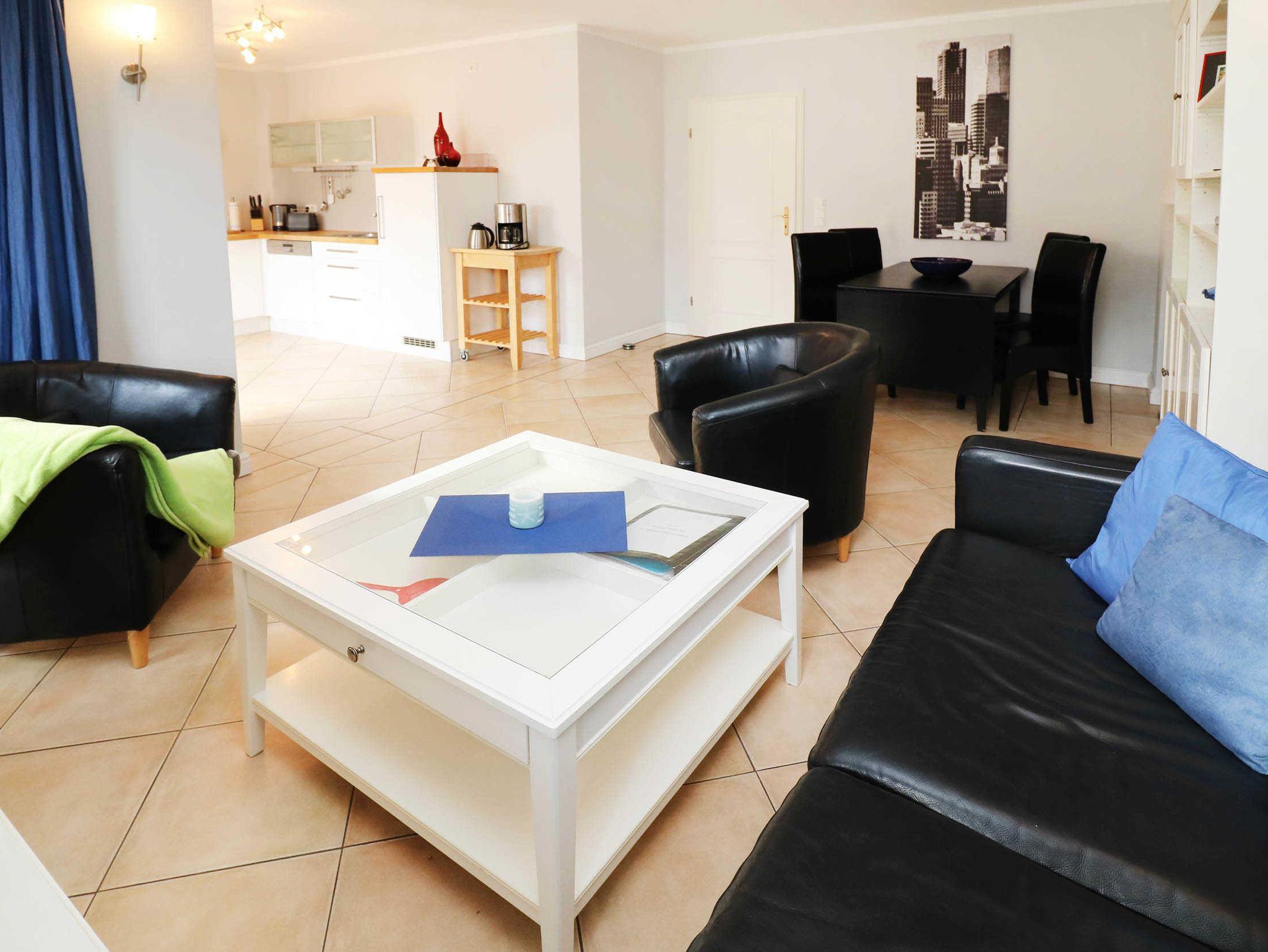 Der Wohnraum mit offener Küche ermöglicht eine optimale Selbstversorgung. Sie ist mit Mikrowelle, Geschirrspüler, Cerankochfeld, Backofen sowie Kühlschrank mit Gefrierfach ausgestattet. Der moderne Wohnbereich bietet ausreichend Platz für alle Gäste. Ein Fernseher, ein Radio, ein CD- und ein DVD-Player gehören ebenso zur Ausstattung des Wohnbereichs wie eine Essplatz.