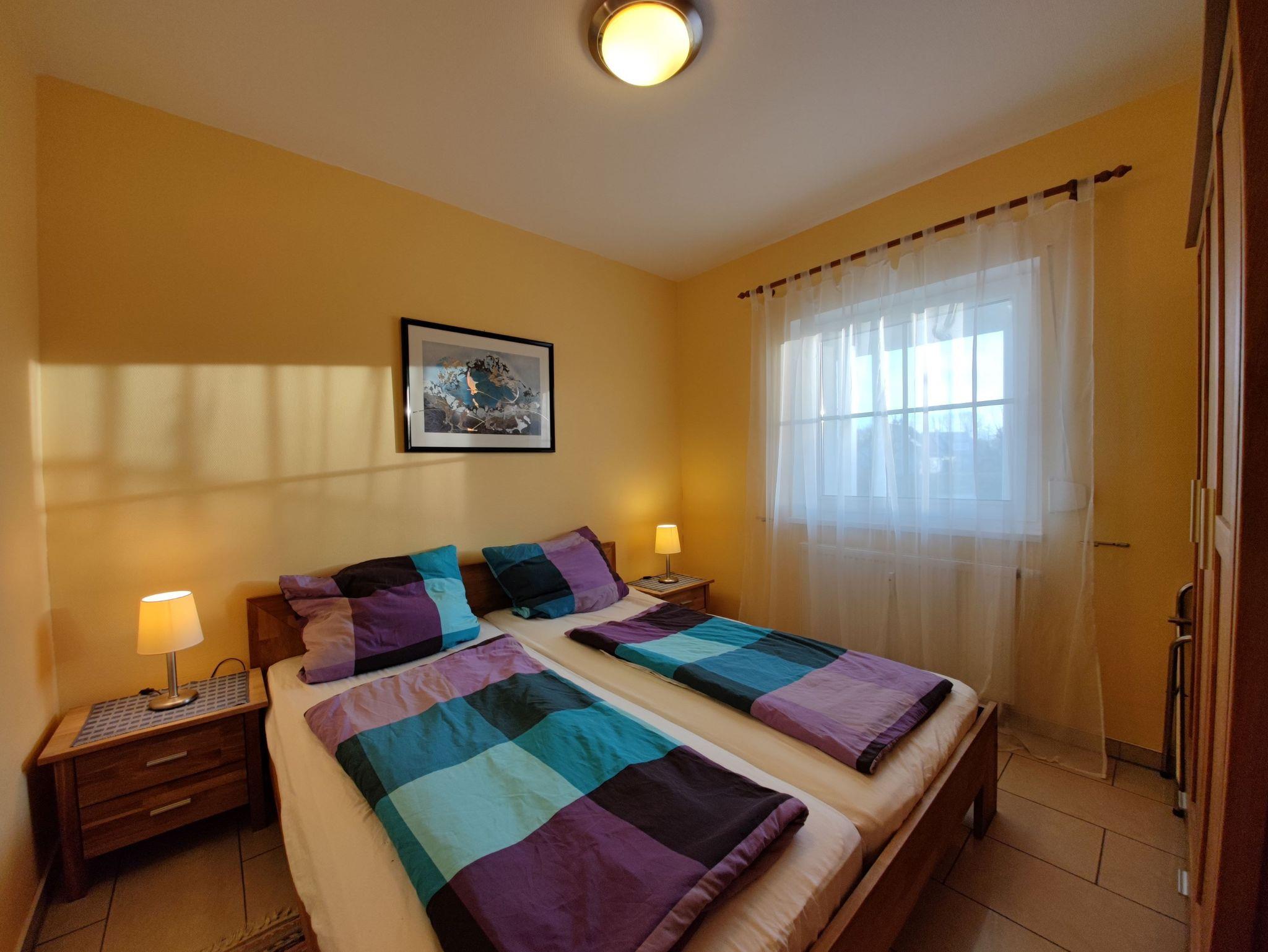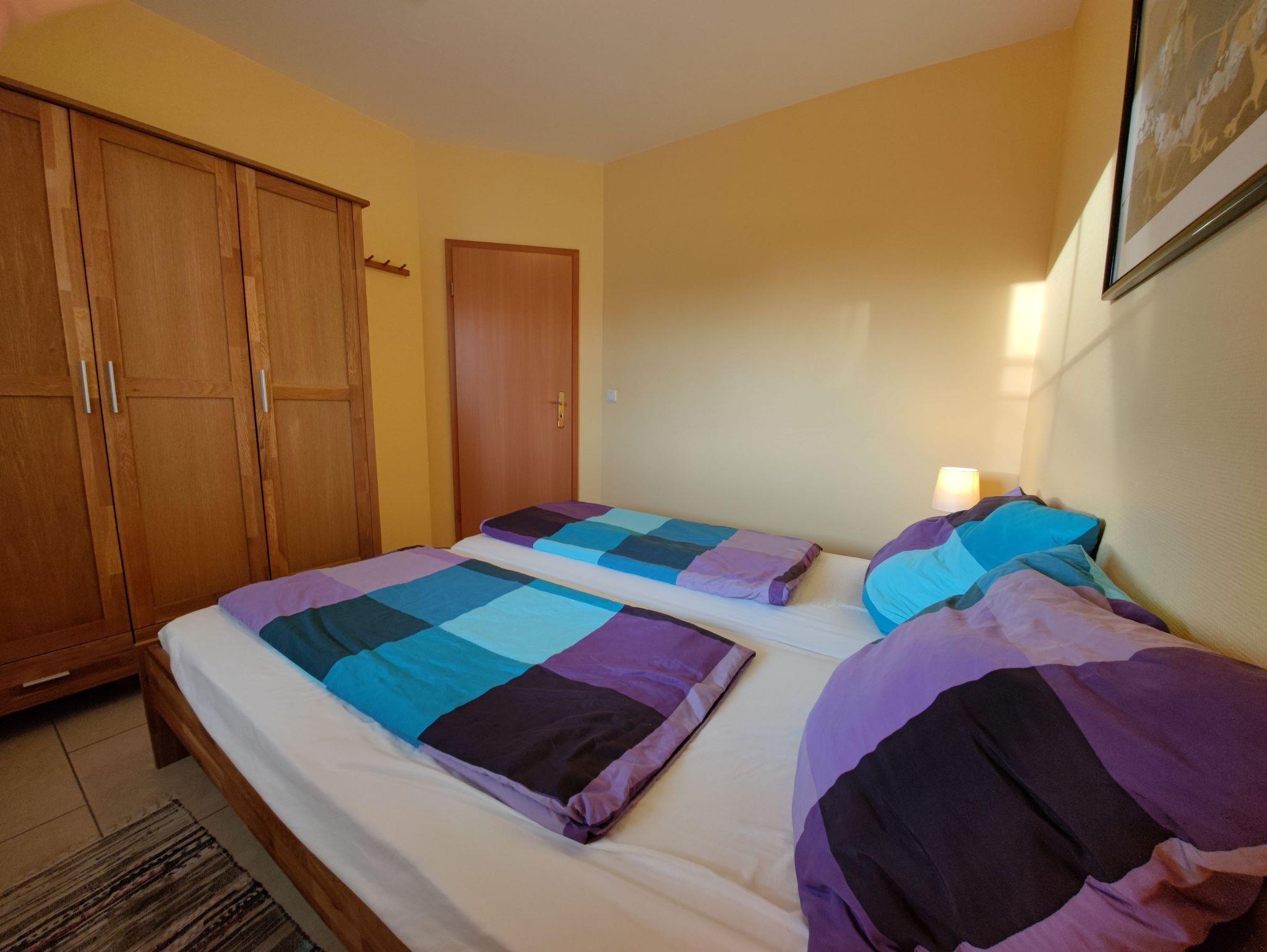 ein Schlafzimmer mit Doppelbett, zusätzliche Aufbettungsmöglichkeit im Wohnzimmer, Liegefläche 140cm