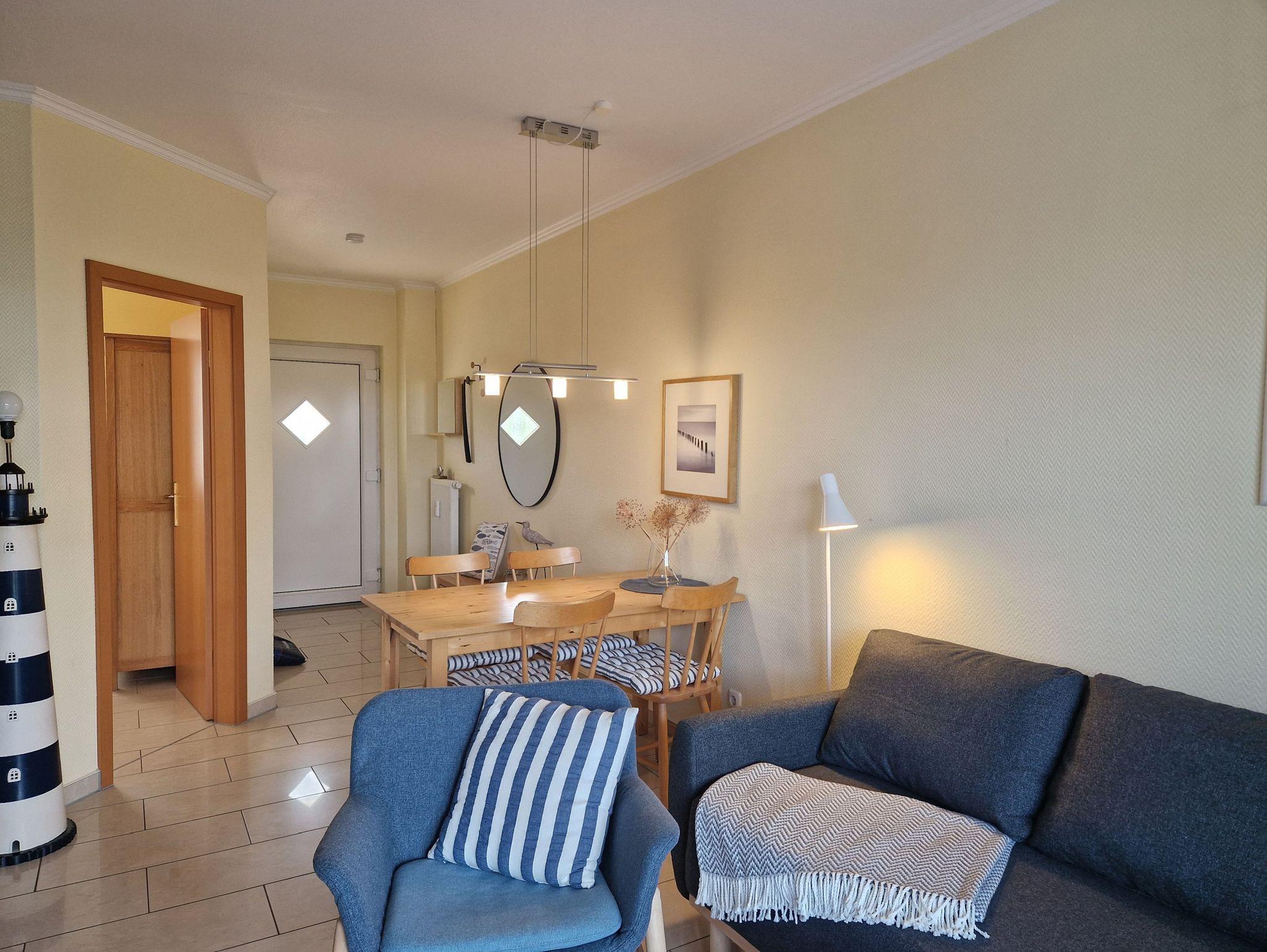 Das Wohnzimmer verfügt über eine Sitzecke mit Schlafsofa (ca. 140cm breit) und Flachbildfernseher sowie einen Essbereich.