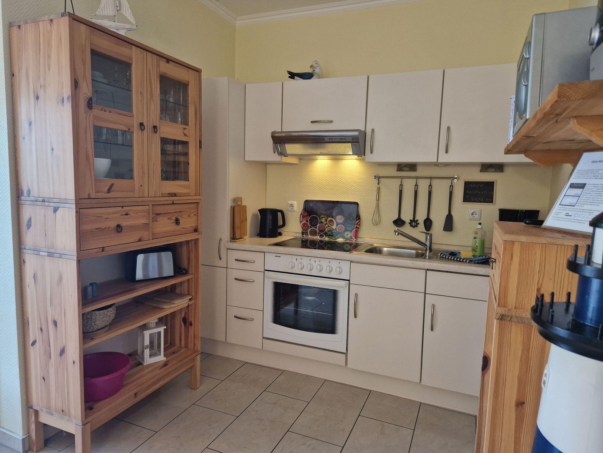 Daran anschließend finden Sie eine komfortabel ausgestattete Küchenzeile, mit reichlich Geschirr, Toaster, Kaffeemaschine, Wasserkocher, E-Herd mit Cerankochfeld und Backofen.