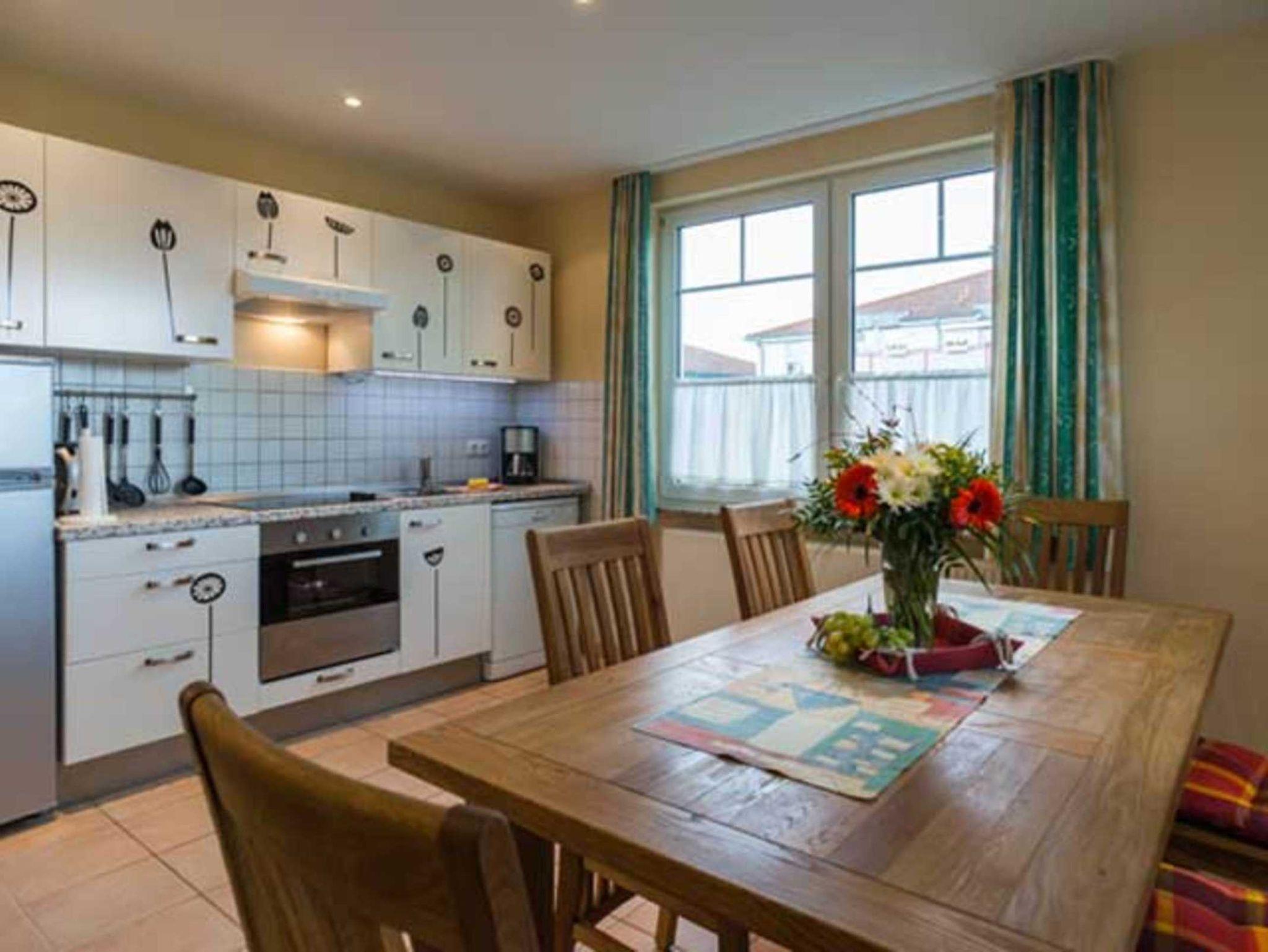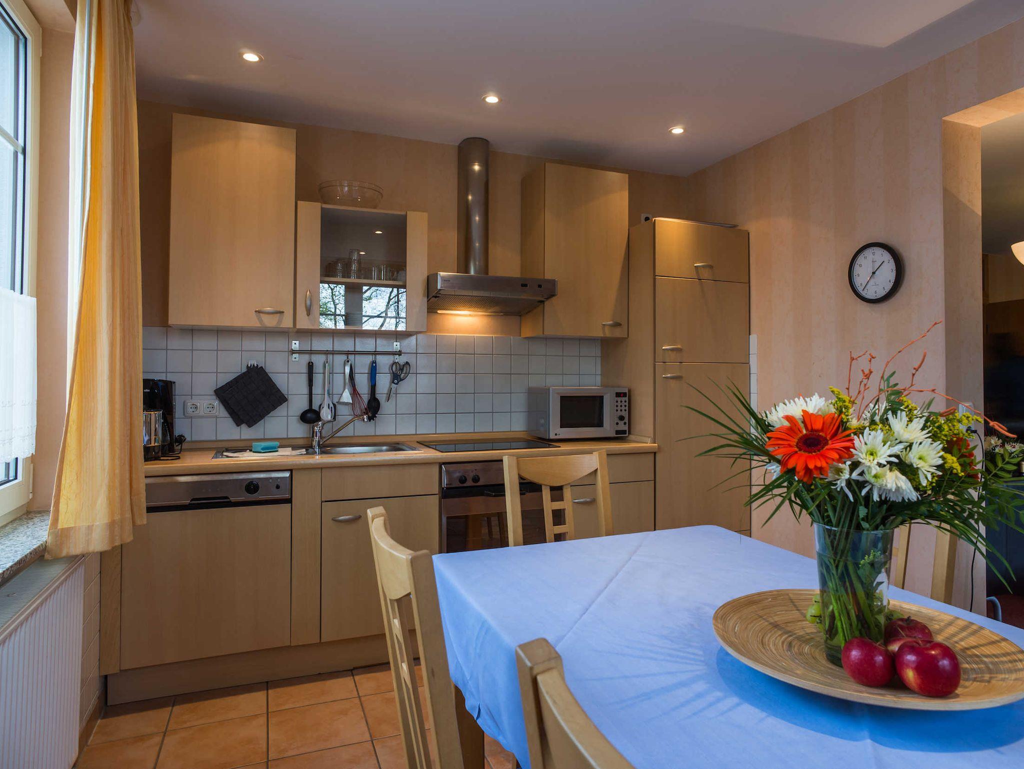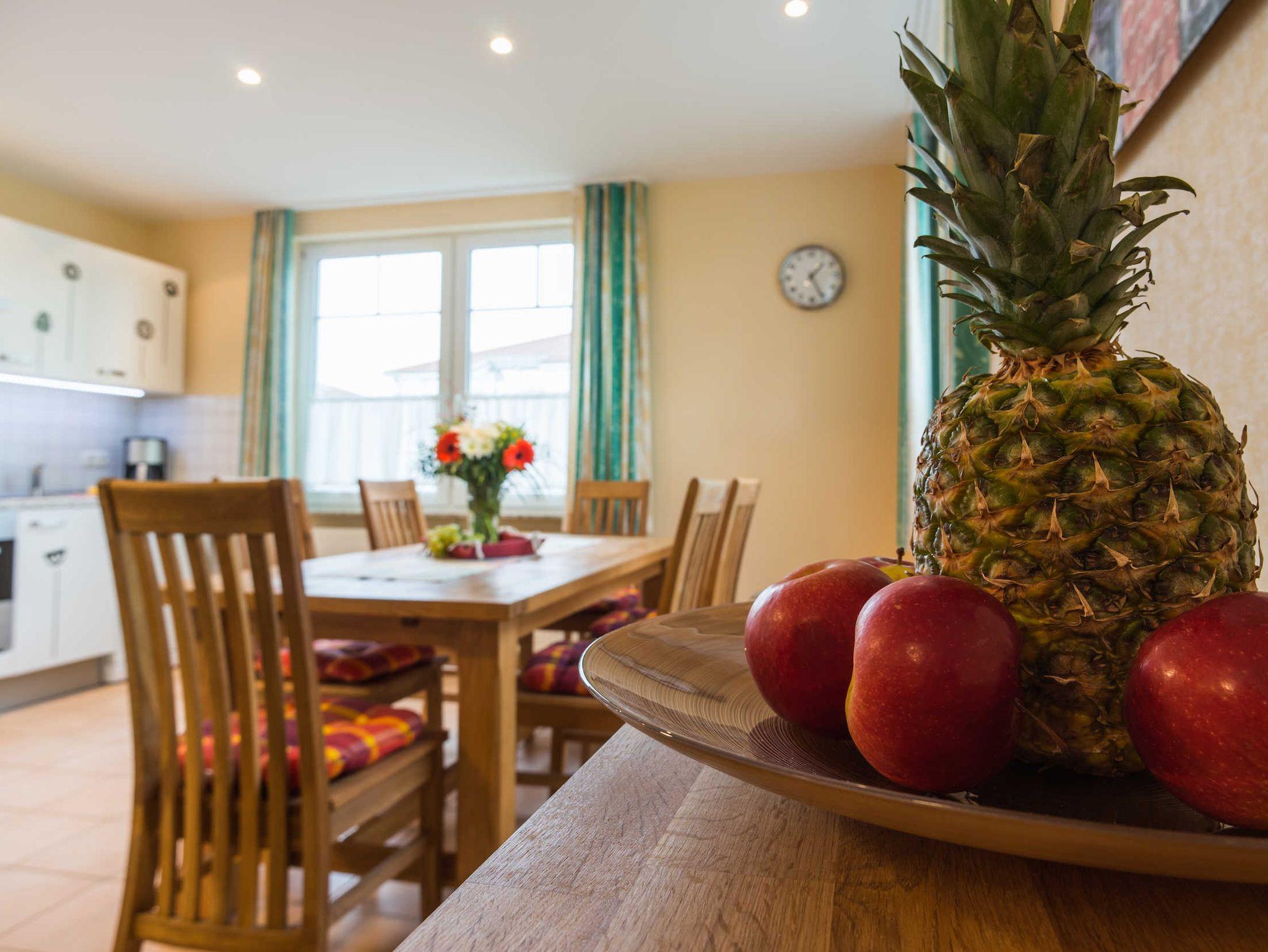 Direkt an den Wohnbereich gliedert sich die voll ausgestattete Küche mit Backofen & Herd, Kühlschrank, Spülmaschine und einem Essplatz mit sechs Plätzen an.