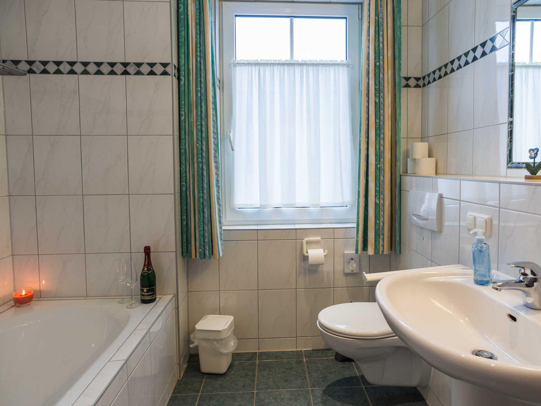 Im Badezimmer befindet sich ein WC, eine Dusche und eine Badewanne. Zusätzlich gibt es in der Wohnung noch ein Gäste-WC.