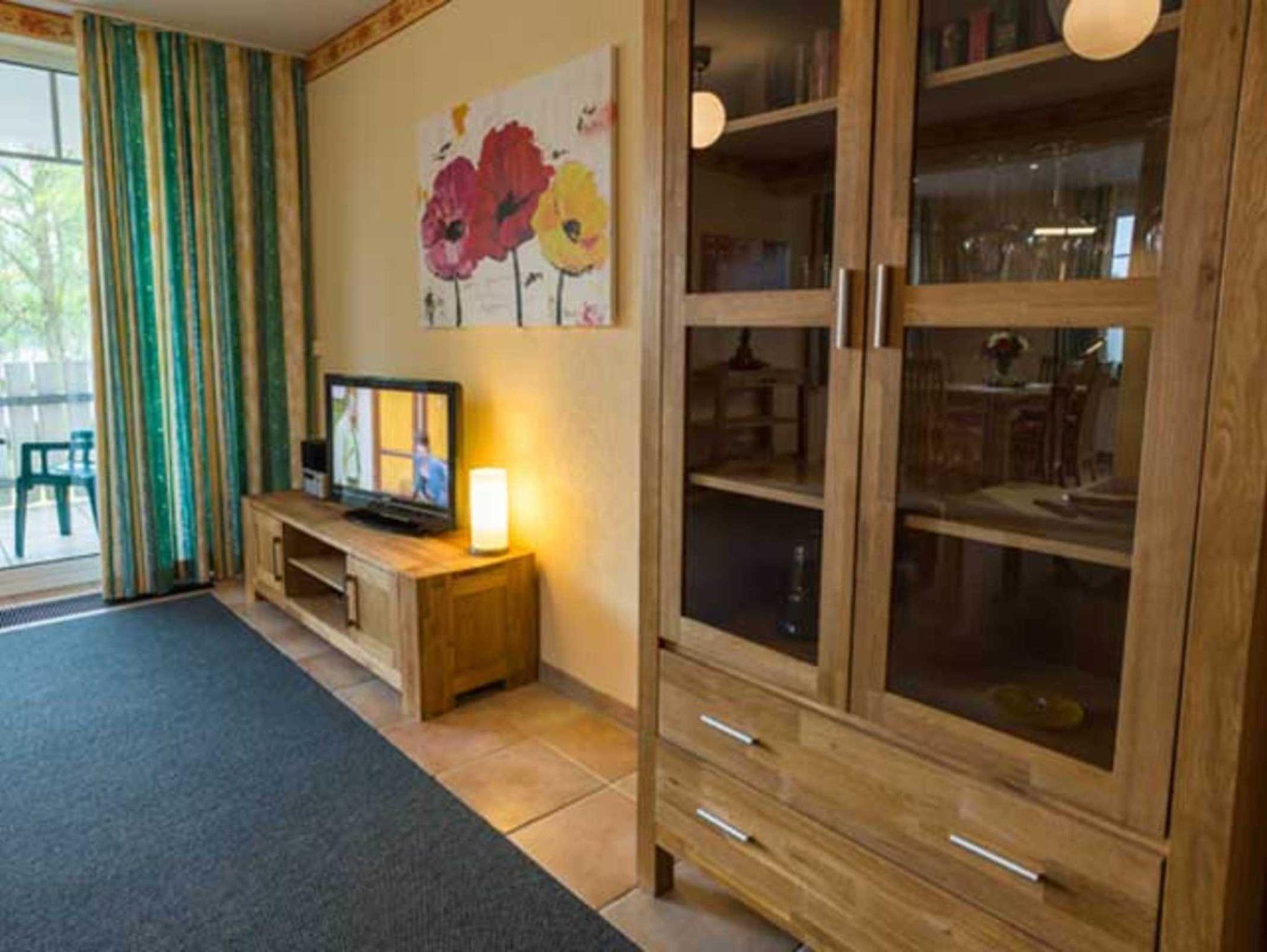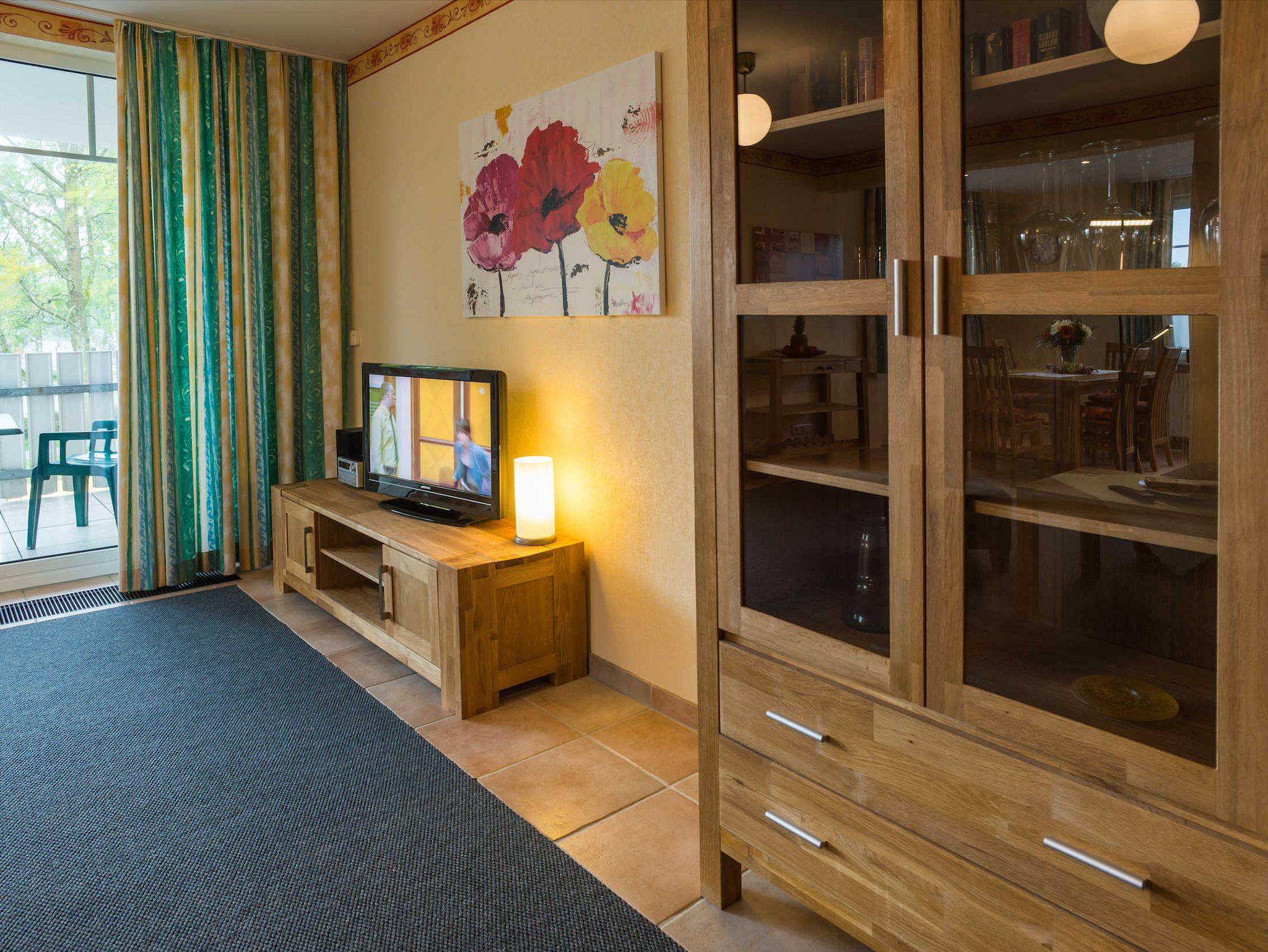 Vom Wohnungseingang kommen Sie durch den Flur direkt ins Wohnzimmer, mit einer bequemen Couch sowie Fernseher und Stereoanlage. Seine große Fensterfront zeigt nach Süden und so lädt der Balkon Sie direkt zum verweilen ein. Vom Balkon aus, können Sie entlang der Strandstraße, über den Strandvorplatz bis hin zur Ostsee blicken.
