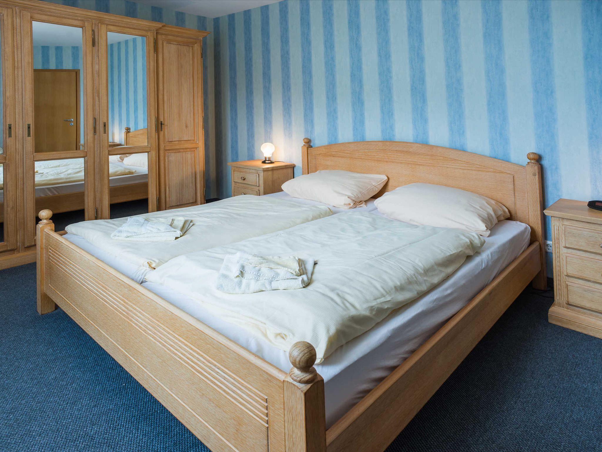 Die beiden Schlafzimmer sind mit einem Doppelbett (2mal 90/200) bzw. Einzelbetten (90/200) und Schrank ausgestattet und sind von der Straße abgewandt.
