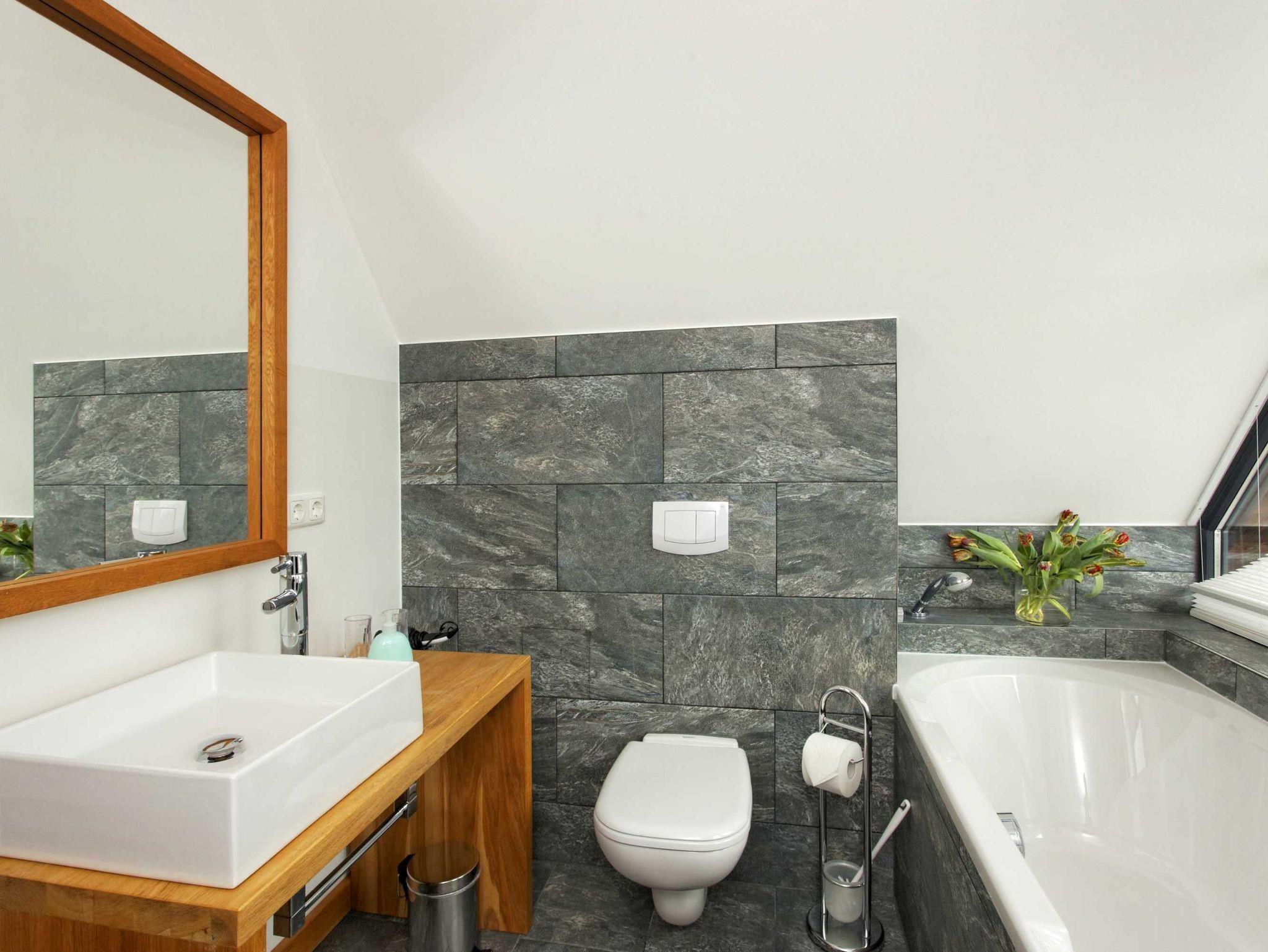 • Badezimmer mit Wanne/Dusche und WC (Wanne mit Blick ins Grüne)