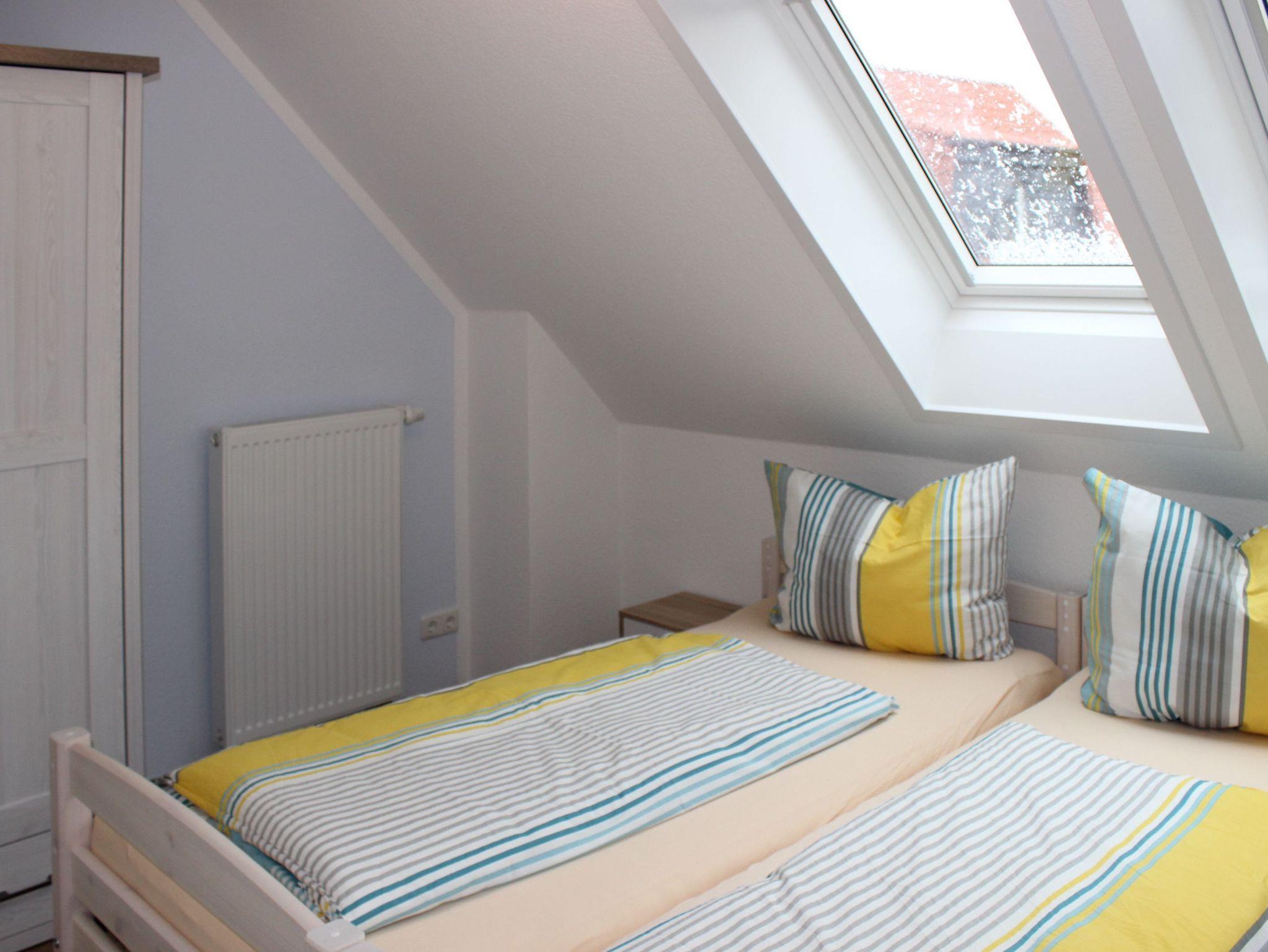 Highlight der Fewo Anna: Sie ist mit 58 m² die größte der Fewos und die beiden Schlafräume im Obergeschoss sind recht großzügig geschnitten. Im Schlafzimmer der Eltern gibt es ein festes Kinderbett.