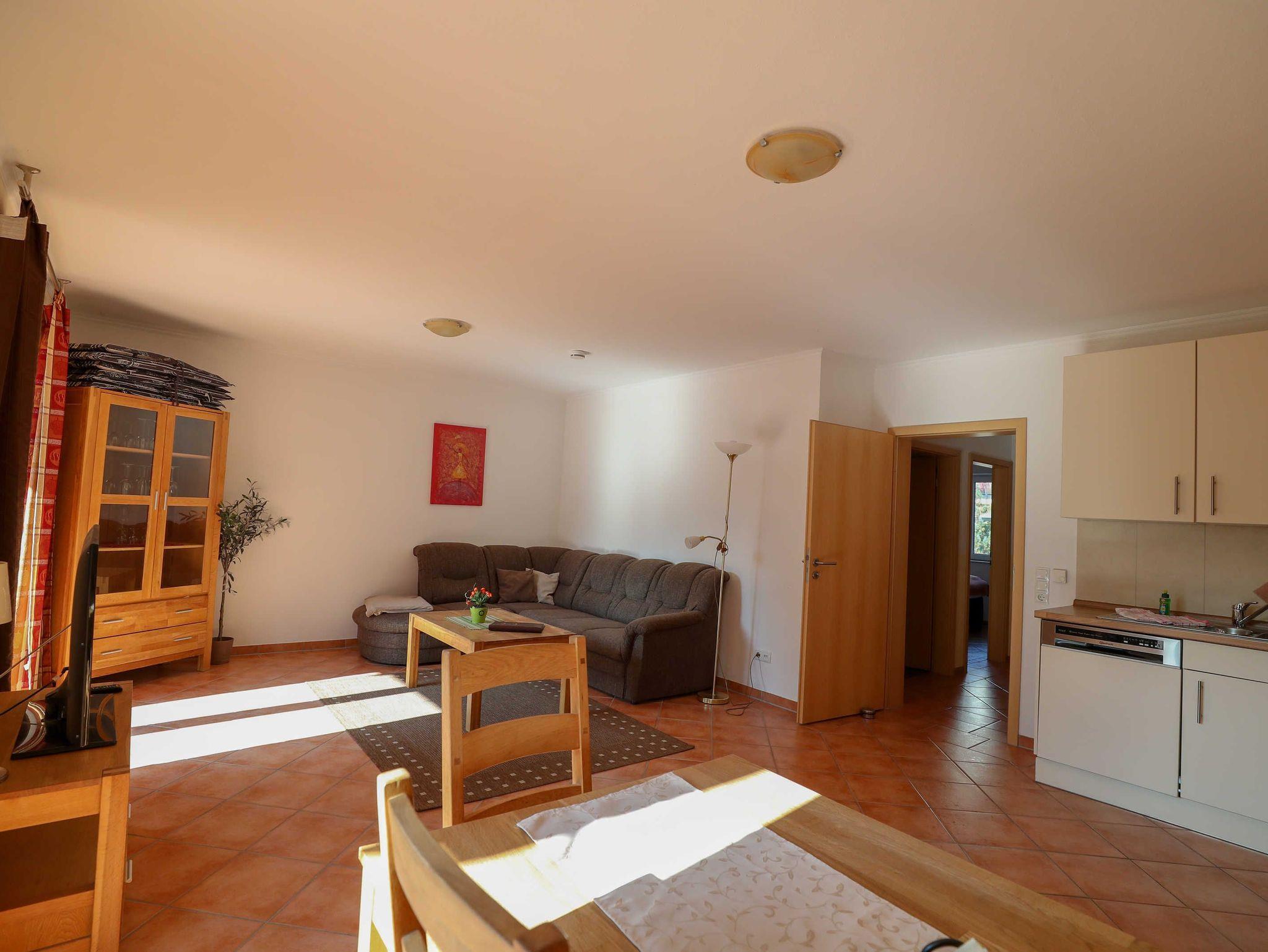 Im geräumigen Wohnzimmer steht eine gemutliche Doppel-Couch, ausserdem ist im Wohnzimmer eine vollausgestattetet Küche(mit Mikrowelle) sowie ein Esszimmertisch für vier Personen integriert.