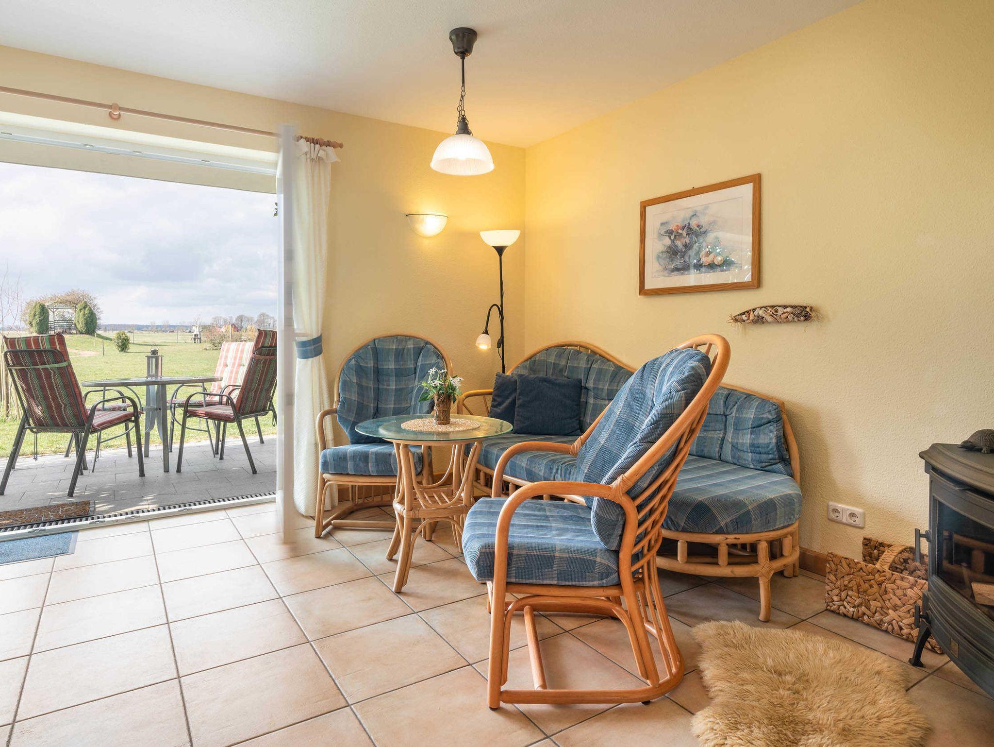 Die Wohnung ist sehr gemütlich mit Rattanmöbeln und Kaminofen eingerichtet, sowie mit reichlicher Küchenausstattung für Selbstversorger. Die Wohnung ist ohne Stufen erreichbar.