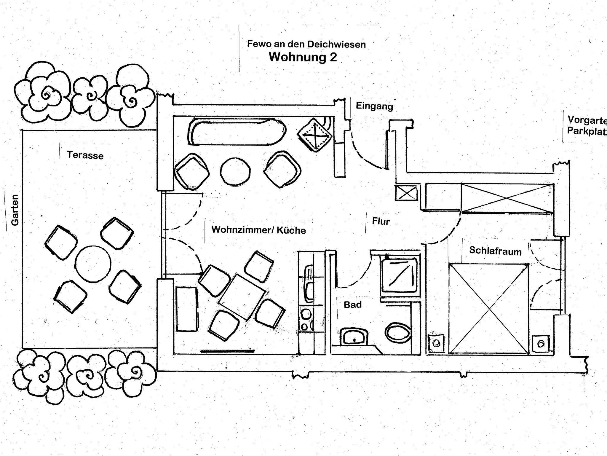 Die 2-Raum-Ferienwohnungen 01,02,05 und 06 befinden sich im Erdgeschoss und verfügen alle über eine Terrasse zum Garten.