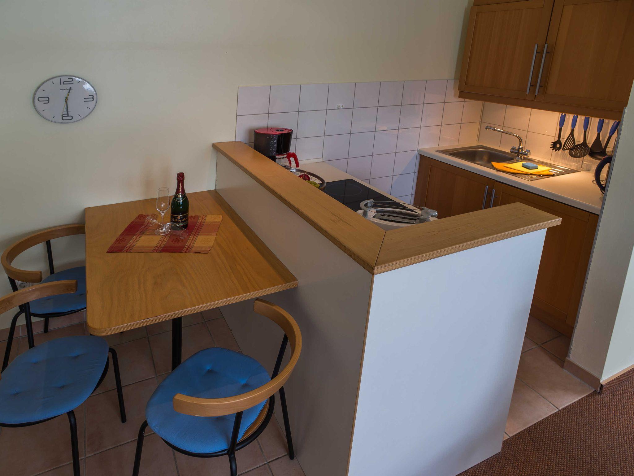 Im Küchen- und Essbereich finden Sie eine kleine Küchenzeile mit Backofen, Herd, Kühlschrank, Kaffeemaschine, Geschirr und zudem einen Esstisch mit 3 Plätzen.