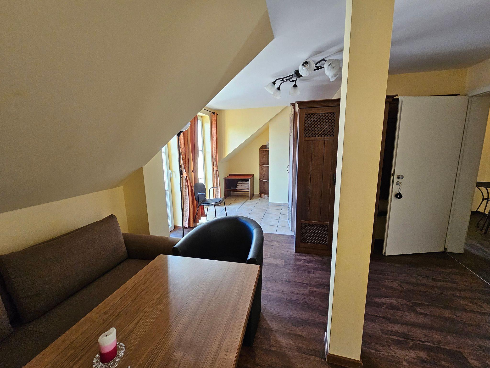 Das attraktive Ferienappartement im 2.OG besteht aus einem Schlaf- und einem Wohnraum mit Kamin und Balkon. Aus dem Schalfzimmer hat man teilweise einen Blick auf die Ostsee. Die Küche ist ausgestattet mit Geschirrspüler, Herd mit Ceranfeld, Mikrowelle mit Grill- und Backfunktion, Kühlschrank, Toaster und Kaffeemaschine. Im Wohnraum befindet sich ein Mediencenter mit SAT-TV, Radio und DVD-Spieler. Sie können die Mahlzeiten entweder im Restaurant im EG oder auf dem eigenen Balkon genießen. Neben dem Doppelbett im Schlafzimmer kann die Schlafcouch im Wohnzimmer zur Aufbettung genutzt werden. Der Boden ist mit Fußbodenheizung ausgestattet und mit Design-Vinyl Bodenbelag oder Fliesen belegt.