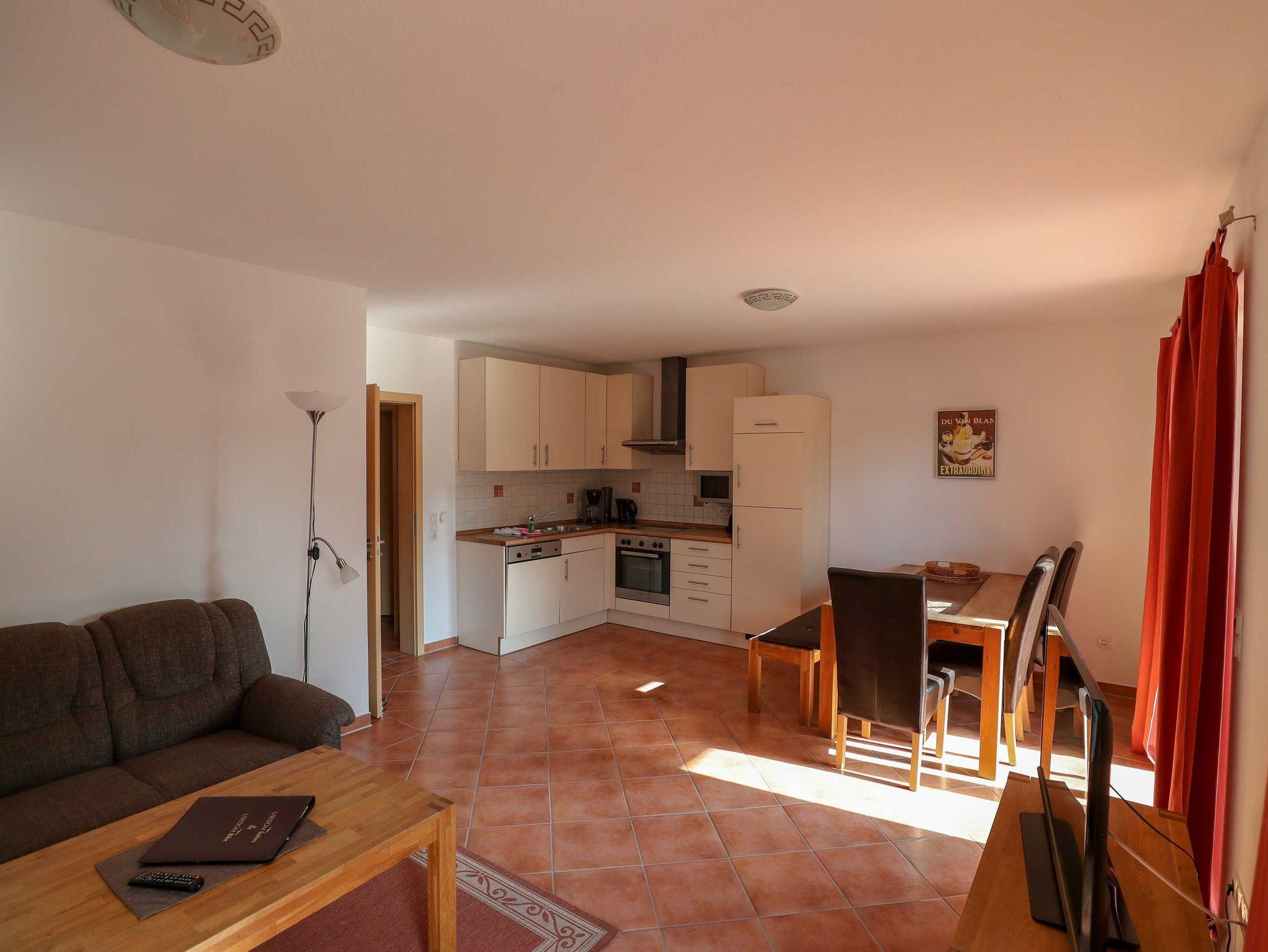 Im Wohnzimmer steht eine gemutliche Doppel-Couch, in diesem Raum ist eine vollausgestattetet Küche (mit Mikrowelle) und einem Esszimmertisch für vier Personen integriert.