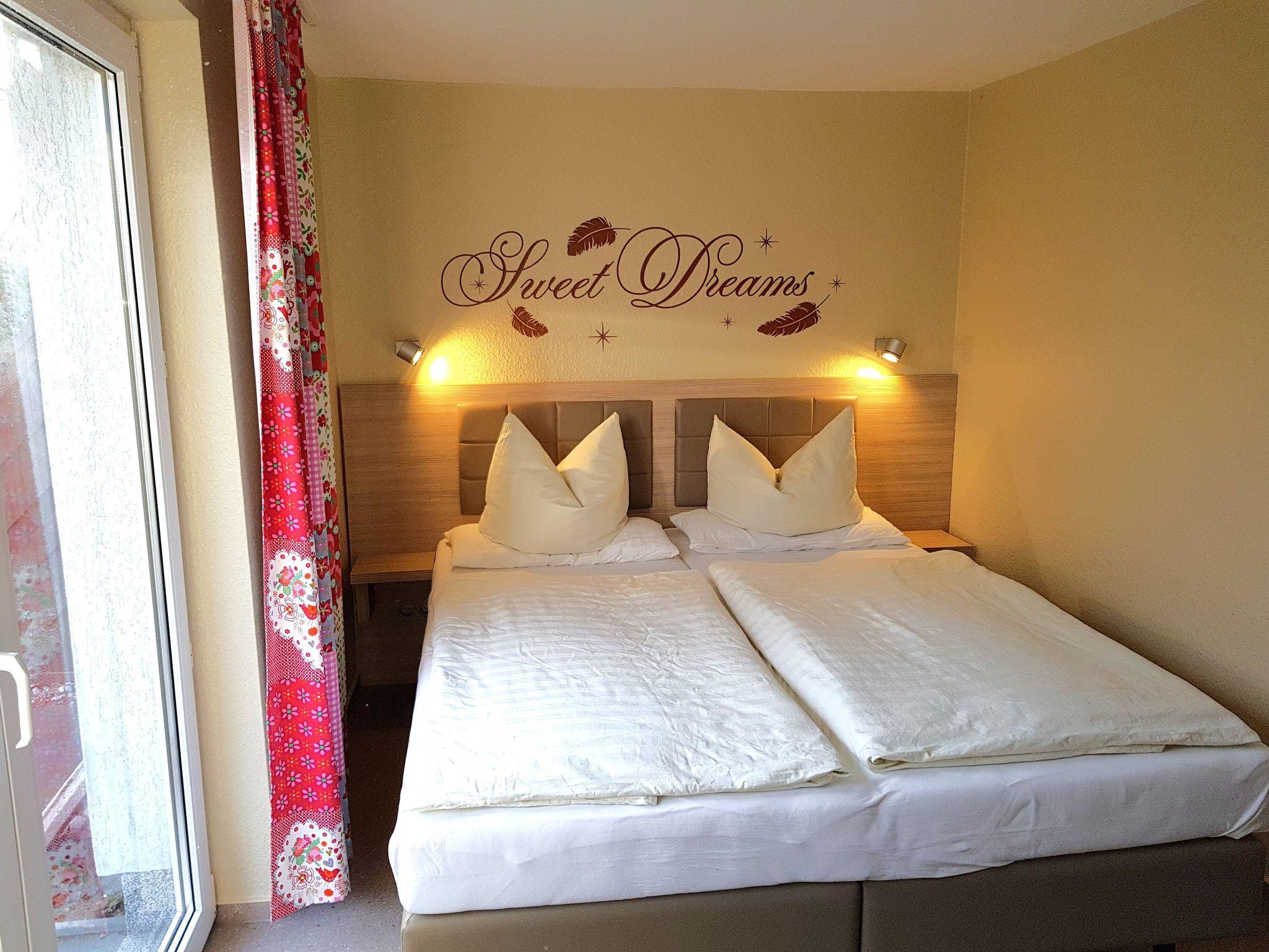 Sie wohnen in einer komplett ausgestattetem 25 m² 2-Raum-Ferienwohnungen mit hellen Möbeln. Die 2-Zi.-Wohnungen sind für 2 Personen und 1 Kind bis 12 Jahre ausgelegt und haben: ? 1 Wohnraum ? 1 Schlafzimmer, 2 Betten (Aufbettung im Wohnzimmer möglich), ? Dusche/WC ? Küchenzeile ? TV, ? Möblierte Terrasse, Liegewiese ? Parkplatz am Haus