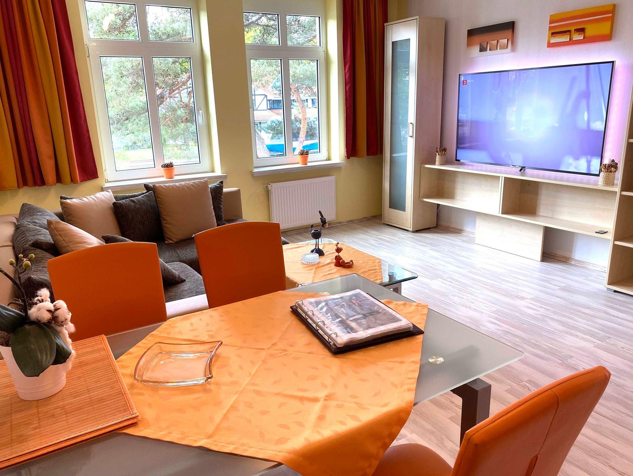 • Wohnraum mit Schlafcouch , TV, Esstisch für 4 Personen,