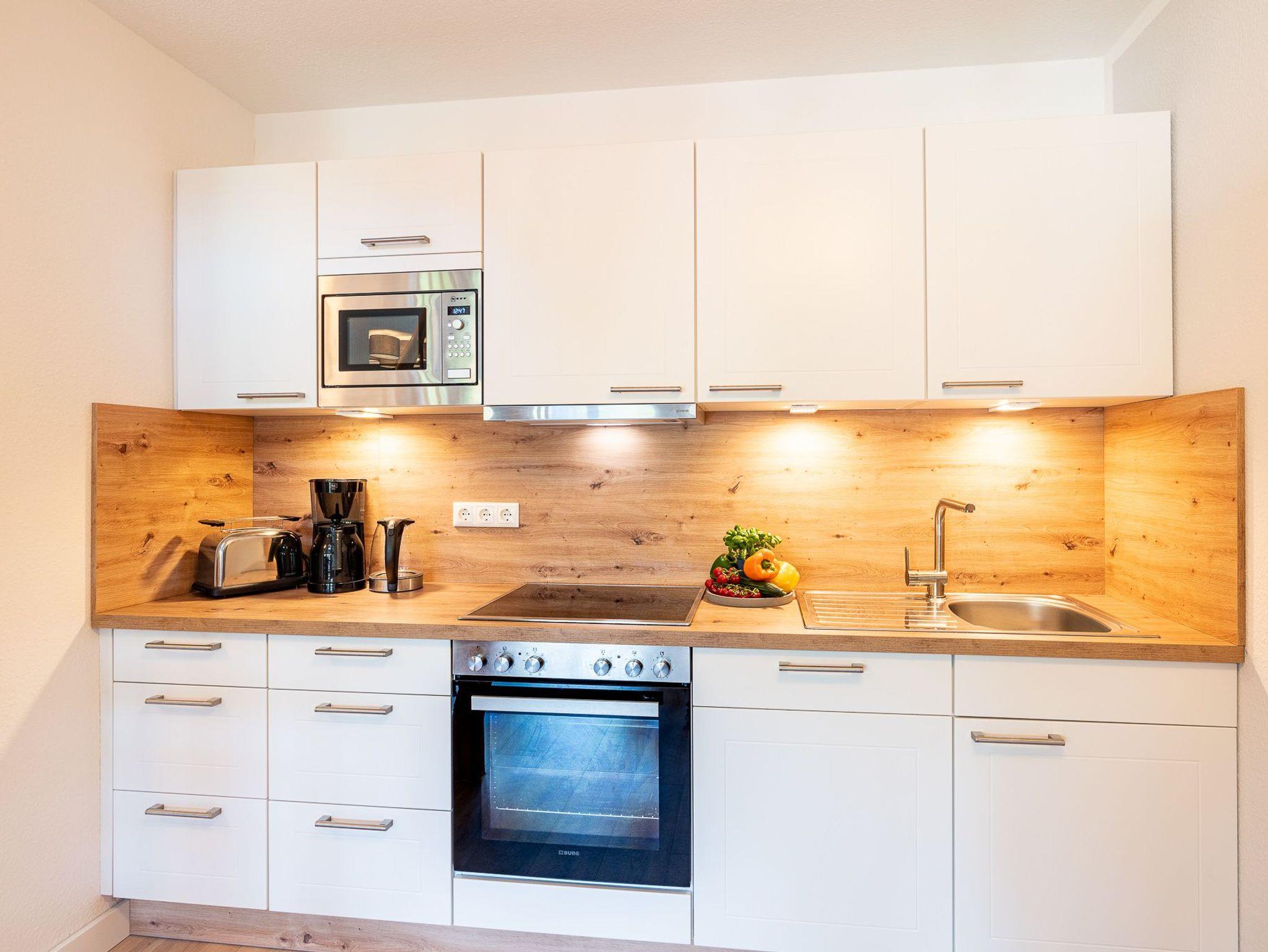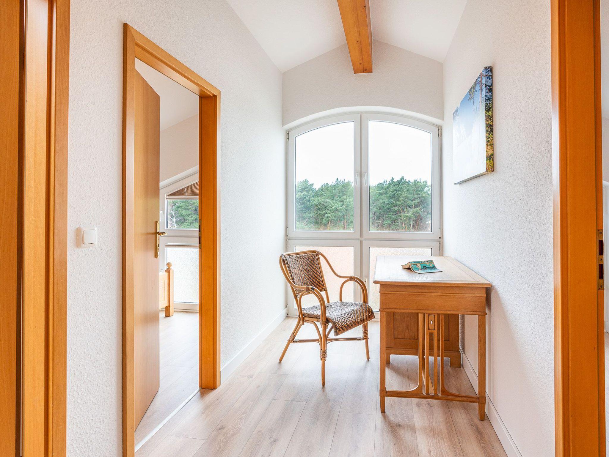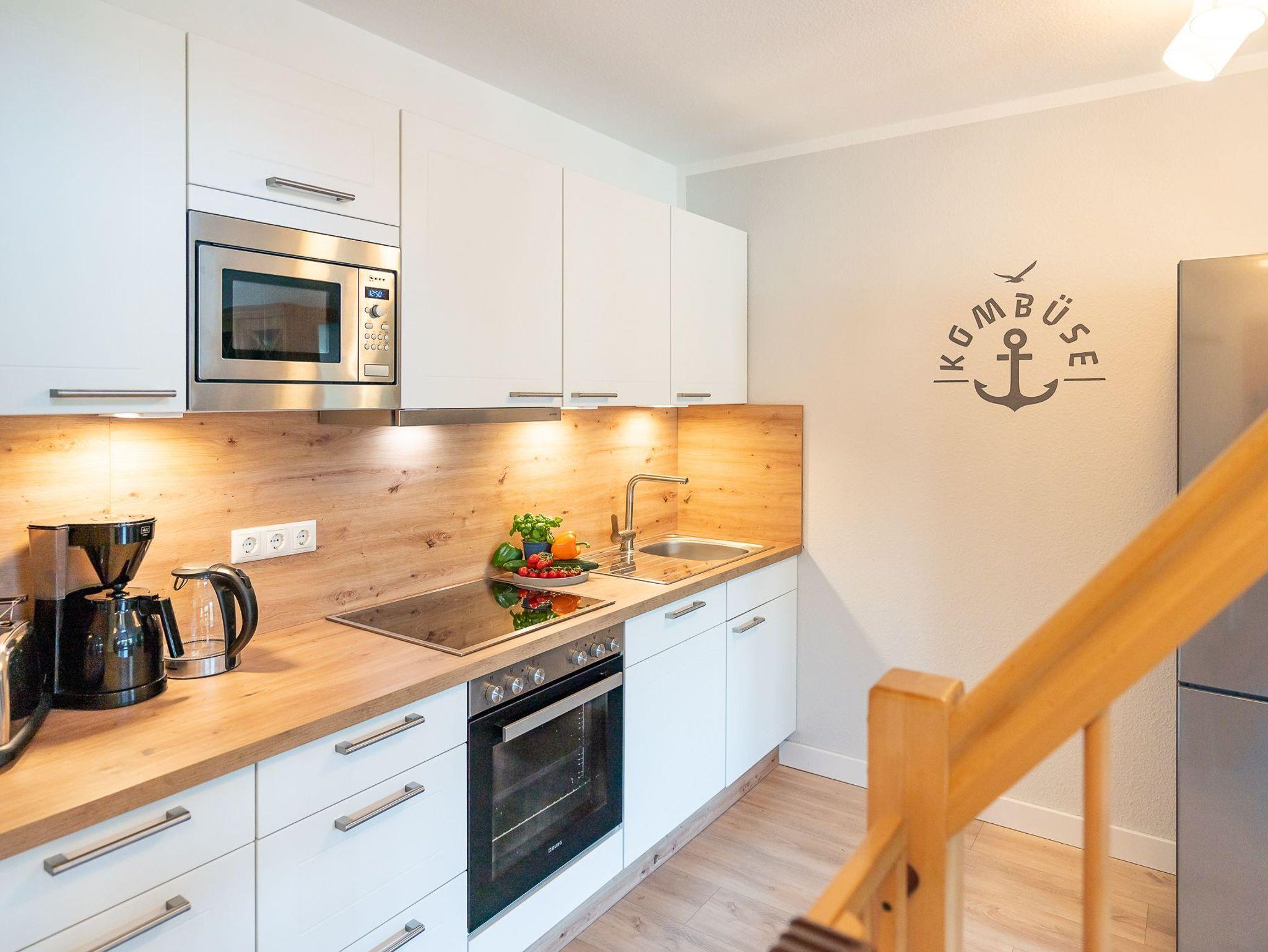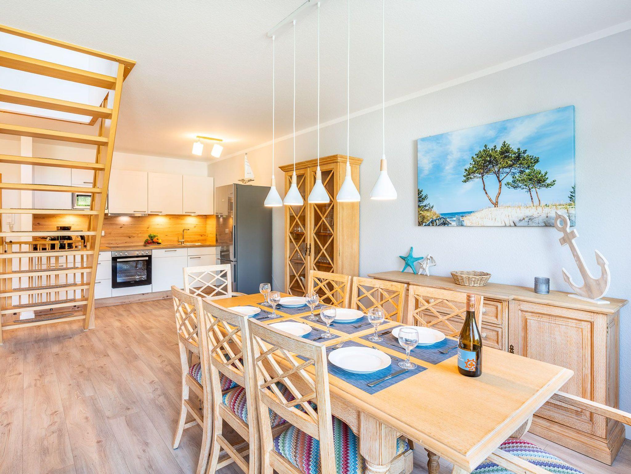 Die Wohnung erstreckt sich über 2 Etagen und ist für bis zu 8 Personen geeignet (6Pers. + 2Aufbettungen). In der unteren Etage sind ein Wohnraum mit komplett eigerichteter Küche und ein Bad. In der oberen Etage befinden sich drei Schlafzimmer und ein weiteres Badezimmer.