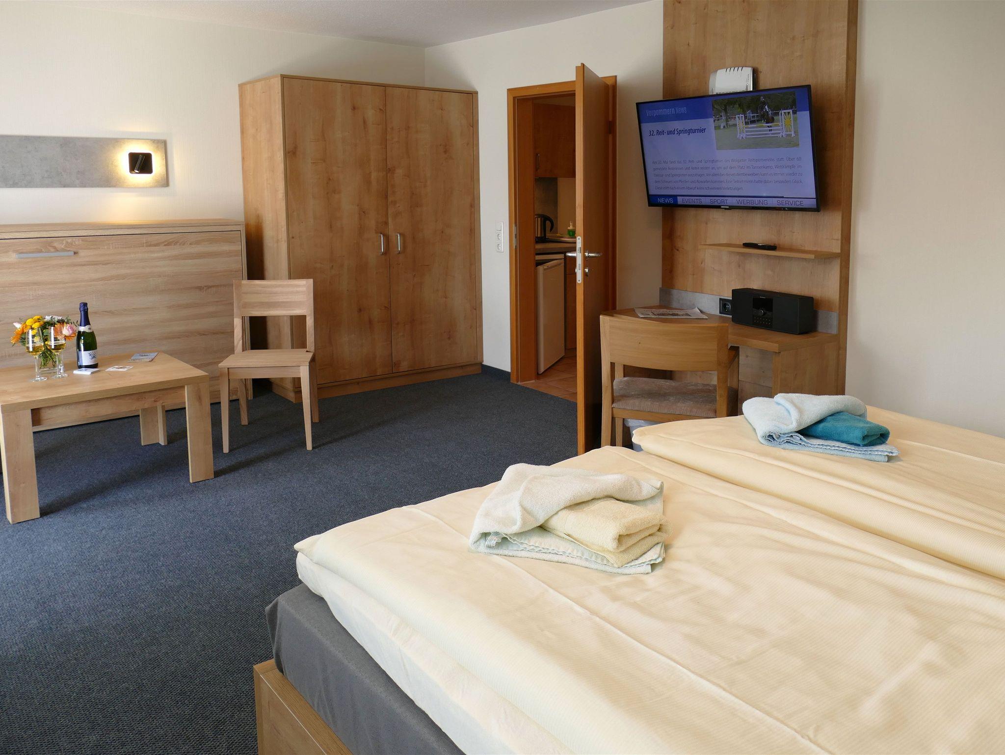 • Großes Doppelzimmer (Familienzimmer) mit Schlafbereich, kleiner Küchenblock im Eingangsbereich, 1 Bad