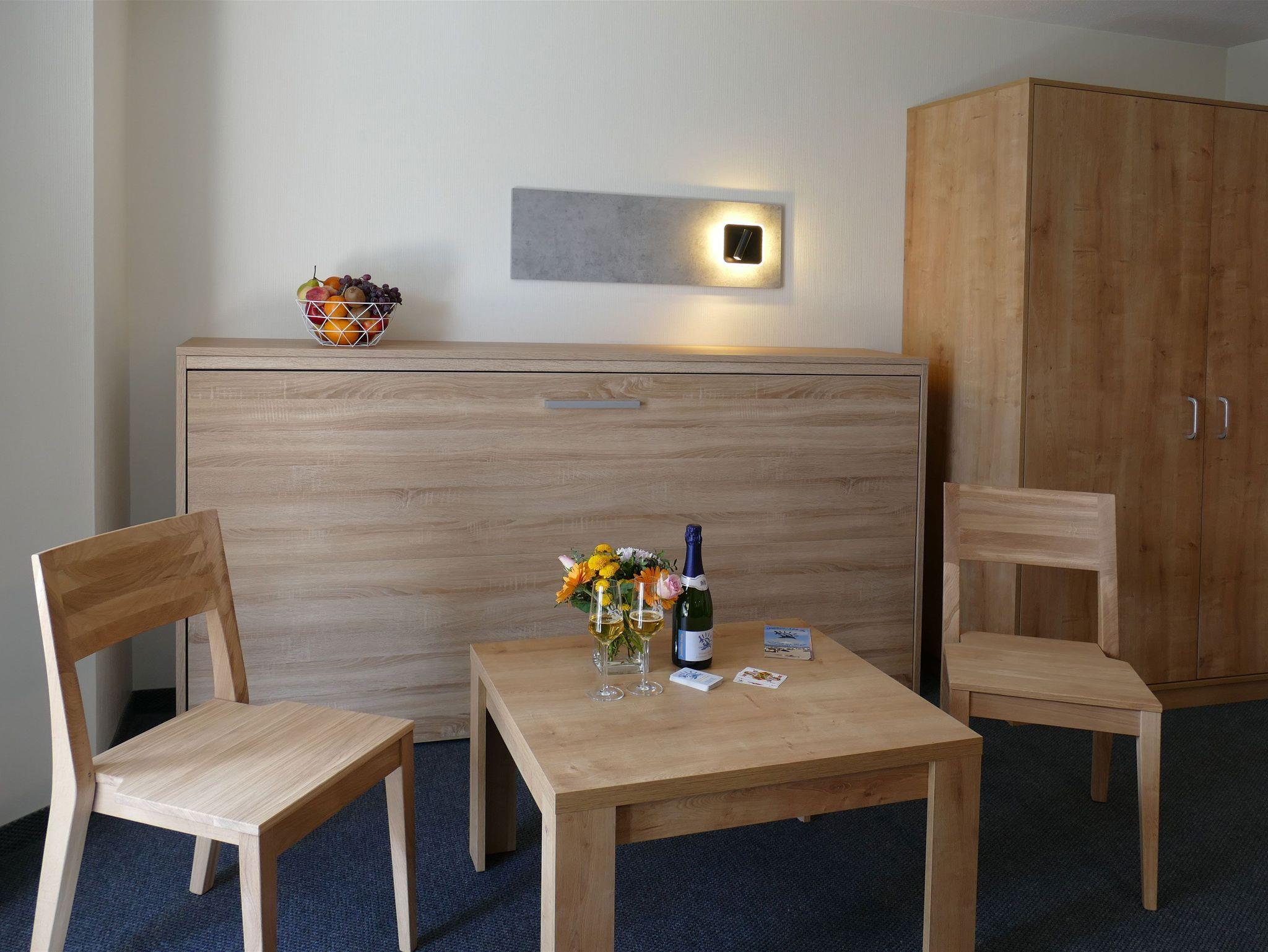 Im Flurbereich steht Ihnen ein kompakter Küchenblock mit Kühlschrank, Kaffeemaschine, Wasserkocher und Geschirr zur Verfügung ideal, um sich zwischendurch kleine Mahlzeiten selbst zuzubereiten. Eine Garderobe sowie zusätzliche Ablagemöglichkeiten sorgen für Ordnung und Bequemlichkeit während Ihres Aufenthalts.
