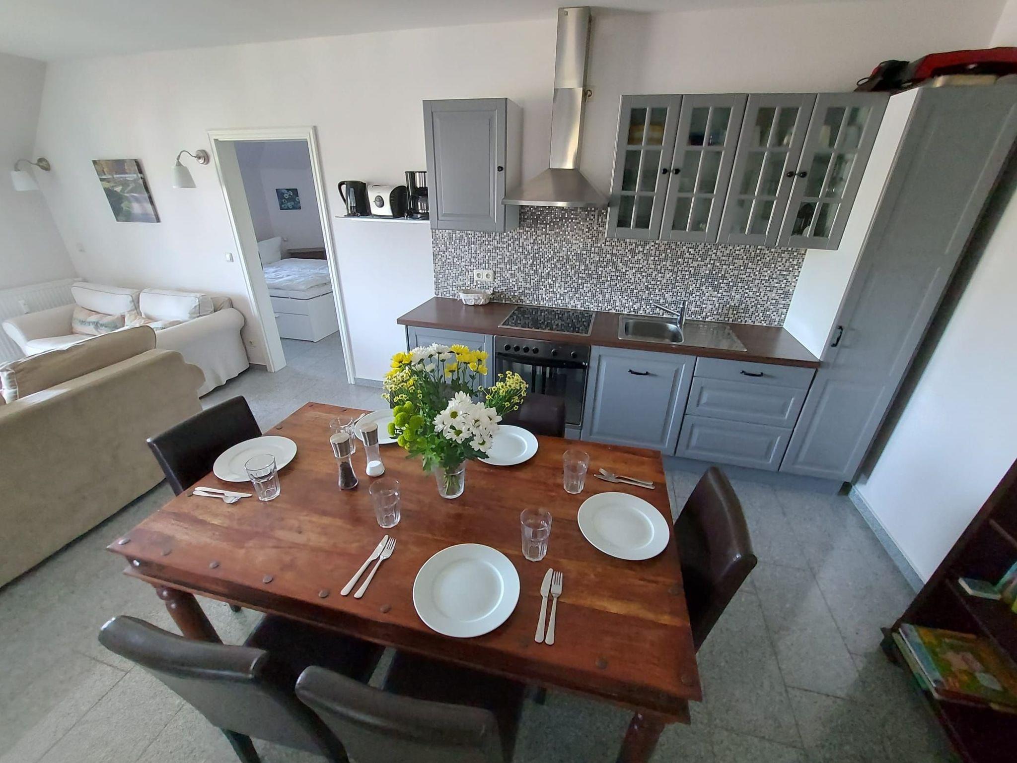 Die Maisonettewohnung verfügt über einen Balkon mit Panoramablick, einen offenen Wohn- und Küchenbereich mit großem Esstisch und einer gut ausgestatteten Küche mit Geschirrspüler, Ceranfeld, Backofen, Kühlschrank, Kaffeemaschine, Mikrowelle, Wasserkocher, Saftpresse und Toaster.