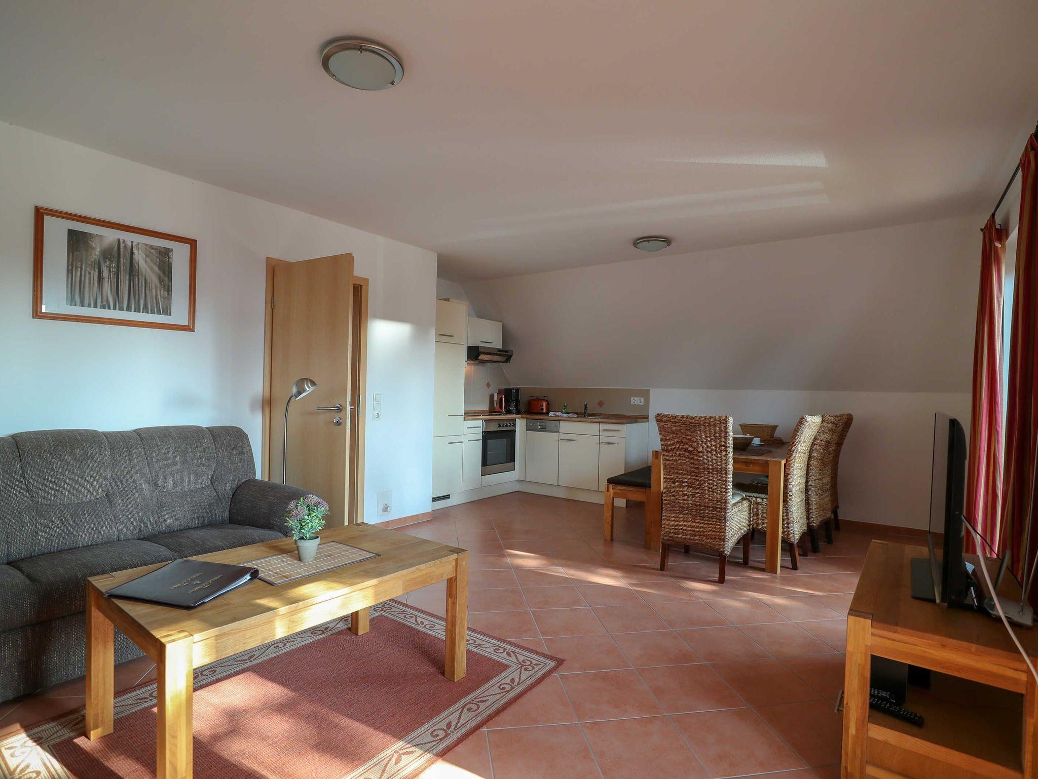 Direkt am Wohnzimmer ist der Balkon. Im Wohnzimmer befindet sich ein großes Sofa, eine Ess-Ecke sowie eine Pantryküche (mit Mikrowelle) Das Bad ist mit Dusche und einem Handtuch-Heizkörper ausgestattet.
