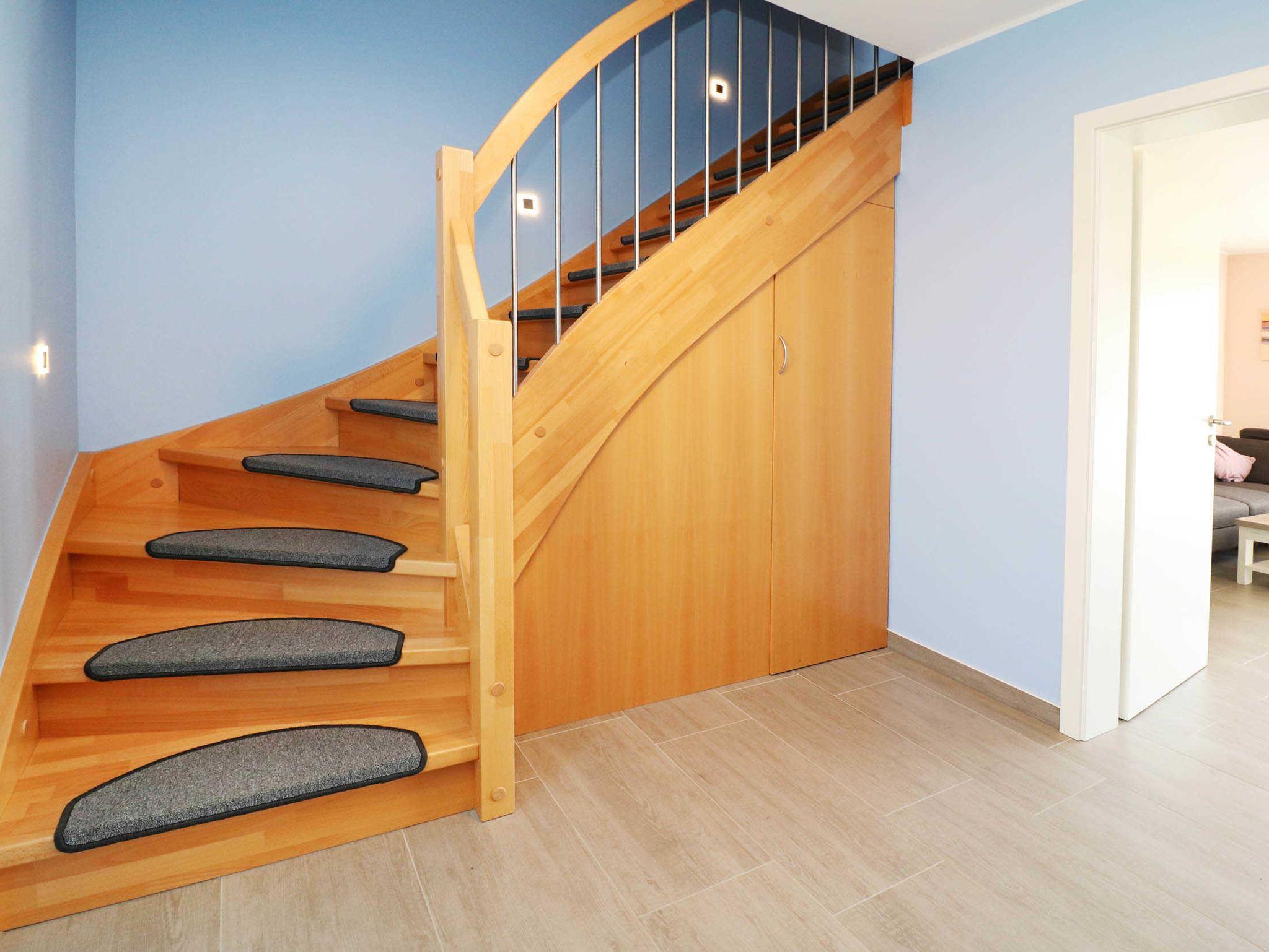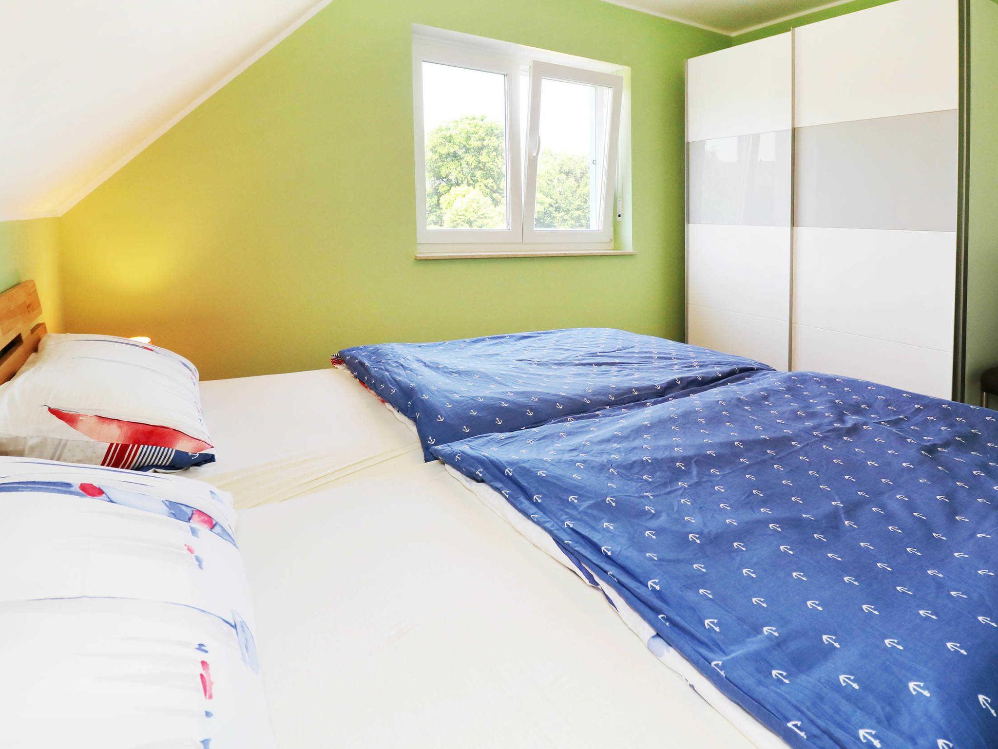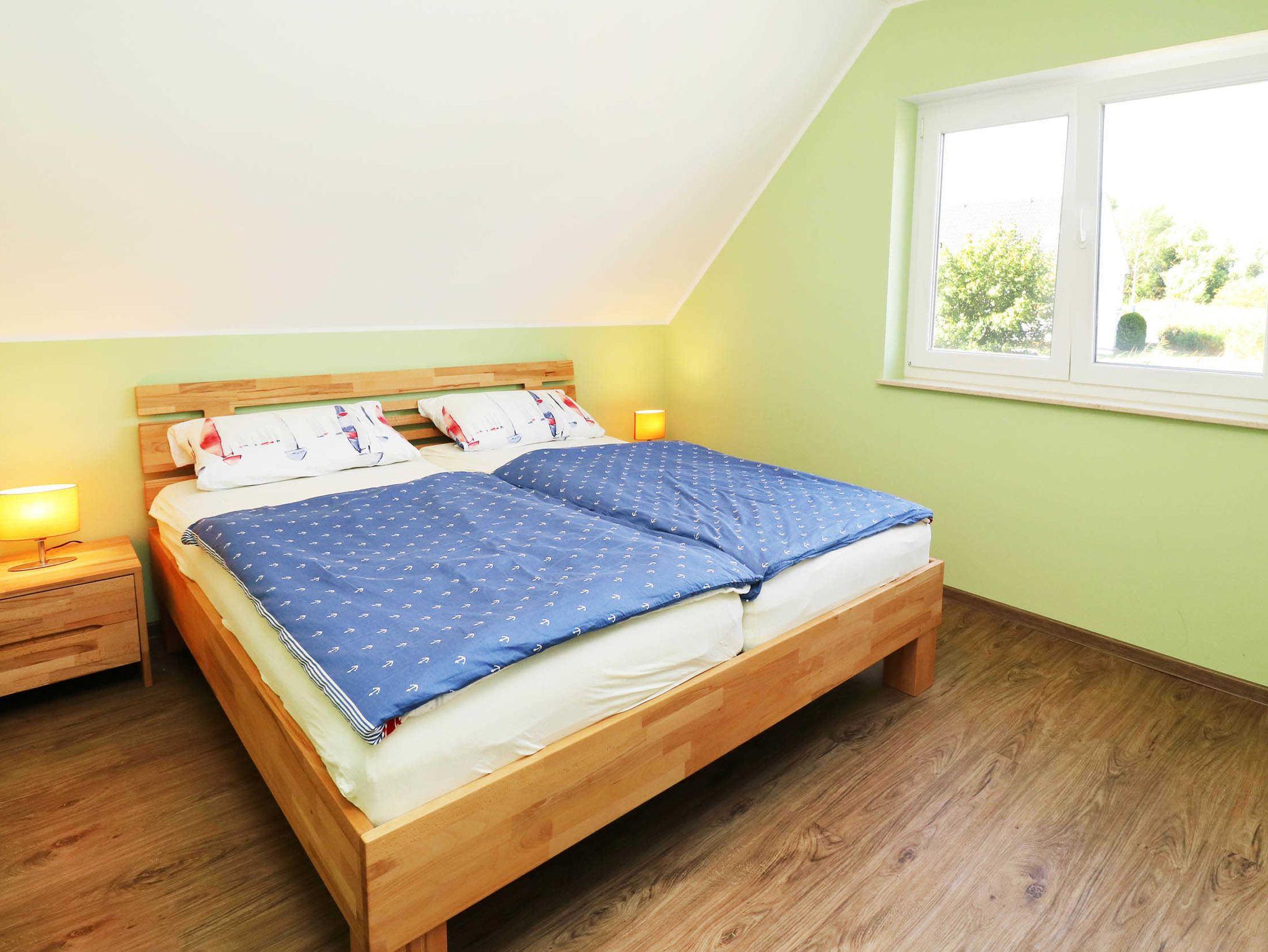 Die Schlafzimmer, sowie ein Bad mit Dusche und Sauna, befinden sich im oberen Bereich. Im ersten Schlafzimmer befindet sich ein Doppelbett ( 2 x 90 x 200 ) mit Platz für ein Kinderbett, im zweiten ein Etagenbett (jeweils 90 x 200 ). Ich Wohnzimmer besteht durch eine Schlafcouch die Möglichkeit einer Aufbettung gegen Gebühr, für 2 weitere Personen.