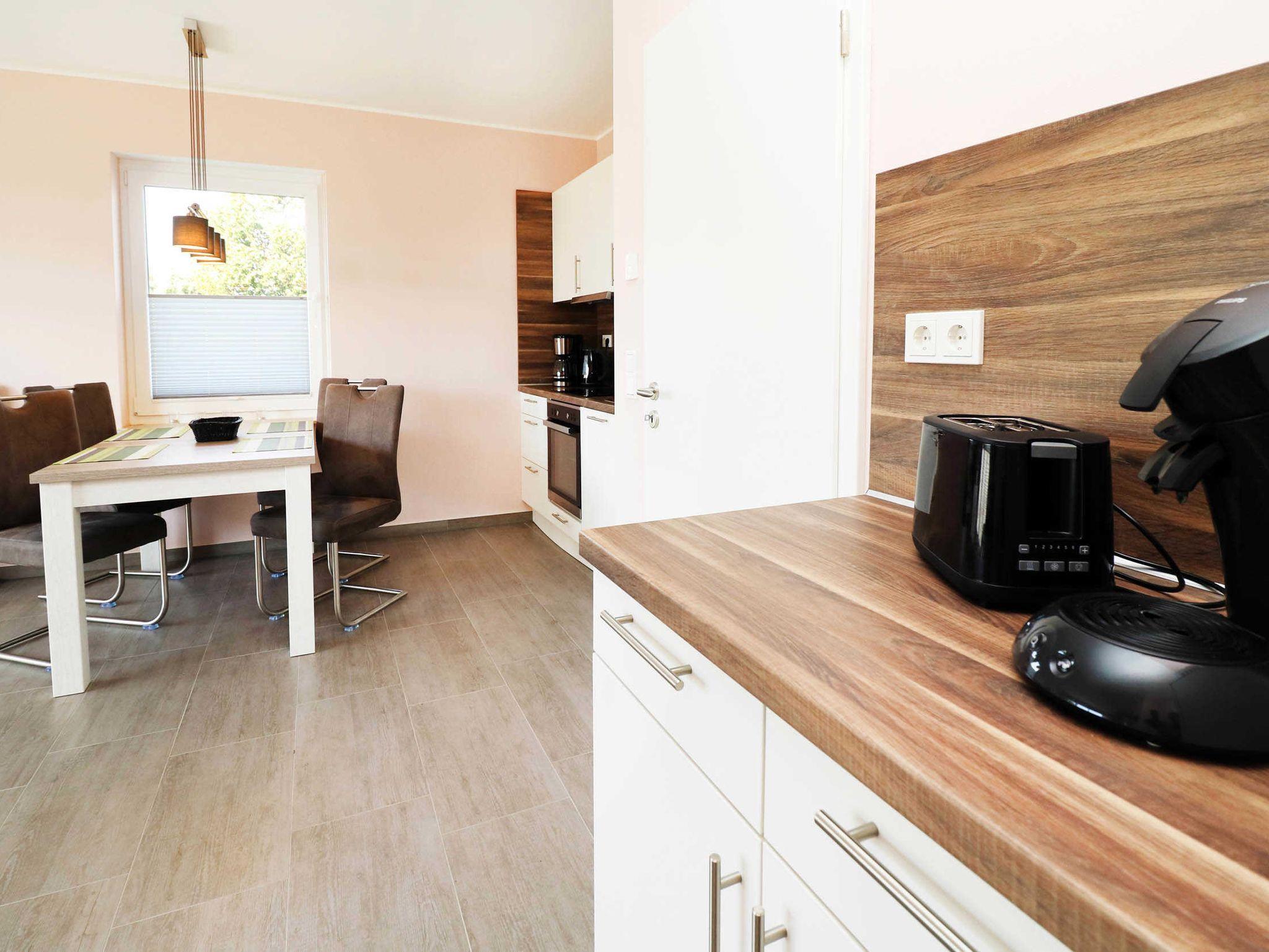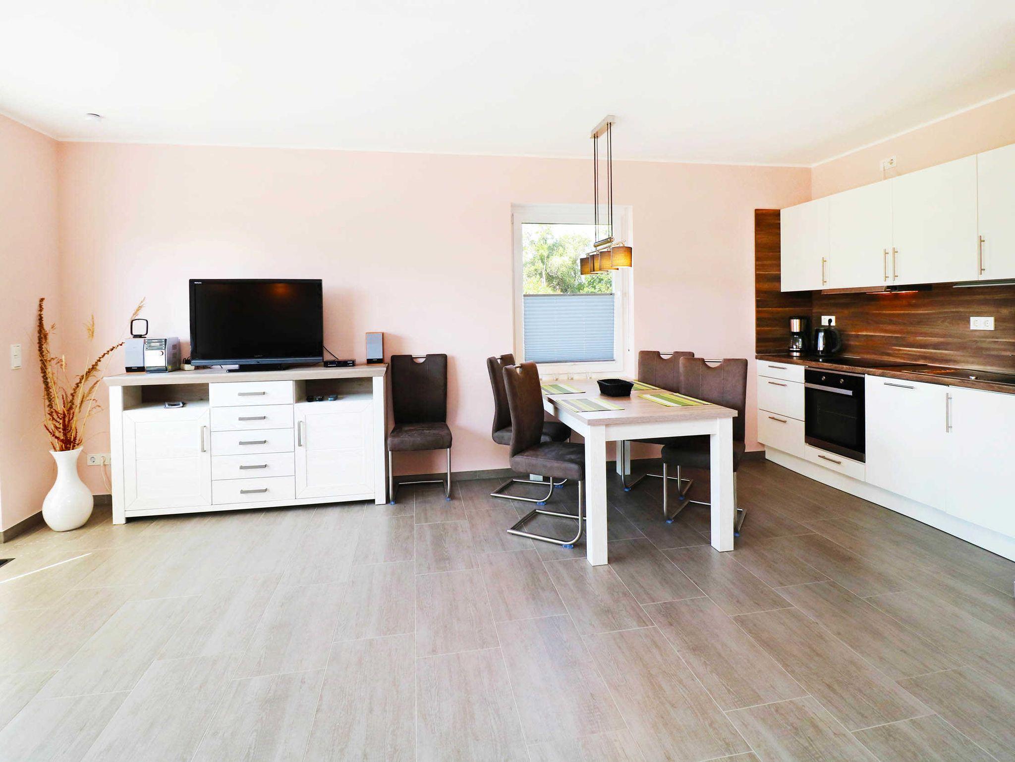 In dem Wohnzimmenr gehen der Essbereich mit komplett ausgestatteter Küche, fließend ineinander über.