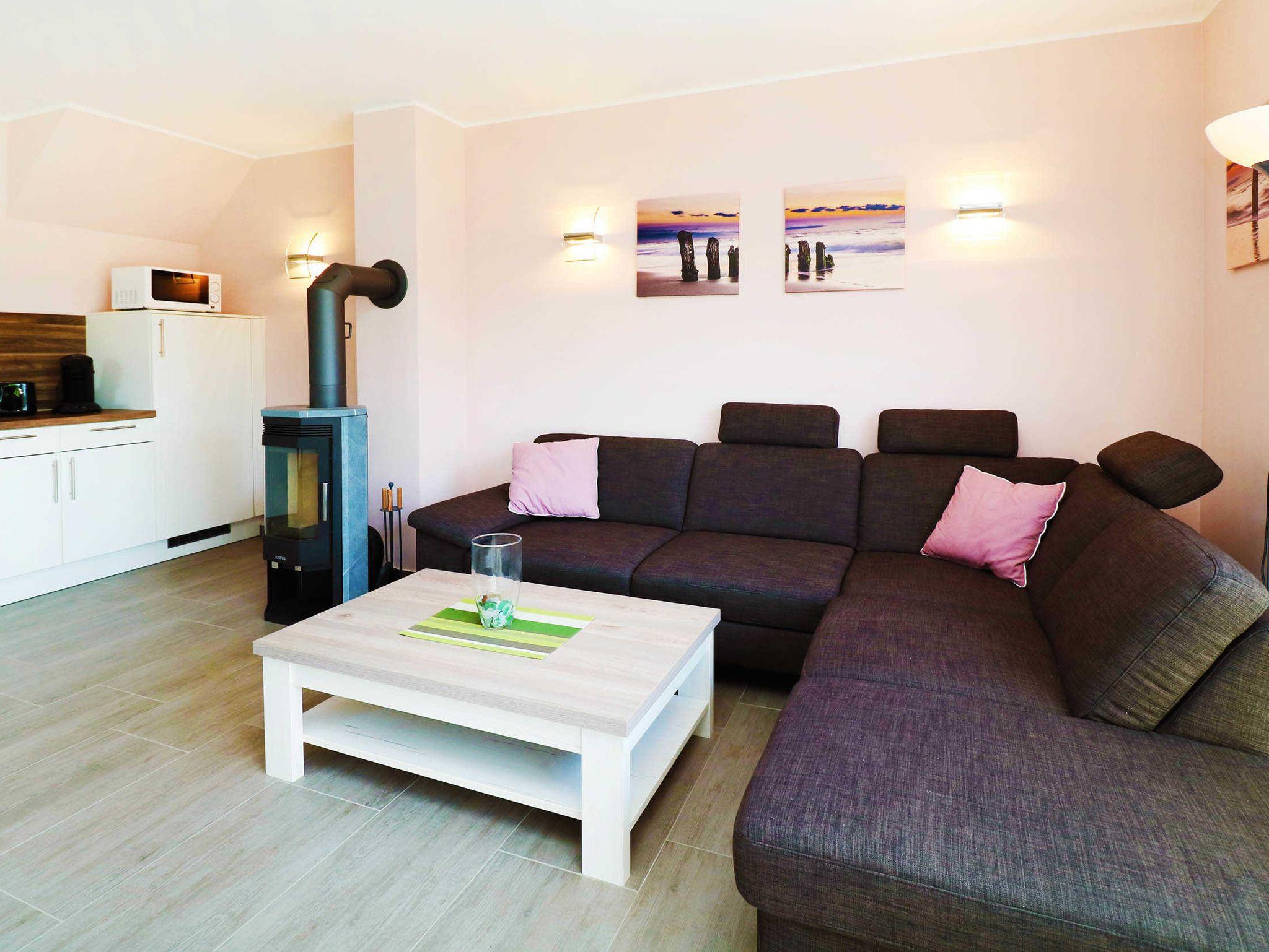 Das Wohnzimmer verfügt über eine Couchgarnitur mit Tisch und einem Kaminofen.