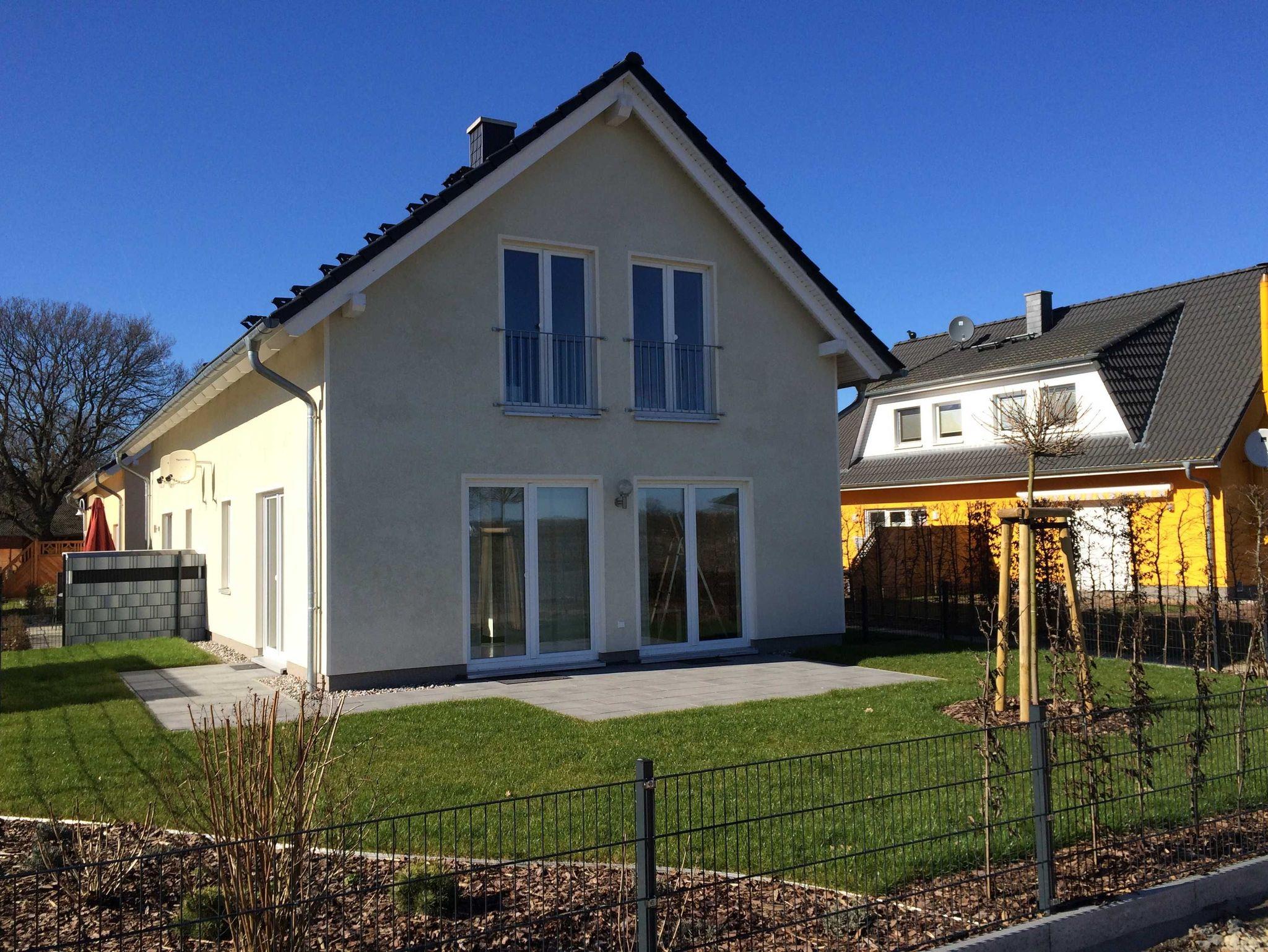 Im Erdgeschoss befindet sich das Wohnzimmer mit offener Küche und der Essbereich, sowie ein Gäste-WC mit Dusche. Vom Wohnzimmer aus kann die zur Sonnenseite ausgerichtete Terrasse betreten werden. In der oberen Etage liegen die Schlafzimmer und das Bad mit Badewanne.